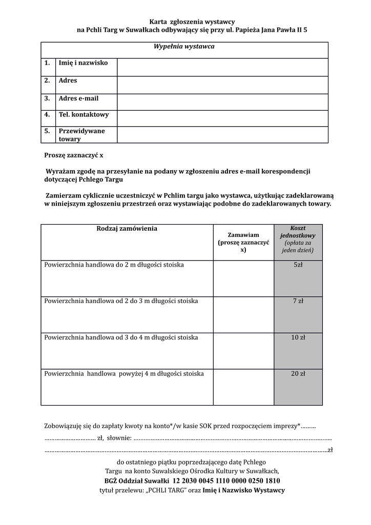 Karta zgłoszenia wystawcy na Pchli Targ w Suwałkach odbywający się przy ul. Papieża Jana Pawła II 5 Wypełnia wystawca 1. Imię i nazwisko 2. Adres 3. Adres e-mail 4. Tel. kontaktowy 5. Przewidywane towary Proszę zaznaczyć x Wyrażam zgodę na przesyłanie na podany w zgłoszeniu adres e-mail korespondencji dotyczącej Pchlego Targu Zamierzam cyklicznie uczestniczyć w Pchlim targu jako wystawca, użytkując zadeklarowaną w niniejszym zgłoszeniu przestrzeń oraz wystawiając podobne do zadeklarowanych towary. Rodzaj zamówienia Zamawiam (proszę zaznaczyć x) Koszt jednostkowy (opłata za jeden dzień) Powierzchnia handlowa do 2 m długości stoiska 5zł Powierzchnia handlowa od 2 do 3 m długości stoiska 7 zł Powierzchnia handlowa od 3 do 4 m długości stoiska 10 zł Powierzchnia handlowa powyżej 4 m długości stoiska 20 zł Zobowiązuję się do zapłaty kwoty na konto*/w kasie SOK przed rozpoczęciem imprezy*……… ………………………… zł, słownie: …………………………………………………………………………………………………….. …………………………………………………………………………………………………………………………………………………zł do ostatniego piątku poprzedzającego datę Pchlego Targu na konto Suwalskiego Ośrodka Kultury w Suwałkach, BGŻ Oddział Suwałki 12 2030 0045 1110 0000 0250 1810 tytuł przelewu: „PCHLI TARG” oraz Imię i Nazwisko Wystawcy ..……………………………………………………………………. Podpis zamawiającego lub ............................................................................. Miejscowość, data *niepotrzebne skreślić Zgłoszenia kierujemy do: Suwalskiego Ośrodka Kultury, ul. Papieża Jana Pawła II 5, 16-400 Suwałki tel. 87 5638 505 [email protected]