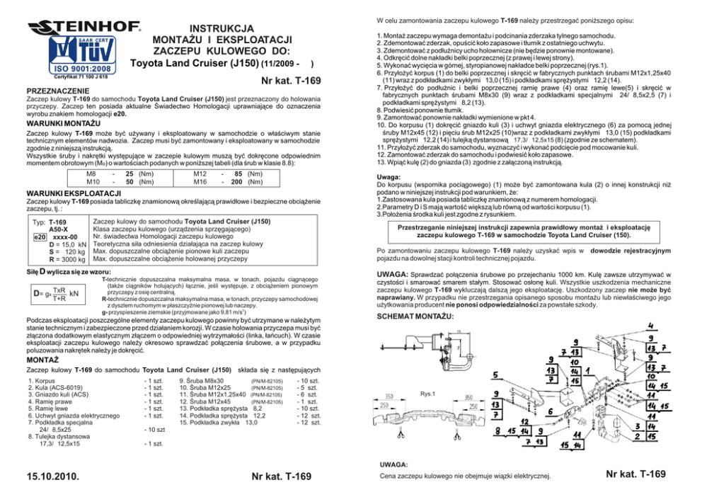 W celu zamontowania zaczepu kulowego T-169 nale¿y przestrzegaæ poni¿szego opisu: INSTRUKCJA MONTA¯U I EKSPLOATACJI ZACZEPU KULOWEGO DO: Toyota Land Cruiser (J150) (11/2009 - ®) Nr kat. T-169 PRZEZNACZENIE Zaczep kulowy T-169 do samochodu Toyota Land Cruiser (J150) jest przeznaczony do holowania przyczepy. Zaczep ten posiada aktualne Œwiadectwo Homologacji uprawniaj¹ce do oznaczenia wyrobu znakiem homologacji e20. WARUNKI MONTA¯U Zaczep kulowy T-169 mo¿e byæ u¿ywany i eksploatowany w samochodzie o w³aœciwym stanie technicznym elementów nadwozia. Zaczep musi byæ zamontowany i eksploatowany w samochodzie zgodnie z niniejsz¹ instrukcj¹. Wszystkie œruby i nakrêtki wystêpuj¹ce w zaczepie kulowym musz¹ byæ dokrêcone odpowiednim momentem obrotowym (Mo) o wartoœciach podanych w poni¿szej tabeli (dla œrub w klasie 8.8): M8 M10 - 25 (Nm) 50 (Nm) M12 M16 - 85 (Nm) 200 (Nm) WARUNKI EKSPLOATACJI Zaczep kulowy T-169 posiada tabliczkê znamionow¹ okreœlaj¹c¹ prawid³owe i bezpieczne obci¹¿enie zaczepu, tj. : Typ: T-169 A50-X e20 xxxx-00 D = 15,0 kN S = 120 kg R = 3000 kg Zaczep kulowy do samochodu Toyota Land Cruiser (J150) Klasa zaczepu kulowego (urz¹dzenia sprzêgaj¹cego) Nr. œwiadectwa Homologacji zaczepu kulowego Teoretyczna si³a odniesienia dzia³aj¹ca na zaczep kulowy Max. dopuszczalne obci¹¿enie pionowe kuli zaczepu Max. dopuszczalne obci¹¿enie holowanej przyczepy Przestrzeganie niniejszej instrukcji zapewnia prawid³owy monta¿ i eksploatacjê zaczepu kulowego T-169 w samochodzie Toyota Land Cruiser (150). Po zamontowaniu zaczepu kulowego T-169 nale¿y uzyskaæ wpis w pojazdu na dowolnej stacji kontroli technicznej pojazdu. Si³ê D wylicza siê ze wzoru: D= gx TxR kN T+R Uwaga: Do korpusu (wspornika poci¹gowego) (1) mo¿e byæ zamontowana kula (2) o innej konstrukcji ni¿ podano w niniejszej instrukcji pod warunkiem, ¿e: 1.Zastosowana kula posiada tabliczkê znamionow¹ z numerem homologacji. 2.Parametry D i S maj¹ wartoœæ wiêksz¹ lub równ¹ od wartoœci korpusu (1). 3.Po³o¿enia œrodka kuli jest zgodne z rysunkiem. T-technicznie dopuszczalna maksymalna masa, w tonach, pojazdu ci¹gn¹cego (tak¿e ci¹gników holuj¹cych) ³¹cznie, jeœli wystêpuje, z obci¹¿eniem pionowym przyczepy z osiê centraln¹. R-technicznie dopuszczalna maksymalna masa, w tonach, przyczepy samochodowej z dyszlem ruchomym w p³aszczyŸnie pionowej lub naczepy. g- przyspieszenie ziemskie (przyjmowane jako 9,81 m/s2) Podczas eksploatacji poszczególne elementy zaczepu kulowego powinny byæ utrzymane w nale¿ytym stanie technicznym i zabezpieczone przed dzia³aniem korozji. W czasie holowania przyczepa musi byæ z³¹czona dodatkowym elastycznym z³¹czem o odpowiedniej wytrzyma³oœci (linka, ³añcuch). W czasie eksploatacji zaczepu kulowego nale¿y okresowo sprawdzaæ po³¹czenia œrubowe, a w przypadku poluzowania nakrêtek nale¿y je dokrêciæ. dowodzie rejestracyjnym UWAGA: Sprawdzaæ po³¹czenia œrubowe po przejechaniu 1000 km. Kulê zawsze utrzymywaæ w czystoœci i smarowaæ smarem sta³ym. Stosowaæ os³onê kuli. Wszystkie uszkodzenia mechaniczne zaczepu kulowego T-169 wykluczaj¹ dalsz¹ jego eksploatacjê. Uszkodzony zaczep nie mo¿e byæ naprawiany. W przypadku nie przestrzegania opisanego sposobu monta¿u lub niew³aœciwego jego u¿ytkowania producent nie ponosi odpowiedzialnoœci za powsta³e szkody. SCHEMAT MONTA¯U: 175 144 Certyfikat 71 100 J 618 1. Monta¿ zaczepu wymaga demonta¿u i podcinania zderzaka tylnego samochodu. 2. Zdemontowaæ zderzak, opuœciæ ko³o zapasowe i t³umik z ostatniego uchwytu. 3. Zdemontowaæ z pod³u¿nicy ucho holownicze (nie bêdzie ponownie montowane). 4. Odkrêciæ dolne nak³adki belki poprzecznej (z prawej i lewej strony). 5. Wykonaæ wyciêcia w górnej, styropianowej nak³adce belki poprzecznej (rys.1). 6. Przy³o¿yæ korpus (1) do belki poprzecznej i skrêciæ w fabrycznych punktach œrubami M12x1,25x40 (11) wraz z podk³adkami zwyk³ymi Ø13,0 (15) i podk³adkami sprê¿ystymi Ø12,2 (14). 7. Przy³o¿yæ do pod³u¿nic i belki poprzecznej ramiê prawe (4) oraz ramiê lewe(5) i skrêciæ w fabrycznych punktach œrubami M8x30 (9) wraz z podk³adkami specjalnymi Ø24/Ø8,5x2,5 (7) i podk³adkami sprê¿ystymi Ø8,2 (13). 8. Podwiesiæ ponownie t³umik. 9. Zamontowaæ ponownie nak³adki wymienione w pkt 4. 10. Do korpusu (1) dokrêciæ gniazdo kuli (3) i uchwyt gniazda elektrycznego (6) za pomoc¹ jednej œruby M12x45 (12) i piêciu œrub M12x25 (10)wraz z podk³adkami zwyk³ymi Ø13,0 (15) podk³adkami sprê¿ystymi Ø12,2 (14) i tulejk¹ dystansow¹ Ø17,3/Ø12,5x15 (8) (zgodnie ze schematem). 11. Przy³o¿yæ zderzak do samochodu, wyznaczyæ i wykonaæ podciêcie pod mocowanie kuli. 12. Zamontowaæ zderzak do samochodu i podwiesiæ ko³o zapasowe. 13. Wpi¹æ kulê (2) do gniazda (3) zgodnie z za³¹czon¹ instrukcj¹. MONTA¯ Zaczep kulowy T-169 do samochodu Toyota Land Cruiser (J150) 1. Korpus 2. Kula (ACS-6019) 3. Gniazdo kuli (ACS) 4. Ramiê prawe 5. Ramiê lewe 6. Uchwyt gniazda elektrycznego 7. Podk³adka specjalna Ø24/Ø8,5x25 8. Tulejka dystansowa Ø17,3/Ø12,5x15 - 1 szt. - 1 szt. - 1 szt. - 1 szt. - 1 szt. - 1 szt. sk³ada siê z nastêpuj¹cych 9. Œruba M8x30 (PN/M-82105) 10. Œruba M12x25 (PN/M-82105) 11. Œruba M12x1,25x40 (PN/M-82105) 12. Œruba M12x45 (PN/M-82105) 13. Podk³adka sprê¿ysta Ø8,2 14. Podk³adka sprê¿ysta Ø12,2 15. Podk³adka zwyk³a Ø13,0 - 10 szt. - 5 szt. - 6 szt. - 1 szt. - 10 szt. - 12 szt. - 12 szt. Rys.1 - 10 szt - 1 szt. UWAGA: 15.10.2010. Nr kat. T-169 Cena zaczepu kulowego nie obejmuje wi¹zki elektrycznej. Nr kat. T-169 TOW BAR T-169 FOR Toyota Land Cruiser (J150) (11/2009 - ®) FITTING AND OPERATION MANUAL Certificate 71 100 J 618 Cat. No.T-169 DESTINATION Tow bar T-169 for a Toyota Land Cruiser (J150) is designed for towing a trailer. This ball hook has a current certification of approval authorizing the product with e20 certification sign. FITTING CONDITION