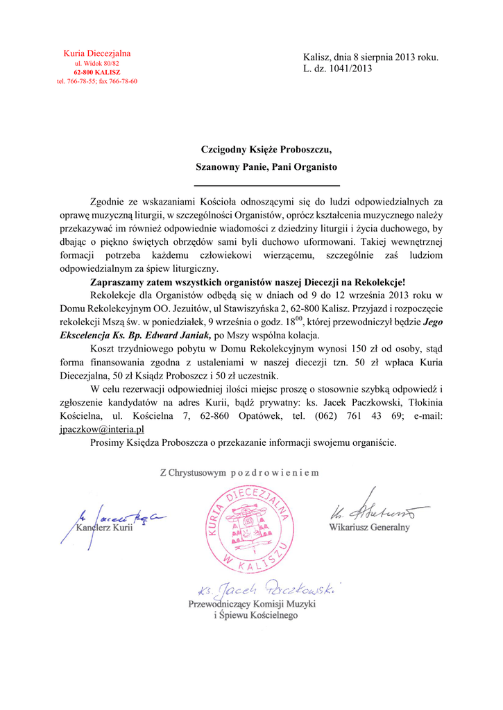 Kuria Diecezjalna ul. Widok 80/82 62-800 KALISZ tel. 766-78-55; fax 766-78-60 Kalisz, dnia 8 sierpnia 2013 roku. L. dz. 1041/2013 Czcigodny Księże Proboszczu, Szanowny Panie, Pani Organisto Zgodnie ze wskazaniami Kościoła odnoszącymi się do ludzi odpowiedzialnych za oprawę muzyczną liturgii, w szczególności Organistów, oprócz kształcenia muzycznego należy przekazywać im również odpowiednie wiadomości z dziedziny liturgii i życia duchowego, by dbając o piękno świętych obrzędów sami byli duchowo uformowani. Takiej wewnętrznej formacji potrzeba każdemu człowiekowi wierzącemu, szczególnie zaś ludziom odpowiedzialnym za śpiew liturgiczny. Zapraszamy zatem wszystkich organistów naszej Diecezji na Rekolekcje! Rekolekcje dla Organistów odbędą się w dniach od 9 do 12 września 2013 roku w Domu Rekolekcyjnym OO. Jezuitów, ul Stawiszyńska 2, 62-800 Kalisz. Przyjazd i rozpoczęcie rekolekcji Mszą św. w poniedziałek, 9 września o godz. 1800, której przewodniczył będzie Jego Ekscelencja Ks. Bp. Edward Janiak, po Mszy wspólna kolacja. Koszt trzydniowego pobytu w Domu Rekolekcyjnym wynosi 150 zł od osoby, stąd forma finansowania zgodna z ustaleniami w naszej diecezji tzn. 50 zł wpłaca Kuria Diecezjalna, 50 zł Ksiądz Proboszcz i 50 zł uczestnik. W celu rezerwacji odpowiedniej ilości miejsc proszę o stosownie szybką odpowiedź i zgłoszenie kandydatów na adres Kurii, bądź prywatny: ks. Jacek Paczkowski, Tłokinia Kościelna, ul. Kościelna 7, 62-860 Opatówek, tel. (062) 761 43 69; e-mail: [email protected] Prosimy Księdza Proboszcza o przekazanie informacji swojemu organiście.