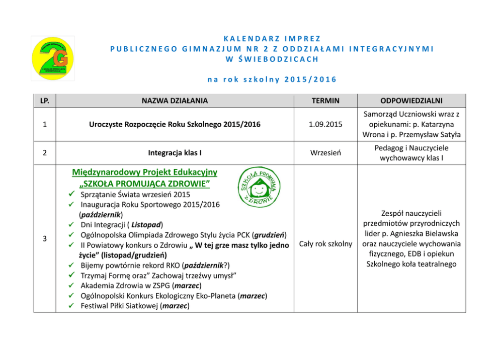 KALENDARZ IMPREZ P U B L I C Z N EG O G I M N A Z J U M N R 2 Z O D D Z I A Ł A M I I N T EG R A C YJ N Y M I W ŚWIEBODZICACH na rok szkolny 2015/2016 LP. NAZWA DZIAŁANIA TERMIN ODPOWIEDZIALNI 1 Uroczyste Rozpoczęcie Roku Szkolnego 2015/2016 1.09.2015 Samorząd Uczniowski wraz z opiekunami: p. Katarzyna Wrona i p. Przemysław Satyła 2 Integracja klas I Wrzesień Pedagog i Nauczyciele wychowawcy klas I Międzynarodowy Projekt Edukacyjny „SZKOŁA PROMUJĄCA ZDROWIE” 3 Sprzątanie Świata wrzesień 2015 Inauguracja Roku Sportowego 2015/2016 (październik) Dni Integracji ( Listopad) Ogólnopolska Olimpiada Zdrowego Stylu życia PCK (grudzień) II Powiatowy konkurs o Zdrowiu „ W tej grze masz tylko jedno życie” (listopad/grudzień) Bijemy powtórnie rekord RKO (październik?) Trzymaj Formę oraz” Zachowaj trzeźwy umysł” Akademia Zdrowia w ZSPG (marzec) Ogólnopolski Konkurs Ekologiczny Eko-Planeta (marzec) Festiwal Piłki Siatkowej (marzec) Cały rok szkolny Zespół nauczycieli przedmiotów przyrodniczych lider p. Agnieszka Bielawska oraz nauczyciele wychowania fizycznego, EDB i opiekun Szkolnego koła teatralnego Dni Ekologii dzień ziemi (kwiecień) Festiwal Teatrów Profilaktycznych (maj) Warsztaty profilaktyczne dotyczące cyberprzemocy; uzależnień od internetu i gier komputerowych XLI Miejskie Igrzyska Młodzieży Szkolnej (czerwiec) 4 MATEMATYCZNE: Olimpiada matematyczna Miejski Konkurs Matematyczny Sudoku (luty) Międzynarodowy Konkurs Matematyczny „Kangur”( marzec) 5 ŚWIĘTO PIECZONEGO ZIEMNIAKA – FESTYN RODZINNY 26.09.2015 Wszyscy pracownicy szkoły 6 LOSY ŻOŁNIERZA Wolna znaczy Niepodległa 11 XI Pamięci Żołnierzy Wyklętych (wrzesień i marzec) Arsenał Pamięci – POWIATOWY KONKURS DLA SZKÓŁ GIMNAZJALNYCH Cały rok szkolny Nauczyciel Historii : p. Robert Lewandowski Cały rok szkolny Zespół humanistyczny: p. Małgorzata Chojda-Ozga, Aneta Bogucka, p. Katarzyna Wrona... marzec Wszyscy pracownicy szkoły 7 8 9 DNI KULTURY CHRZEŚCIJAŃSKIEJ CYKL SPOTKAŃ : Konkurs Poezji Religijnej Uczczenie Pontyfikatu JP II Jasełka Szkolne i Wigilie klasowe Dni Papieskie – Konkurs poezji JP II „Arka” - Drzwi Otwarte w Gimnazjum nr 2 HUMANISTYKA Narodowe czytanie 5 września III Miejskie Dyktando ( 19 listopad) Międzyszkolny Konkurs Językowy ( listopad) Nauczyciele Matematycy: p. Aneta Krajewska, p. Ewa Sicińska, p. Kamila Cebulak p. Małgorzata Chojda-Ozga, p. Robert Lewandowski Dolnośląski Konkurs Recytatorski Pegazik (luty- maj) Świebodzice Moja Mała Ojczyzna (maj) Sesja naukowa- warsztaty humanistyczne we Współpracy z TMJP („Nocka w Gimnazjum”) Corrida Ortograficzna o tytuł Mistrza Ortografii 10 Zdolny Ślązak Gimnazjalista Wg harmonogramu Zespół humanistyczny: 11 Naukowa Liga Humanistów i Matematyków Wg harmonogramu Zespół humanistyczny oraz matematyczno-przyrodniczy październik/maj n-le języków obcych JĘZYKI OBCE: 12 13 14 UNION JACK CONTEST (październik) Powiatowa Bitwa Językowa (październik) TYDZIEŃ EUROPEJSKI (maj) Międzyszkolny Konkurs Poezji i Piosenki Obcojęzycznej (maj) IMPREZY OKOLICZNOŚCIOWE: Dzień Chłopca Andrzejki Mikołaj Wigilia i Jasełka Dzień Kobiet Dzień Dziecka Karnawał + WOŚP Samorząd Uczniowski wraz z Listopad i marzec opiekunami: p. Katarzyna Wrona i p. Przemysław Satyła Styczeń - luty Sejmik Uczniowski wraz z opiekunami: p. Katarzyna Wrona i p. Przemysław Satyła + p. Zofia Marek i jej sztab 15 SPORT: Zawody, rozgrywki w różnych dyscyplinach sportu: pływanie, piłka nożna, piłka ręczna, piłka siatkowa, aerobik (Szczegóły w załączniku do kalendarza – zgodne z harmonogramem Szkolnego Związku Sportowego) MIEJSKIE IGRZYSKA SPORTOWE (czerwiec) Cały rok N-le wych. fizycznego 16 Uroczyste pożegnanie klas III czerwiec SU i Wychowawcy klas II i III 17 FESTIWAL SUKCESÓW czerwiec SU i Wychowawcy klas 18 DNI ŚWIEBODZIC czerwiec SU i Wychowawcy klas 19 Uroczyste zakończenie roku szkolnego 2015/2016 czerwiec SU i Wychowawcy klas