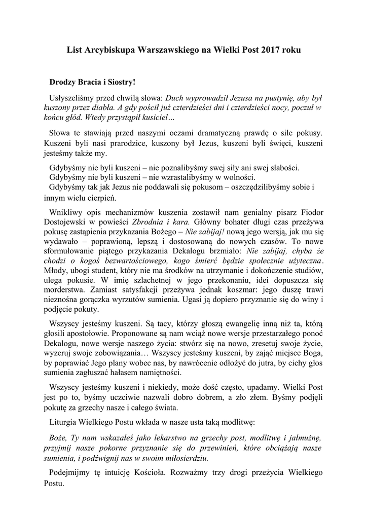 List Arcybiskupa Warszawskiego na Wielki Post 2017 roku Drodzy Bracia i Siostry! Usłyszeliśmy przed chwilą słowa: Duch wyprowadził Jezusa na pustynię, aby był kuszony przez diabła. A gdy pościł już czterdzieści dni i czterdzieści nocy, poczuł w końcu głód. Wtedy przystąpił kusiciel… Słowa te stawiają przed naszymi oczami dramatyczną prawdę o sile pokusy. Kuszeni byli nasi prarodzice, kuszony był Jezus, kuszeni byli święci, kuszeni jesteśmy także my. Gdybyśmy nie byli kuszeni – nie poznalibyśmy swej siły ani swej słabości. Gdybyśmy nie byli kuszeni – nie wzrastalibyśmy w wolności. Gdybyśmy tak jak Jezus nie poddawali się pokusom – oszczędzilibyśmy sobie i innym wielu cierpień. Wnikliwy opis mechanizmów kuszenia zostawił nam genialny pisarz Fiodor Dostojewski w powieści Zbrodnia i kara. Główny bohater długi czas przeżywa pokusę zastąpienia przykazania Bożego – Nie zabijaj! nową jego wersją, jak mu się wydawało – poprawioną, lepszą i dostosowaną do nowych czasów. To nowe sformułowanie piątego przykazania Dekalogu brzmiało: Nie zabijaj, chyba że chodzi o kogoś bezwartościowego, kogo śmierć będzie społecznie użyteczna. Młody, ubogi student, który nie ma środków na utrzymanie i dokończenie studiów, ulega pokusie. W imię szlachetnej w jego przekonaniu, idei dopuszcza się morderstwa. Zamiast satysfakcji przeżywa jednak koszmar: jego duszę trawi nieznośna gorączka wyrzutów sumienia. Ugasi ją dopiero przyznanie się do winy i podjęcie pokuty. Wszyscy jesteśmy kuszeni. Są tacy, którzy głoszą ewangelię inną niż ta, którą głosili apostołowie. Proponowane są nam wciąż nowe wersje przestarzałego ponoć Dekalogu, nowe wersje naszego życia: stwórz się na nowo, zresetuj swoje życie, wyzeruj swoje zobowiązania… Wszyscy jesteśmy kuszeni, by zająć miejsce Boga, by poprawiać Jego plany wobec nas, by nawrócenie odłożyć do jutra, by cichy głos sumienia zagłuszać hałasem namiętności. Wszyscy jesteśmy kuszeni i niekiedy, może dość często, upadamy. Wielki Post jest po to, byśmy uczciwie nazwali dobro dobrem, a zło złem. Byśmy podjęli pokutę za grzechy nasze i całego świata. Liturgia Wielkiego Postu wkłada w nasze usta taką modlitwę: Boże, Ty nam wskazałeś jako lekarstwo na grzechy post, modlitwę i jałmużnę, przyjmij nasze pokorne przyznanie się do przewinień, które obciążają nasze sumienia, i podźwignij nas w swoim miłosierdziu. Podejmijmy tę intuicję Kościoła. Rozważmy trzy drogi przeżycia Wielkiego Postu. Najpierw POST. Kościół wypracował przez wieki mądre i skuteczne sposoby praktykowania postu. Pomogą one w przywracaniu zdrowia duszy i ciała, a zaoszczędzone w ten sposób fundusze wspomogą najuboższych. Pozwólcie, że zaproponuję także inny, oprócz powstrzymania się od pokarmów mięsnych, rodzaj postu. Obserwujemy wszyscy, jak wiele jest w naszym życiu publicznym słów, które niebezpiecznie ocierają się o nienawiść, jak wiele pogardy dla drugiego człowieka. Ileż jadu sączy się na internetowych forach, które dają złudne poczucie anonimowości. Św. Paweł prosił kiedyś Efezjan: Niech z waszych ust nie wychodzi żadna mowa szkodliwa… Może święty czas Wielkiego Postu jest wart tego, by uspokoić debatę publiczną, także spory na poziomie rodzin, przyjaciół, bliskich. Może stać nas na to, by od czasu do czasu powiedzieć coś dobrego o przeciwnikach politycznych? To będzie prawdziwy owoc kolejnego Wielkiego Postu w naszym życiu. MODLITWA. Światowe Dni Młodzieży pokazały, jak wielki potencjał dobra ma nasza młodzież. Półtora roku przed synodem biskupów na temat młodzieży spróbujmy razem z młodzieżą zastanowić się nad tym, jak lepiej wykorzystać dynamizm młodego pokolenia polskich katolików? Jak towarzyszyć tym, którzy dopiero szukają kontaktu z Bogiem albo leczą rany zadane im przez świat dorosłych? Jak w nowy sposób głosić stare ideały: wierności, uczciwości, życzliwości, czystości – bez których marny będzie człowiek, coraz bardziej poranione będą nasze rodziny, biedne i kruche będzie to dobro, któremu na imię Polska? Módlmy się o to, byśmy temu zadaniu sprostali. Módlmy się za młodych, by dobrze rozpoznali swoje powołanie, szczególnie do życia w rodzinie, i dobrze się do tego przygotowali. Módlmy się zwłaszcza za tych, których Pan powołuje na swoje wyłączne narzędzia w życiu kapłańskim i zakonnym – aby Bogu nigdy nie odmawiali. Modlitwa w intencji powołań to również modlitwa za kapłanów, modlitwa o to, by byli wierni. Módlcie się za swoich kapłanów, walczcie o nich, bo niestety walczy o nich także szatan, który pierwszy powiedział Bogu: Nie będę służył! Każdy przypadek porzucenia kapłańskiej posługi, porzucenia braci i sióstr to wielka tragedia Kościoła i rana na Ciele Jezusa. JAŁMUŻNA. Od kilku miesięcy działa program pomocowy Rodzina rodzinie. Polega on na wsparciu rodzin poszkodowanych w wyniku wojny w Syrii – wsparciu przez inne rodziny, także polskie, przez wspólnoty bądź pojedyncze osoby. Chcemy w naszej Archidiecezji rozpocząć ten program. Znajdziecie o nim informacje w swoich parafiach, a w internecie – krótkie opisy syryjskich rodzin. W zależności od możliwości finansowych darczyńca może objąć rodzinę wsparciem całościowym lub częściowym. Pomoc trafia tam, gdzie jest najbardziej potrzebna. Pozwala rozpocząć nowe życie w kraju zniszczonym wojną domową. Dzięki niej pomagamy utrzymać przy życiu także chrześcijańską mniejszość, szczególnie poszkodowaną w trakcie wojny. Zachęcam gorąco wszystkich – kapłanów, parafie, rodziny katolickie i wszystkich ludzi dobrej woli – do włączenia się w to dzieło: konkretne, dyskretne i skuteczne. To jest pierwszy ważny krok pomocy uchodźcom. Mamy nadzieję, że następnym krokiem będzie program pomocy przez koryt