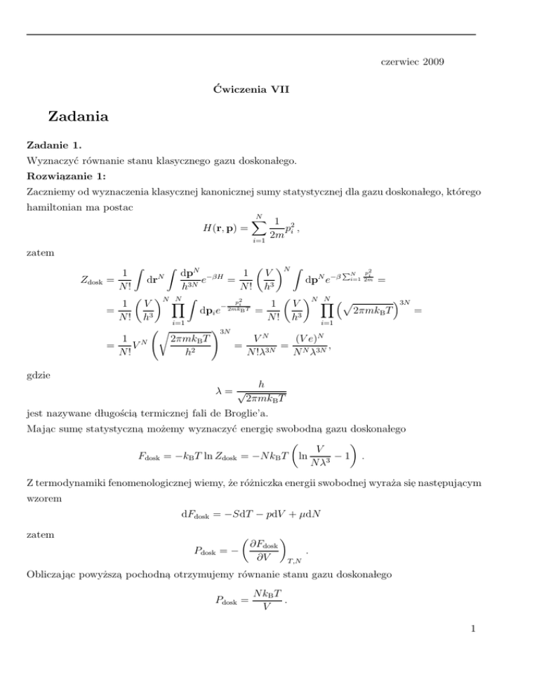 Zaczniemy od wyznaczenia klasycznej kanonicznej sumy statystycznej dla gazu doskonalego, którego