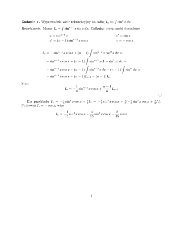 Zadanie 1. Wyprowadzi¢ wzór rekurencyjny na caªk¦ п := / sin Rozwi