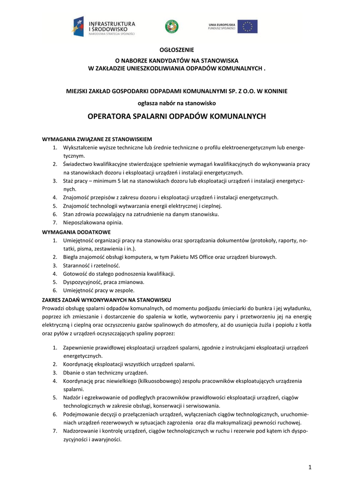 OGŁOSZENIE O NABORZE KANDYDATÓW NA STANOWISKA W ZAKŁADZIE UNIESZKODLIWIANIA ODPADÓW KOMUNALNYCH . MIEJSKI ZAKŁAD GOSPODARKI ODPADAMI KOMUNALNYMI SP. Z O.O. W KONINIE ogłasza nabór na stanowisko OPERATORA SPALARNI ODPADÓW KOMUNALNYCH WYMAGANIA ZWIĄZANE ZE STANOWISKIEM 1. Wykształcenie wyższe techniczne lub średnie techniczne o profilu elektroenergetycznym lub energetycznym. 2. Świadectwo kwalifikacyjne stwierdzające spełnienie wymagań kwalifikacyjnych do wykonywania pracy na stanowiskach dozoru i eksploatacji urządzeń i instalacji energetycznych. 3. Staż pracy – minimum 5 lat na stanowiskach dozoru lub eksploatacji urządzeń i instalacji energetycznych. 4. Znajomość przepisów z zakresu dozoru i eksploatacji urządzeń i instalacji energetycznych. 5. Znajomość technologii wytwarzania energii elektrycznej i cieplnej. 6. Stan zdrowia pozwalający na zatrudnienie na danym stanowisku. 7. Nieposzlakowana opinia. WYMAGANIA DODATKOWE 1. Umiejętność organizacji pracy na stanowisku oraz sporządzania dokumentów (protokoły, raporty, notatki, pisma, zestawienia i in.). 2. Biegła znajomość obsługi komputera, w tym Pakietu MS Office oraz urządzeń biurowych. 3. Staranność i rzetelność. 4. Gotowość do stałego podnoszenia kwalifikacji. 5. Dyspozycyjność, praca zmianowa. 6. Umiejętność pracy w zespole. ZAKRES ZADAŃ WYKONYWANYCH NA STANOWISKU Prowadzi obsługę spalarni odpadów komunalnych, od momentu podjazdu śmieciarki do bunkra i jej wyładunku, poprzez ich zmieszanie i dostarczenie do spalenia w kotle, wytworzeniu pary i przetworzeniu jej na energię elektryczną i cieplną oraz oczyszczeniu gazów spalinowych do atmosfery, aż do usunięcia żużla i popiołu z kotła oraz pyłów z urządzeń oczyszczających spaliny poprzez: 1. Zapewnienie prawidłowej eksploatacji urządzeń spalarni, zgodnie z instrukcjami eksploatacji urządzeń energetycznych. 2. Koordynację eksploatacji wszystkich urządzeń spalarni. 3. Dbanie o stan techniczny urządzeń. 4. Koordynację prac niewielkiego (kilkuosobowego) zespołu pracowników eksploatujących urządzenia spalarni. 5. Nadzór i egzekwowanie od podległych pracowników prawidłowości eksploatacji urządzeń, ciągów technologicznych w zakresie obsługi, konserwacji i serwisowania. 6. Podejmowanie decyzji o przełączeniach urządzeń, wyłączeniach ciągów technologicznych, uruchomieniach urządzeń rezerwowych w sytuacjach zagrożenia oraz dla maksymalizacji pewności ruchowej. 7. Nadzorowanie i kontrolę urządzeń, ciągów technologicznych w ruchu i rezerwie pod kątem ich dyspozycyjności i awaryjności. 1 8. Analizowanie wykrytych nieprawidłowości i usterek oraz ich ocenę pod kątem zagrożenia dla całości procesu spalania odpadów. 9. Odpowiedzialność za właściwe i terminowe przygotowanie urządzeń do remontów planowych i awaryjnych oraz uruchomienie urządzeń po remontach. 10. Koordynowanie prac na polecenia pisemne, określanie czynności łączeniowych dla przygotowania strefy pracy; dopuszczanie do prac remontowych na polecenia pisemne. 11. Odpowiedzialność za stan dyscypliny, przestrzeganie przepisów BHP, ppoż., ergonomii, ochrony środowiska przez podległych pracowników na zmianie. 12. Prowadzenie wymaganych zapisów eksploatacyjnych oraz kontrola prowadzenia zapisów przez podległych pracowników. WYMAGANE DOKUMENTY APLIKACYJNE 1. Kwestionariusz osobowy dla osób ubiegających się o zatrudnienie (wg załączonego wzoru) 2. Kserokopie dokumentów potwierdzających wykształcenie, doświadczenie i dodatkowe kwalifikacje. 3. Życiorys – curriculum vitae. 4. Kserokopie zaświadczeń o ukończonych kursach, szkoleniach. 5. Oświadczenie kandydata o wyrażeniu zgody na przetwarzanie danych osobowych do celów rekrutacji.(wg załączonego wzoru) 6. Oświadczenie kandydata o niekaralności (wg załączonego wzoru) WYMOGI FORMALNE 1. Złożenie wymaganych dokumentów. 2. Spełnienie wymagań związanych ze stanowiskiem 3. Oferty aplikacyjne można składać w siedzibie spółki osobiście lub drogą pocztową (62-510 Konin, ul. Sulańska 13) 4. Wymagane dokumenty należy składać do dnia 15 marca 2015r. 5. Dokumenty, które wpłyną do MZGOK sp. z o. o. po wyżej wymienionym terminie nie będą rozpatrywane. INNE INFORMACJE Forma zatrudnienia - umowa o pracę od II kwartału 2015r. Praca zmianowa, dodatkowy czas pracy do przejęcia i przekazania kierownictwa zmiany. Zatrudniony operator spalarni uczestniczyć będzie w 2015 roku w: szkoleniach organizowanych przez Wykonawcę na terenie MZGOK sp. z o.o. zgodnie z zakresem i harmonogramem przedstawionym przez Wykonawcę ZTUOK szkoleniach praktycznych w funkcjonujących spalarniach wskazanych przez Wykonawcę , pracach odbiorowych i rozruchowych w charakterze obserwatora, Osoby, które spełnią wymagania formalne określone w ogłoszeniu oraz zakwalifikują się do dalszego postępowania zostaną pisemnie poinformowane. Zastrzegamy sobie prawo do unieważnienia postępowania kwalifikacyjnego bez podania przyczyny. 2