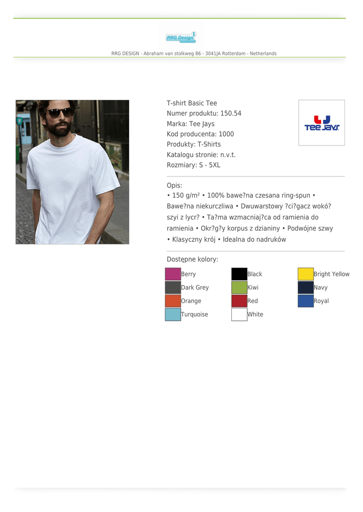 RRG DESIGN - Abraham van stolkweg 86 - 3041JA Rotterdam - Netherlands T-shirt Basic Tee Numer produktu: 150.54 Marka: Tee Jays Kod producenta: 1000 Produkty: T-Shirts Katalogu stronie: n.v.t. Rozmiary: S - 5XL Opis: • 150 g/m² • 100% bawe?na czesana ring-spun • Bawe?na niekurczliwa • Dwuwarstowy ?ci?gacz wokó? szyi z lycr? • Ta?ma wzmacniaj?ca od ramienia do ramienia • Okr?g?y korpus z dzianiny • Podwójne szwy • Klasyczny krój • Idealna do nadruków Dostępne kolory: Berry Black Bright Yellow Dark Grey Kiwi Navy Orange Red Royal Turquoise White