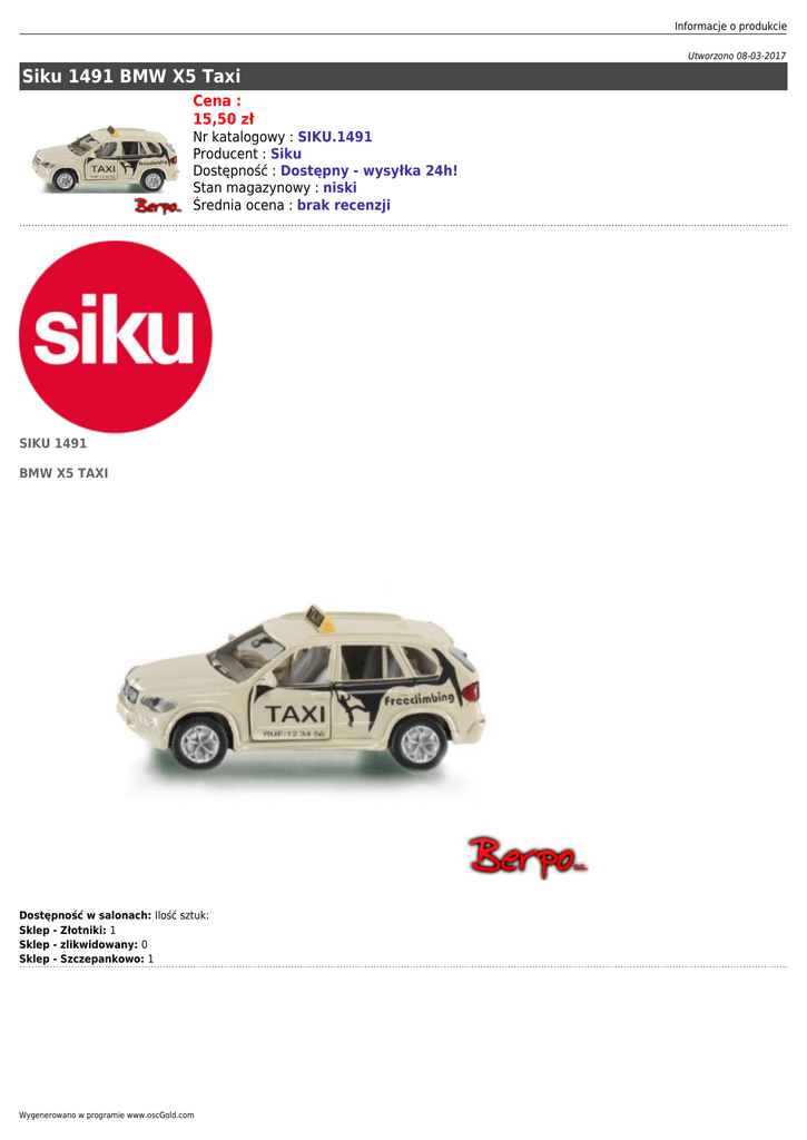 Informacje o produkcie Utworzono 08-03-2017 Siku 1491 BMW X5 Taxi Cena : 15,50 zł Nr katalogowy : SIKU.1491 Producent : Siku Dostępność : Dostępny - wysyłka 24h! Stan magazynowy : niski Średnia ocena : brak recenzji SIKU 1491 BMW X5 TAXI Dostępność w salonach: Ilość sztuk: Sklep - Złotniki: 1 Sklep - zlikwidowany: 0 Sklep - Szczepankowo: 1 Wygenerowano w programie www.oscGold.com