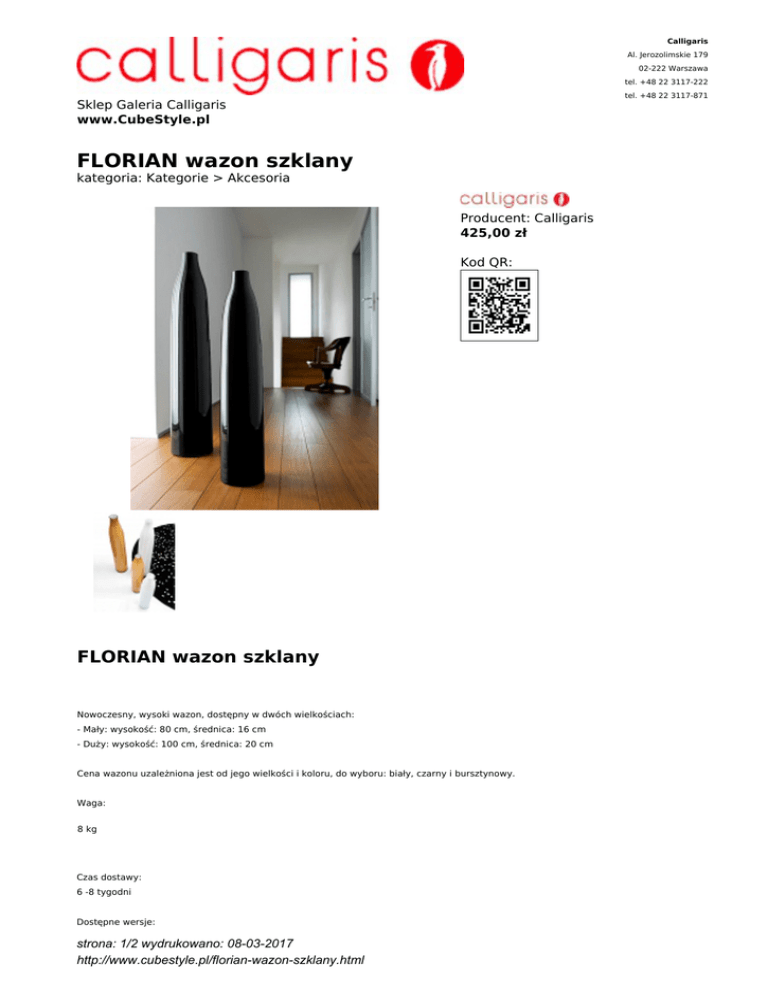 Calligaris Al. Jerozolimskie 179 02-222 Warszawa tel. +48 22 3117-222 tel. +48 22 3117-871 Sklep Galeria Calligaris www.CubeStyle.pl FLORIAN wazon szklany kategoria: Kategorie > Akcesoria Producent: Calligaris 425,00 zł Kod QR: FLORIAN wazon szklany Nowoczesny, wysoki wazon, dostępny w dwóch wielkościach: - Mały: wysokość: 80 cm, średnica: 16 cm - Duży: wysokość: 100 cm, średnica: 20 cm Cena wazonu uzależniona jest od jego wielkości i koloru, do wyboru: biały, czarny i bursztynowy. Waga: 8 kg Czas dostawy: 6 -8 tygodni Dostępne wersje: strona: 1/2 wydrukowano: 08-03-2017 http://www.cubestyle.pl/florian-wazon-szklany.html strona: 2/2 wydrukowano: 08-03-2017 http://www.cubestyle.pl/florian-wazon-szklany.html