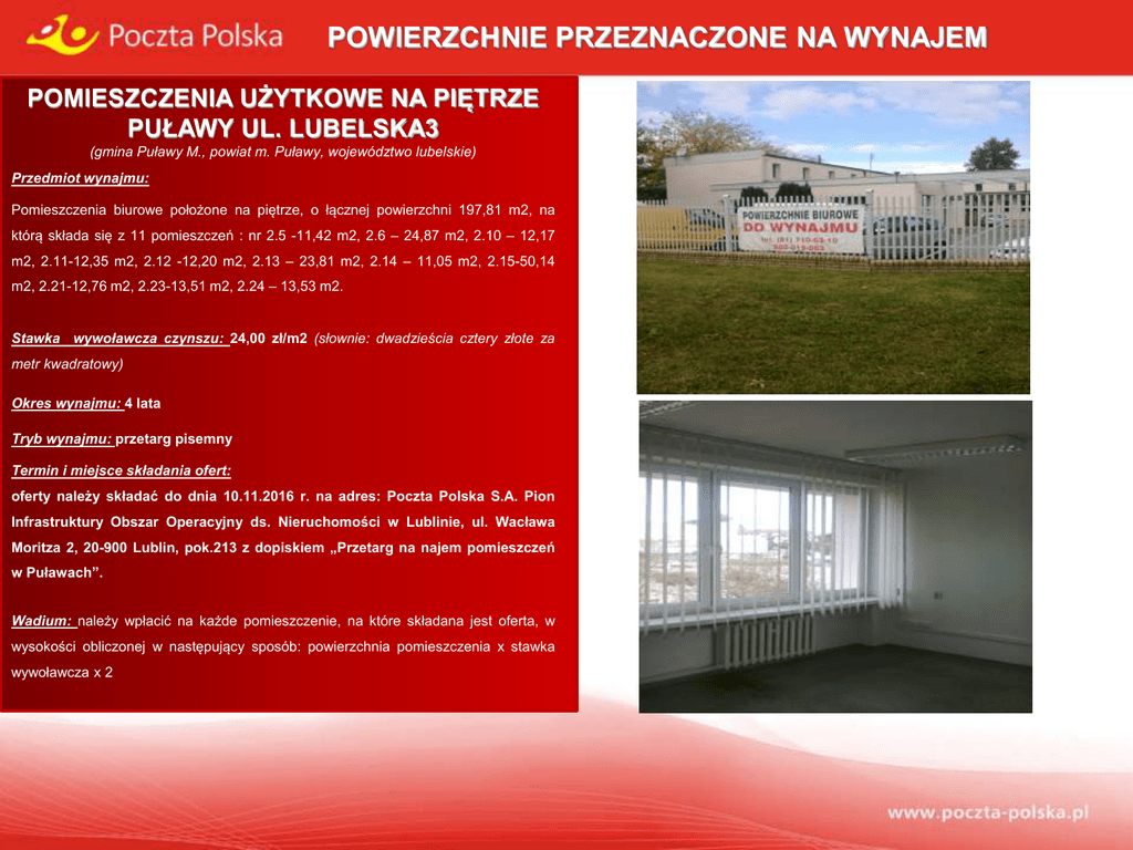 POWIERZCHNIE PRZEZNACZONE NA WYNAJEM POMIESZCZENIA UŻYTKOWE NA PIĘTRZE PUŁAWY UL. LUBELSKA3 (gmina Puławy M., powiat m. Puławy, województwo lubelskie) Przedmiot wynajmu: Pomieszczenia biurowe położone na piętrze, o łącznej powierzchni 197,81 m2, na którą składa się z 11 pomieszczeń : nr 2.5 -11,42 m2, 2.6 – 24,87 m2, 2.10 – 12,17 m2, 2.11-12,35 m2, 2.12 -12,20 m2, 2.13 – 23,81 m2, 2.14 – 11,05 m2, 2.15-50,14 m2, 2.21-12,76 m2, 2.23-13,51 m2, 2.24 – 13,53 m2. Stawka wywoławcza czynszu: 24,00 zł/m2 (słownie: dwadzieścia cztery złote za metr kwadratowy) Okres wynajmu: 4 lata Tryb wynajmu: przetarg pisemny Termin i miejsce składania ofert: oferty należy składać do dnia 10.11.2016 r. na adres: Poczta Polska S.A. Pion Infrastruktury Obszar Operacyjny ds. Nieruchomości w Lublinie, ul. Wacława Moritza 2, 20-900 Lublin, pok.213 z dopiskiem „Przetarg na najem pomieszczeń w Puławach”. Wadium: należy wpłacić na każde pomieszczenie, na które składana jest oferta, w wysokości obliczonej w następujący sposób: powierzchnia pomieszczenia x stawka wywoławcza x 2 Kliknij i zlokalizuj na mapie Opis przedmiotu wynajmu: Budynek biurowo-usługowy, w którym mieszczą się pomieszczenia biurowe, usługowe i gospodarcze posiada dwie kondygnacje. Przeznaczone do wynajmu pomieszczenia biurowe znajdują się na piętrze. Oprócz czynszu Najemca będzie ponosił koszty za media z tytułu: - zużycia energii elektrycznej - ryczałt - centralnego ogrzewania – proporcjonalnie do zajmowanej kubatury, - dostawa wody – ryczałt, - odprowadzanie ścieków – ryczałt, - wywóz nieczystości stałych – ryczałt. Opis nieruchomości: Miejscowość Puławy Ulica, nr budynku ul. Lubelska 3 Powierzchnia budynków, w których zlokalizowany jest przedmiot wynajmu Nr działki ewidencyjnej, obręb Księga wieczysta, Sąd Rejonowy, Nr Wydziału Budynek eksploatacyjno –biurowy o powierzchni 1869,88 m2 Działka nr 2567 o powierzchni 3826 m2, LU1P/00047673/4 prowadzona przez Sąd Rejonowy w Puławach, V Wydział Ksiąg Wieczystych Stan prawny gruntu Użytkowanie wieczyste Lokalizacja i dostępność komunikacyjna: Nieruchomość położona jest w Puławach przy ul. Lubelskiej 3 – w ścisłym centrum miasta. Z prawej strony budynek graniczy z budynkiem biurowym Orange, w bliskim sąsiedztwie znajduje się Urząd Miasta, z lewej strony znajduje się hotel Izabela, z tyłu budynku jest mały park miejski i Sąd Rejonowy. Dojazd od strony południowej ul. Lubelską. Opis nieruchomości: Nieruchomość jest ogrodzona, w budynku znajduje się Poczta Główna , Mikrooddział Banku Pocztowego i pomieszczenia biurowe. Podwórko wewnętrzne wykorzystywane jest do celów służbowych jako dojazd do rampy i parking dla samochodów służbowych. Rysunek przedstawia rzut pomieszczeń przeznaczonych do wynajmu. OBWIESZCZENIE O PRZETARGU PISEMNYM NA NAJEM CZĘŚCI NIERUCHOMOŚCI W PUŁAWACH PRZY UL. LUBELSKIEJ 3. Poczta Polska S.A. Pion Infrastruktury Obszar Operacyjny ds. Nieruchomości w Lublinie ogłasza przetarg pisemny na wynajem części powierzchni w budynku położonym w Puławach przy ul. Lubelskiej 3 pod działalność niekolidującą z działalnością i wizerunkiem Poczty Polskiej S.A. Wynajmujący: Poczta Polska S.A. z siedzibą w Warszawie, 00-940 Warszawa, ul. Rodzin Hiszpańskich 8. Prowadzący przetarg: Pion Infrastruktury Obszar Operacyjny ds. Nieruchomości w Lublinie, ul. Wacława Moritza 2, 20-900 Lublin. Termin i miejsce składania ofert: oferty należy składać do dnia 10.11.2016 r. na adres: Poczta Polska S.A. Pion Infrastruktury Obszar Operacyjny ds. Nieruchomości w Lublinie, ul. Wacława Moritza 2, 20-900 Lublin, pok.213 z dopiskiem „Przetarg na najem pomieszczeń w Puławach”. Charakterystyka nieruchomości: Nieruchomość położona jest w centrum miasta. W bezpośrednim sąsiedztwie znajduje się Urząd Miasta, hotel, galeria handlowa. Nieruchomość jest ogrodzona. Przedmiot najmu: Powierzchnię do wynajmu stanowią pomieszczenia biurowe położone na piętrze, o łącznej powierzchni 197,81 m2. na którą składa się z 11 pomieszczeń : nr 2.5 -11,42 m2, 2.6 – 24,87 m2, 2.10 – 12,17 m2, 2.11-12,35 m2, 2.12 -12,20 m2, 2.13 – 23,81 m2, 2.14 – 11,05 m2, 2.15-50,14 m2, 2.21-12,76 m2, 2.23-13,51 m2, 2.24 – 13,53 m2. Oprócz czynszu najemca pomieszczeń zobowiązany będzie ponosić opłaty z tytułu: dostawy energii elektrycznej, energii cieplnej, dostawy wody, odprowadzania ścieków, wywozu nieczystości stałych. Okres trwania umowy - 4 lata. Wywoławcza stawka czynszu netto wynosi 24,00 zł/m2, Wadium należy wpłacić na każde pomieszczenie, na które składana jest oferta, w wysokości obliczonej w następujący sposób: powierzchnia pomieszczenia x stawka wywoławcza x 2. Szczegółowe informacje na temat przetargu, warunków najmu oraz oględzin można uzyskać w siedzibie Pionu Infrastruktury Obszar Operacyjny ds. Nieruchomości w Lublinie, ul. Wacława Moritza 2, pokój 213 pod nr tel. (81) 710-63-30; kom. 504 734 491 oraz na www.poczta-polska.pl/wynajem. Warunkiem przystąpienia do przetargu jest: Wniesienie wadium przelewem na rachunek bankowy w Banku Pocztowym S.A. w Bydgoszczy nr konta: 85 1320 0019 0099 0718 2000 0025 w terminie do dnia: 09.11.2016 roku, przy czym termin wpłaty wadium rozumiany jest jako dzień uznania rachunku bankowego Poczty Polskiej S.A. z dopiskiem na przelewie w rubryce tytułem: „Przetarg na wynajem pomieszczeń w Puławach”. Wadium może być również wniesione w postaci gwarancji bankowej albo polisy ubezpieczeniowej, której oryginał dostarczony zostanie do siedziby Poczty Polskiej S.A. na dzień przed terminem przetargu pod adres: PI Obszar Operacyjny ds. Nieruchomości w Lublinie, ul. W. Moritza 2, 20-900 Lublin, budynek biurowy, pok.213. Gwarancja powinna mieć termin nie krótszy niż 4 miesiące od daty składania ofert. Załączenie do oferty oryginału lub kopii wpłaty wadium. Złożenie 