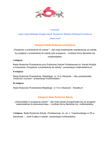 Laureaci etapu wojewódzkiego drugiej edycji Konkursu Ministra Edukacji Narodowej „Mam 6 lat” Kategoria Rada Rodziców przedszkola „Przyjaźnie z przedszkola do szkoły” – Jak moje przedszkole współpracuje ze szkołą, by przejście z przedszkola do szkoły było przyjazne – możliwe formy literackie lub multimedialne; I miejsce Rada Rodziców Przedszkola przy Publicznej Szkole Podstawowej im. Karola Wojtyły w Kraszewie „Przyjaźnie z przedszkola do szkoły”- prezentacja multimedialna pn II miejsce Rada Rodziców Przedszkola Miejskiego nr 14 w Olsztynie „ -Aby przedszkolak chciał być uczniem”- prezentacja multimedialna ” III miejsce Rada Rodziców Przedszkola Miejskiego nr 10 w Olsztynie – fotoalbum Kategoria Rada Rodziców Szkoły „Sześciolatek w przyjaznej szkole” – jak moja szkoła przygotowała się na przyjęcie sześciolatków do pierwszej klasy – możliwe formy literackie lub multimedialne; I miejsce Rada Rodziców Szkoły Podstawowej im. ks. J. Twardowskiego w ZS w Szkotowie – „ Klub 6 latka w szkole’- prezentacja multimedialna II miejsce Rada Rodziców Szkoły Podstawowej nr 3 im. Senatu RP w Braniewie „Sześciolatek w przyjaznej szkole” – prezentacja multimedialna III miejsce Rada Rodziców Samorządowej Szkoły Podstawowej nr 3 im. Polskich Olimpijczyków w Iławie- „Idę do szkoły, a ze mną moimi przyjaciele” –prezentacja multimedialna Wyróżnienie Warmińsko –Mazurskiego Kuratora Oświaty Rada Rodziców Szkoły Podstawowej nr 3 im. im. M. Curie-Skłodowskiej w Szczytnie „Sześciolatek w przyjaznej szkole” - prezentacja pultimedialna KATEGORIA UC Uczniowie klas I-III szkół podstawowych którzy rozpoczęli naukę w wieku 6 lat, we współpracy z rodzicami „Mam 6 lat i potrafię” - praca prezentująca umiejętności jakie sześciolatek zdobył w I klasie – możliwe formy: multimedialne lub plastyczne lub forma literacka (krótki list, prosty tekst, wiersz) w której starsi uczniowie, którzy rozpoczęli naukę w wieku 6 lat, zachęcą młodsze dzieci do pójścia do szkoły I miejsce Amelia Kuminkiewicz ucz. Szkoły Podstawowej nr 6 im. Orła Białego w Szczytnie – praca plastyczna II miejsce Paweł Danowski ucz. Szkoły Podstawowej nr 3 im Kawalerów Orderu Uśmiechu w Olsztynie –praca literacka III miejsce Uczniowie klasy IIA Szkoły Podstawowej w Olsztynku – prezentacja multimedialna Wyróżnienie Warmińsko –Mazurskiego Kuratora Oświaty 1) Magdalena Piaścik Soła Podstawowa im. Kazimierza Jagiellończyka w Wilkasach – praca plastyczna 2) Julia Urbanowska Zespół Szkół nr 2 w Nidzicy – prezentacja multimedialna 3) Szkoła Podstawowa w Zwierznie Gm. Markusy - praca zbiorowa (plastyczna) 4) Uczniowie kl. II e i II f Szkoły Podstawowej nr 21 im. M. Kopernika w Elblągu – prezentacja multimedialna 5) Aisha Ndiaye ucz. Szkoły Podstawowej nr 7 w Olsztynie –praca plastyczna 6) Wiktoria Chodnik uczennica Szkoły Podstawowej nr 2 im. Henryka Sienkiewicza w Piszu – praca multimedialna Wyróżnienia specjalne – Stowarzyszenia na Rzecz Dzieci i Młodzieży Szczególnie Uzdolnionych w Olsztynie 1) Antonina Szymańska - Szkoła Podstawowa im. Jana Pawła II w Napiwodzie – praca plastyczna 2) Paulina Kołakowska - Zespół Szkół w Kobułtach Gm. Biskupiec – praca plastyczna Serdecznie dziękujemy wszystkim uczestnikom Konkursu za udział oraz gratulujemy laureatom i wyróżnionym!