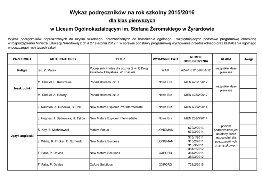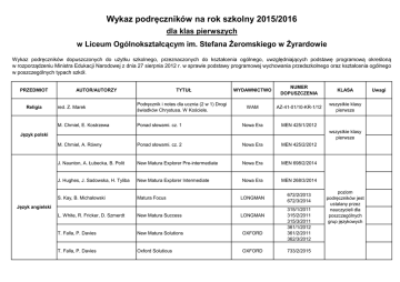 Wykaz podręczników na rok szkolny 2015/2016 dla klas pierwszych w Liceum Ogólnokształcącym im. Stefana Żeromskiego w Żyrardowie Wykaz podręczników dopuszczonych do użytku szkolnego, przeznaczonych do kształcenia ogólnego, uwzględniających podstawę programową określoną w rozporządzeniu Ministra Edukacji Narodowej z dnia 27 sierpnia 2012 r. w sprawie podstawy programowej wychowania przedszkolnego oraz kształcenia ogólnego w poszczególnych typach szkół. PRZEDMIOT Religia AUTOR/AUTORZY TYTUŁ red. Z. Marek Podręcznik i notes dla ucznia (2 w 1) Drogi świadków Chrystusa. W Kościele. M. Chmiel, E. Kostrzewa Ponad słowami. cz. 1 WYDAWNICTWO NUMER DOPUSZCZENIA KLASA WAM AZ-41-01/10-KR-1/12 wszystkie klasy pierwsze Nowa Era MEN 425/1/2012 wszystkie klasy pierwsze Język polski M. Chmiel, A. Równy Ponad słowami. cz. 2 Nowa Era MEN 425/2/2012 J. Naunton, A. Łubecka, B. Polit New Matura Explorer Pre-intermediate Nowa Era MEN 698/2/2014 J. Hughes, J. Sadowska, H. Tyliba New Matura Explorer Intermediate Nowa Era MEN 268/3/2014 S. Kay, B. Michałowski Matura Focus LONGMAN 672/2/2013 672/3/2014 L. White, R. Fricker, D. Szmerdt New Matura Success LONGMAN T. Falla, P. Davies New Matura Solutions OXFORD T. Falla, P. Davies Oxford Solutious OXFORD Język angielski 315/1/2011 315/2/2011 315/3/2011 361/1/2012 361/2/2011 362/3/2012 733/2/2015 poziom podręczników jest ustalany przez nauczycieli dla poszczególnych grup językowych Uwagi Język francuski Guy Capelle, Robert Menand "En action! 1" Hachtte Neue Expedition Deutsch Storter Język niemiecki J. Betleja, I. Nowicka, D. Wieruszewska MEN 745/1/2015 754/1/2015 Wydawnictwo Szkolne PWN Neue Expedition Deutsch 1 Język rosyjski Historia M. Wiatr-Kmieciak, S. Wujec St. Roszak, J. Kłaczkow Wiedza A. Janicki o społeczeństwie Wiedza o kulturze Wot i my 1. Podręcznik. Język rosyjski dla szkół ponadgimnazjalnych Poznać przeszłość. Wiek XX. Podręcznik do historii dla szkoły ponadgimnazjalnej, zakres podstawowy W centrum uwagi. Podręcznik do wiedzy o społeczeństwie dla szkół ponadgimnazjalnych, zakres podstawowy wszystkie klasy pierwsze poziom podręczników jest ustalany przez nauczycieli dla poszczególnych grup językowych PWN MEN 324/1/2011 wszystkie klasy pierwsze Nowa Era MEN 525/2012 wszystkie klasy pierwsze Nowa Era MEN 505/2012 wszystkie klasy pierwsze Nowa Era MEN 449/2012 wszystkie klasy pierwsze MEN 412/1/2012 1c, 1d, 1f MEN 563/1/2012 1a,1b,1e M. Bokiniec, B. Forysiewicz, J. Michałowski i in. "Spotkania z kulturą". Podręcznik do wiedzy o kulturze dla liceum i technikum. K. Kłaczkow, M. Kurczab, E. Świda Matematyka podręcznik do liceum i technikum klasa I zakres podstawowy K. Kłaczkow, M. Kurczab, E. Świda Matematyka podręcznik do liceum i technikum klasa I zakres podstawowy i rozszerzony Fizyka Marcin Braun, Weronika Śliwa Odkryć fizykę, zakres podstawowy Nowa Era MEN 447/2012 wszystkie klasy pierwsze Chemia R. Hassa, A. Mrzigod, J. Mrzigod To jest chemia . Podręcznik dla szkół ponadgimnazjalnych Nowa Era MEN 438/2012 wszystkie klasy pierwsze Biologia E. Bonar, W. Krzeszowiec – Jeleń, St. Czachorowski Biologia na czasie . Podręcznik dla szkół ponadgimnazjalnych. Zakres podstawowy Nowa Era MEN 450/2012 wszystkie klasy pierwsze R. Uliszak, K. Wiedermann Oblicza geografii. Podręcznik dla szkół ponadgimnazjalnych. Zakres podstawowy Nowa Era MEN 433/2012 wszystkie klasy pierwsze Operon MEN 483/2012 wszystkie klasy pierwsze Migra MEN 536/2012 wszystkie klasy pierwsze Matematyka Geografia Podstawy J. Korba, Z.Smutek przedsiębiorczości Informatyka Grażyna Koba Podstawy przedsiębiorczości - seria "Odkrywamy na nowo" Informatyka dla szkół ponadgimnazjalnych, zakres podstawowy Oficyna Wydawnicza Krzysztof Pazdro Oficyna Wydawnicza Krzysztof Pazdro Edukacja dla bezpieczeństwa M. Goniewicz, A. Nowak-Kowal, Z. Smutek Wychowanie do życia w rodzinie Brak podręcznika Edukacja dla bezpieczeństwa-Odkrywamy na nowo Operon MEN 411/2012 większość podręczników do zakupienia we wrześniu na giełdzie podręczników używanych wszystkie klasy pierwsze klasy pierwsze
