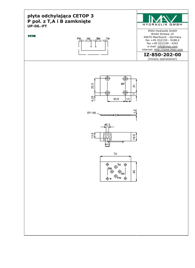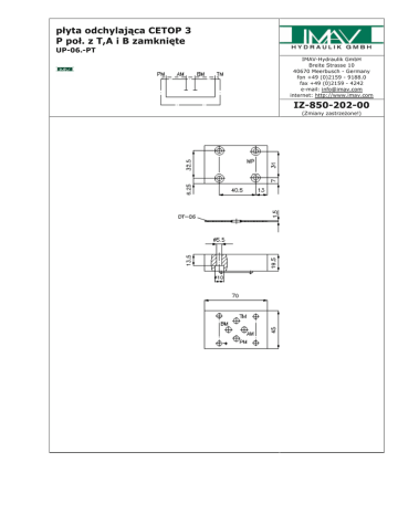 płyta odchylająca CETOP 3 P poł. z T,A i B zamknięte UP-06.-PT IMAV-Hydraulik GmbH Breite Strasse 10 40670 Meerbusch - Germany fon +49 (0)2159 - 9188.0 fax +49 (0)2159 - 4242 e-mail: [email protected] internet: http://www.imav.com IZ-850-202-00 (Zmiany zastrzeżone!) płyta odchylająca CETOP 3 P poł. z T,A i B zamknięte UP-06.-PT IMAV-Hydraulik GmbH Breite Strasse 10 40670 Meerbusch - Germany fon +49 (0)2159 - 9188.0 fax +49 (0)2159 - 4242 e-mail: [email protected] internet: http://www.imav.com Przykład zamówienia: UP - 06A - PT IZ-850-202-00 (Zmiany zastrzeżone!) Klucz typu: wersja urządzenia płyta odchylająca z ukł. otworów DIN 24340 forma A funkcja wykonawcza PT = P połączone z T wielkość konstrukcyjna i materiał 06A = Alu (F37) 06S = stal (9SMnPb28K lub GGG-40) Dane techniczne Wskazówka: wymagane śruby mocujące: 4 szt. M5 x 25 DIN 912 ciśnienie nominalne: 250 bar (A) 350 bar (S) ciężar: 0,2 / 0,5 kg (A/S) Do zakresu dostawy należą: DT-06 = uchwyt uszczelnienia z zawulkanizowanym pierścieniem uszczelniającym (Viton FPM)