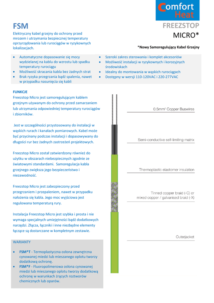 FSM FREEZSTOP MICRO* Elektryczny kabel grzejny do ochrony przed mrozem i utrzymania bezpiecznej temperatury oprzyrządowania lub rurociągów w ryzykownych lokalizacjach. • • • Automatyczne dopasowanie się mocy wydzielanej na kablu do wzrostu lub spadku temperatury rurociągu Możliwość skracania kabla bez żadnych strat Brak ryzyka przegrzania bądź spalenia, nawet w przypadku nasunięcia się kabli *Nowy Samoregulujący Kabel Grzejny • • • • FUNKCJE Freezstop Micro jest samoregulującym kablem grzejnym używanym do ochrony przed zamarzaniem lub utrzymania odpowiedniej temperatury rurociągów i zbiorników. Jest w szczególności przystosowany do instalacji w wąskich rurach i kanałach pomiarowych. Kabel może być przycinany podczas instalacji i dopasowywany do długości rur bez żadnych zastrzeżeń projektowych. Freezstop Micro został zatwierdzony również do użytku w obszarach niebezpiecznych zgodnie ze światowymi standardami. Samoregulacja kabla grzejnego zwiększa jego bezpieczeństwo i niezawodność. Freezstop Micro jest zabezpieczony przed przegrzaniem i przepaleniem, nawet w przypadku nałożenia się kabla. Jego moc wyjściowa jest regulowana temperaturą rury. Instalacja Freezstop Micro jest szybka i prosta i nie wymaga specjalnych umiejętności bądź dodatkowych narzędzi. Złącza, łączniki i inne niezbędne elementy łączące są dostarczane w kompletnym zestawie. WARIANTY • • FSM*T - Termoplastyczna osłona zewnętrzna cynowanej miedzi lub mieszanego oplotu tworzy dodatkową ochronę. FSM*F - Fluoropolimerowa osłona cynowanej miedzi lub mieszanego oplotu tworzy dodatkową ochronę w warunkach żrących roztworów chemicznych lub oparów. Szeroki zakres sterowania i komplet akcesoriów Możliwość instalacji w ryzykownych i korozyjnych środowiskach Idealny do montowania w wąskich rurociągach Dostępny w wersji 110-120VAC i 220-277VAC FSLe FREEZSTOP LITE* Elektryczny kabel grzejny do ochrony przed mrozem i utrzymania bezpiecznej temperatury oprzyrządowania lub rurociągów w ryzykownych lokalizacjach. • • • Automatyczne dopasowanie się mocy wydzielanej na kablu do wzrostu lub spadku temperatury rurociągu Możliwość skracania kabla bez żadnych strat Brak ryzyka przegrzania bądź spalenia, nawet w przypadku nasunięcia się kabli Samoregulujący Kabel Grzejny • • • Możliwość instalacji w ryzykownych i korozyjnych środowiskach Szeroki zakres sterowania i komplet akcesoriów Dostępny w wersji 110-120VAC i 220-277VAC FUNKCJE Freezstop Lite jest kablem samoregulującym używanym w przemyśle lekkim stosowanym do ochrony przed zamarzaniem lub utrzymania odpowiedniej temperatury w rurociągach i zbiornikach będących elementami sektora budowlanego i przemysłu chłodniczego. Kabel może być przycinany podczas instalacji i dopasowywany do długości rur bez żadnych zastrzeżeń projektowych. Freezstop Lite został zatwierdzony również do użytku w obszarach niebezpiecznych zgodnie ze światowymi standardami. Samoregulacja kabla grzejnego zwiększa jego bezpieczeństwo i niezawodność. Freezstop Lite jest zabezpieczony przed przegrzaniem i przepaleniem, nawet w przypadku nałożenia się kabla. Jego moc wyjściowa jest regulowana temperaturą rury. Instalacja Freezstop Lite jest szybka i prosta i nie wymaga specjalnych umiejętności bądź dodatkowych narzędzi. Złącza, łączniki i inne niezbędne elementy łączące są dostarczane w kompletnym zestawie. WARIANTY • • • FSLe .. C - Cynowany splot miedziany zapewnia ochronę przed uszkodzeniami mechanicznymi lub stanowi efektywne uziemienie np. W rurach plastikowych. FSLe .. CT - Materiał termoplastyczny otaczający cynowany splot miedziany zapewnia dodatkową ochronę. FSLe .. CF - Fluoropolimer otaczający cynowany splot miedziany zapewnia dodatkową ochronę przed żrącymi substancjami chemicznymi bądź oparami. GTe Elektryczny kabel grzejny do ochrony przed mrozem i utrzymania bezpiecznej temperatury oprzyrządowania lub rurociągów w ryzykownych lokalizacjach. • Automatyczne dopasowanie się mocy wydzielanej na kablu do wzrostu lub spadku temperatury rurociągu • Możliwość skracania kabla bez żadnych strat • Brak ryzyka przegrzania bądź spalenia, nawet w przypadku nasunięcia się kabli G-TRACE Samoregulujący Kabel Grzejny • • • Szeroki zakres sterowania i komplet akcesoriów Możliwość instalacji w ryzykownych i korozyjnych środowiskach dzięki fluoropolimerowej osłonie Dostępny w wersji 110-120VAC i 220-277VAC PROBLEM Śnieg zalegający na dachu zaczyna topnieć pod wpływem nasłonecznienia bądź wzrostu temperatury pochodzącej z budynku. Topniejący śnieg zaczyna spływać w stronę zmrożonych rynien i tam zamarzać ponownie. Zaczynają tworzyć się warstwy lodu przy wlotach rynien spustowych i w ten sposób blokować ich odpływ. Taki proces nie rzadko powoduje znaczne uszkodzenia mechaniczne rynien. Co więcej, woda z topniejącego śniegu może dostać się poprzez dach do wewnątrz budynku. Powoduje to nie tylko uszkodzenie dachu, ale również tynków i elewacji budynku. ROZWIĄZANIE Rozwiązaniem tutaj jest system kabli samoregulujących G-Trace. Charakterystyka kabla samoregulującego przedstawia zależność wydzielanej mocy od temperatury otoczenia. W otoczeniu śniegu lub lodowatej wody moc wydzielana jest maksymalna. Podczas, gdy śnieg się topi i woda zaczyna spływać, moc kabla spada o połowę. Następnie moc wydzielana przez kabel stopniowo redukuje się aż do momentu całkowitego wyschnięcia. System GTrace jest bezpieczny i niezawodny i ze względu na jego zabezpieczenie przed przegrzaniem kable mogą być stosowane także w rurach plastikowych. Dodatkowo kable G-Trace posiadają osłonę UV, dzięki czemu są odporne na szkodliwe promieniowanie słoneczne. Te właściwości zapewniają trwałość i wysoką odporność systemu G-Trace. Co więcej system samoregulujący G-Trace zapobiega rozleg