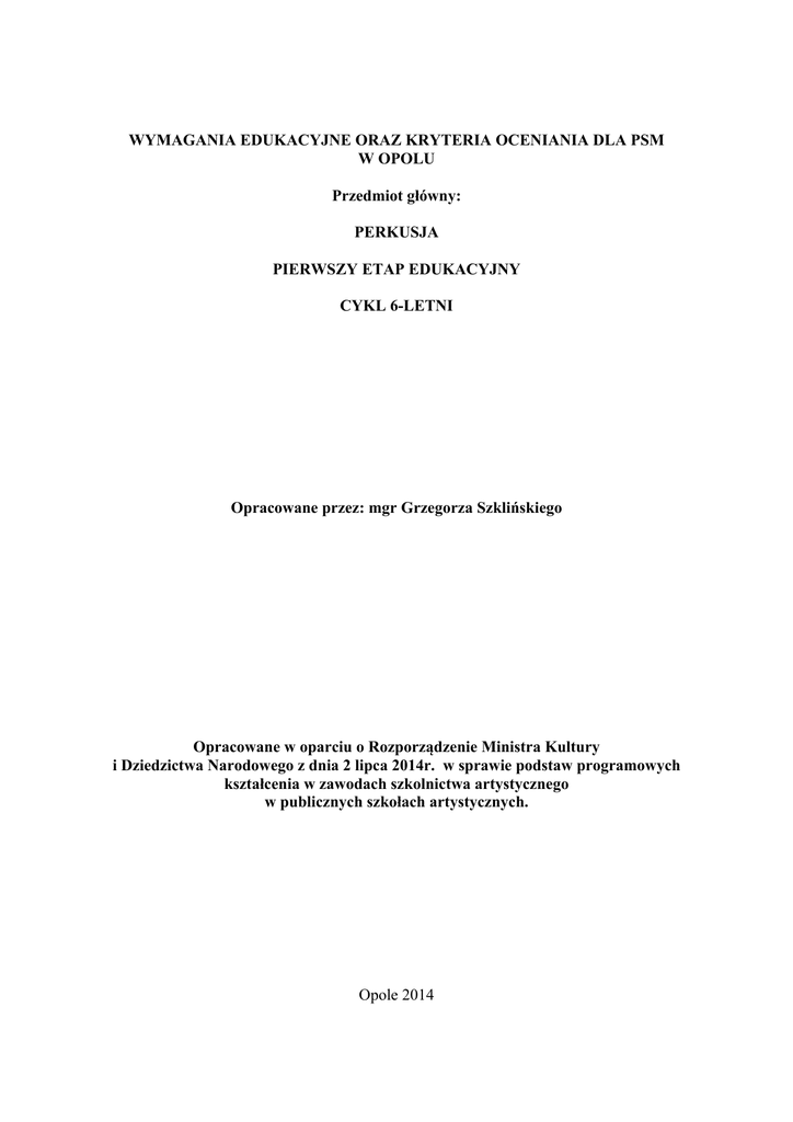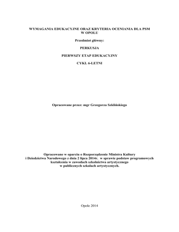 WYMAGANIA EDUKACYJNE ORAZ KRYTERIA OCENIANIA DLA PSM W OPOLU Przedmiot główny: PERKUSJA PIERWSZY ETAP EDUKACYJNY CYKL 6-LETNI Opracowane przez: mgr Grzegorza Szklińskiego Opracowane w oparciu o Rozporządzenie Ministra Kultury i Dziedzictwa Narodowego z dnia 2 lipca 2014r. w sprawie podstaw programowych kształcenia w zawodach szkolnictwa artystycznego w publicznych szkołach artystycznych. Opole 2014 WYMAGANIA EDUKACYJNE DLA UCZNIÓW KLASY PERKUSJI SM I STOPNIA W OPOLU – CYKL 4-LETNI 1. Kształcenie teoretycznych podstaw gry na instrumencie Uczeń zdobywa teoretyczną wiedzę, niezbędną do realizacji zadań muzycznych oraz obsługi instrumentów. 2. Kształcenie umiejętności gry na instrumencie Uczeń kształci umiejętność zachowania prawidłowej postawy przy instrumencie oraz technikę gry w celu poprawnej realizacji zadań na instrumencie. 3. Przygotowanie do samodzielnej pracy nad utworem Uczeń nabywa i rozwija umiejętność świadomego ćwiczenia oraz korekty własnych błędów. 4. Przygotowanie do udziału w życiu artystycznym oraz występów na estradzie Uczeń aktywnie uczestniczy w kulturze, różnych formach życia muzycznego szkoły i poza szkołą 5. Udział w przesłuchaniach CEA odbywających się co dwa lata, do których typuje szkoła. 6. Obowiązkowy udział w koncertach szkolnych, audycjach sekcyjnych i klasowych i przesłuchaniach co najmniej raz w każdym semestrze. KLASA I Instrumentarium: Werbel Ksylofon Dzwonki Werbel Wymogi techniczne: -zdobycie teoretycznej wiedzy, niezbędnej do realizacji zadań muzycznych oraz obsługi instrumentu - prawidłowe ustawienie aparatu gry, - poprawne trzymanie pałeczek, - prawidłowa postawa przy instrumencie, - technika uderzeń naprzemiennych i podwójnych, - parzysty podział nut i pauz, - nuta z kropką, - akcenty, - kształtowanie jakości dźwięku Ksylofon, dzwonki Wymogi techniczne: -zdobycie teoretycznej wiedzy, niezbędnej do realizacji zadań muzycznych oraz obsługi instrumentów - gamy i pasaże dur-moll krzyżykowe i bemolowe do dwóch znaków przykluczowych - etiudy i ćwiczenia jednogłosowe, - rozwijanie umiejętności gry z akompaniamentem, - rozwijanie umiejętności gry pamięciowej, - kształtowanie dobrej jakości dźwięku Program przesłuchania końcoworocznego: Część techniczna: Werbel – ćwiczenie lub etiuda, uwzględniająca wymogi techniczne dla danej klasy Ksylofon – gamy i pasaże dur-moll - etiuda jednogłosowa wykonana z pamięci Część repertuarowa – publiczna: Dwa utwory z akompaniamentem na różnych instrumentach. Na instrumentach melodycznych wykonane z pamięci. Uczeń powinien przynajmniej raz w semestrze wystąpić na audycji lub koncercie. KLASA II Instrumentarium: Werbel Ksylofon Dzwonki Werbel Wymogi techniczne: - prawidłowe ustawienie aparatu gry, - poprawne trzymanie pałeczek, - prawidłowa postawa przy instrumencie, - technika uderzeń naprzemiennych i podwójnych, - parzysty podział nut i pauz, - nuta z kropką, - dynamika, - akcenty, - kształtowanie dobrej jakości dźwięku Ksylofon, dzwonki Wymogi techniczne: - gamy i pasaże dur-moll krzyżykowe i bemolowe do trzech znaków przykluczowych, - etiudy i ćwiczenia jednogłosowe, - rozwijanie umiejętności gry z akompaniamentem, - rozwijanie umiejętności gry pamięciowej, - kształtowanie dobrej jakości dźwięku Program przesłuchań i egzaminów: Program przesłuchania śródrocznego: Werbel – ćwiczenie lub etiuda, uwzględniająca wymogi techniczne dla danej klasy Ksylofon – gamy i pasaże dur-moll - etiuda jednogłosowa wykonana z pamięci Dwa utwory z akompaniamentem na różnych instrumentach. Na instrumentach melodycznych wykonane z pamięci. Program egzaminu promocyjnego: Werbel – ćwiczenie lub etiuda, uwzględniająca wymogi techniczne dla danej klasy Ksylofon – gamy i pasaże dur-moll - etiuda jednogłosowa wykonana z pamięci Dwa utwory z akompaniamentem na różnych instrumentach. Na instrumentach melodycznych wykonane z pamięci. Uczeń powinien przynajmniej raz w semestrze wystąpić na audycji lub koncercie. KLASA III Instrumentarium: Werbel Ksylofon kotły Wibrafon Werbel Wymogi techniczne: - doskonalenie sprawności technicznej w oparciu o podstawy nabyte w poprzednich latach, - technika uderzeń naprzemiennych i podwójnych, - nuta z kropką, - triole ósemkowe, - przednutki pojedyncze, - dynamika, - akcenty, - kształtowanie dobrej jakości dźwięku Ksylofon Wymogi techniczne: - gamy i pasaże dur-moll krzyżykowe i bemolowe do czterech znaków przykluczowych, - etiudy i ćwiczenia jednogłosowe, - rozwijanie umiejętności gry z akompaniamentem, - rozwijanie umiejętności gry pamięciowej, - dynamika, - kształtowanie dobrej jakości dźwięku Kotły (2) Wymogi techniczne: - prawidłowe ustawienie aparatu gry, - poprawne trzymanie pałeczek, - prawidłowa postawa przy instrumencie, - tłumienie instrumentu, - uderzenia naprzemienne i podwójne, - wprawki techniczne (paradidle, przekładanki), - kształtowanie dobrej jakości dźwięku Wibrafon (2 pałki) Wymogi techniczne: - etiudy i ćwiczenia dwugłosowe, - technika pedalizacji, - rozwijanie umiejętności gry z akompaniamentem, - rozwijanie umiejętności gry pamięciowej, - dynamika, - kształtowanie dobrej jakości dźwięku Program przesłuchań i egzaminów: Program przesłuchania śródrocznego: Werbel – ćwiczenie, etiuda lub utwór, uwzględniająca wymogi techniczne dla danej klasy Kotły – ćwiczenie, etiuda lub utwór, uwzględniająca wymogi techniczne dla danej klasy Ksylofon – gamy i pasaże dur-moll - etiuda jednogłosowa wykonana z pamięci Wibrafon – etiuda lub utwór uwzględniająca wymogi techniczne z danej klasy Dwa utwory z akompaniamentem na różnych instrumentach. Na instrumentach melodycznych wykonane z pamięci. Program egzaminu promocyjnego: Werbel – ćwiczenie, etiuda lub utwór, uwzględniająca wymogi techniczne dla danej klasy Kotły – ćwiczenie, etiuda lub utwór, uwzglę
