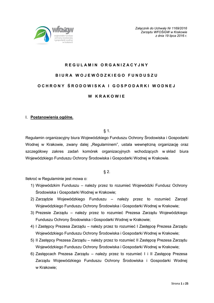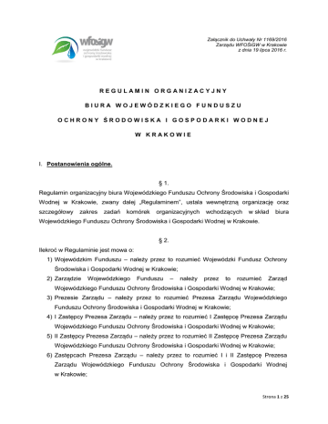 Załącznik do Uchwały Nr 1169/2016 Zarządu WFOŚiGW w Krakowie z dnia 19 lipca 2016 r. REGULAMIN ORGANIZACYJNY BIURA WOJEWÓDZKIEGO FUNDUSZU OCHRONY ŚRODOWISKA I GOSPODARKI WODNEJ W KRAKOWIE I. Postanowienia ogólne. § 1. Regulamin organizacyjny biura Wojewódzkiego Funduszu Ochrony Środowiska i Gospodarki Wodnej w Krakowie, zwany dalej „Regulaminem”, ustala wewnętrzną organizację oraz szczegółowy zakres zadań komórek organizacyjnych wchodzących w skład biura Wojewódzkiego Funduszu Ochrony Środowiska i Gospodarki Wodnej w Krakowie. § 2. Ilekroć w Regulaminie jest mowa o: 1) Wojewódzkim Funduszu – należy przez to rozumieć Wojewódzki Fundusz Ochrony Środowiska i Gospodarki Wodnej w Krakowie; 2) Zarządzie Wojewódzkiego Funduszu – należy przez to rozumieć Zarząd Wojewódzkiego Funduszu Ochrony Środowiska i Gospodarki Wodnej w Krakowie; 3) Prezesie Zarządu – należy przez to rozumieć Prezesa Zarządu Wojewódzkiego Funduszu Ochrony Środowiska i Gospodarki Wodnej w Krakowie; 4) I Zastępcy Prezesa Zarządu – należy przez to rozumieć I Zastępcę Prezesa Zarządu Wojewódzkiego Funduszu Ochrony Środowiska i Gospodarki Wodnej w Krakowie; 5) II Zastępcy Prezesa Zarządu – należy przez to rozumieć II Zastępcę Prezesa Zarządu Wojewódzkiego Funduszu Ochrony Środowiska i Gospodarki Wodnej w Krakowie; 6) Zastępcach Prezesa Zarządu – należy przez to rozumieć I i II Zastępcę Prezesa Zarządu Wojewódzkiego Funduszu Ochrony Środowiska i Gospodarki Wodnej w Krakowie; Strona 1 z 25 7) Główny Księgowy – należy przez to rozumieć Głównego Księgowego Wojewódzkiego Funduszu Ochrony Środowiska i Gospodarki Wodnej w Krakowie; 8) Biurze Wojewódzkiego Funduszu – należy przez to rozumieć wszystkie Zespoły i samodzielne stanowiska pracy wchodzące w skład Wojewódzkiego Funduszu Ochrony Środowiska i Gospodarki Wodnej w Krakowie; 9) Komórce organizacyjnej – należy przez to rozumieć zespół i samodzielne stanowisko pracy w biurze Wojewódzkiego Funduszu; 10) Kierowniku – należy przez to rozumieć kierownika zespołu w biurze Wojewódzkiego Funduszu Ochrony Środowiska i Gospodarki Wodnej w Krakowie; 11) POIiŚ – należy przez to rozumieć Program Operacyjny Infrastruktura i Środowisko 2007-2013; 12) Instytucji Wdrażającej – należy przez to rozumieć Wojewódzki Fundusz jako instytucję wdrażającą POIiŚ 2007-2013; 13) Instytucji Pośredniczącej – należy przez to rozumieć ministra właściwego ds. środowiska; 14) Instytucji Zarządzającej – należy przez to rozumieć ministra właściwego ds. rozwoju regionalnego; 15) Instytucji Certyfikującej – minister właściwy ds. rozwoju regionalnego, którego zadania w tym zakresie wykonuje właściwa komórka organizacyjna; 16) Instytucja Audytowa – należy przez to rozumieć Generalnego Inspektora Kontroli Skarbowej; 17) Porozumieniu - należy przez to rozumieć Porozumienie zawarte w dniu 25 czerwca 2007 r. pomiędzy Wojewódzkim Funduszem Ochrony Środowiska i Gospodarki Wodnej w Krakowie z Instytucją Pośredniczącą – Ministrem Środowiska w sprawie realizacji Programu Operacyjnego „Infrastruktura i Środowisko” dla priorytetów: I – Gospodarka wodno-ściekowa i II – Gospodarka odpadami i ochrona powierzchni ziemi (projekty o wartości poniżej 25 mln euro) wraz z jego aneksami. 18) Umowie o partnerstwie – należy przez to rozumieć Umowę o partnerstwie na rzecz realizacji Projektu pn. „Ogólnopolski system wsparcia doradczego dla sektora publicznego, mieszkaniowego oraz przedsiębiorstw w zakresie efektywności energetycznej oraz OZE” w ramach poddziałania 1.3.3 Programu Operacyjnego Infrastruktura i Środowisko 2014-2020 zawartą w Warszawie dnia 28.04.2016 r. pomiędzy Narodowym Funduszem Ochrony Środowiska i Gospodarki Wodnej a Wojewódzkim Funduszem Ochrony Środowiska i Gospodarki Wodnej w Krakowie; 19) Umowie dotacji celowej – należy przez to rozumieć Umowę dotacji celowej nr 37/DE/2016 zawartą w Warszawie w dniu 09.05.2016 r. między Skarbem Państwa – Ministrem Środowiska a Wojewódzkim Funduszem Ochrony Środowiska i Gospodarki Wodnej w Krakowie, na podstawie której Minister Środowiska udziela Wojewódzkiemu Strona 2 z 25 Funduszowi dotacji celowej na dofinansowanie zadań realizowanych w ramach pełnienia przez Wojewódzki Fundusz funkcji Instytucji Wdrażającej Programu Operacyjnego Infrastruktura i Środowisko 2007-2013. § 3. 1. Wewnętrznymi komórkami organizacyjnymi biura Wojewódzkiego Funduszu mogą być: 1) zespoły - tworzone w celu kompleksowej realizacji zadań o określonej problematyce; 2) samodzielne stanowiska pracy - tworzone w przypadku konieczności organizacyjnego wyodrębnienia określonej problematyki, nie uzasadniającej powołania zespołu; 3) jednoosobowe lub wieloosobowe stanowiska pracy działające w ramach zespołów o których mowa w pkt. 1. 2. Komórki organizacyjne tworzone są z uwzględnieniem: 1) obowiązujących przepisów; 2) potrzeb wynikających z charakteru realizowanych zadań; 3) innych wymagań racjonalnego tworzenia struktur organizacyjnych. § 4. Siedzibą Wojewódzkiego Funduszu jest Kraków. II. Zasady kierowania pracą biura Wojewódzkiego Funduszu i podział kompetencji. § 5. 1. Pracą biura Wojewódzkiego Funduszu kieruje Prezes Zarządu. 2. Prezes Zarządu jest przełożonym pracowników biura Wojewódzkiego Funduszu oraz koordynuje pracę wszystkich komórek organizacyjnych. 3. Prezes Zarządu dokonuje czynności z zakresu prawa pracy. 4. W celu sprawnego funkcjonowania biura Wojewódzkiego Funduszu, Prezes Zarządu wydaje zarządzenia i polecenia służbowe. § 6. 1. Prezes Zarządu może udzielać pełnomocnictw i upoważnień w trybie i na zasadach wynikających z obowiązujących przepisów prawa. 2. W razie potrzeby Prezes Zarządu może powoływać – na czas określony – zespoły zadaniowe (zespoły robocze) lub komisje do załatwienia określonej spr