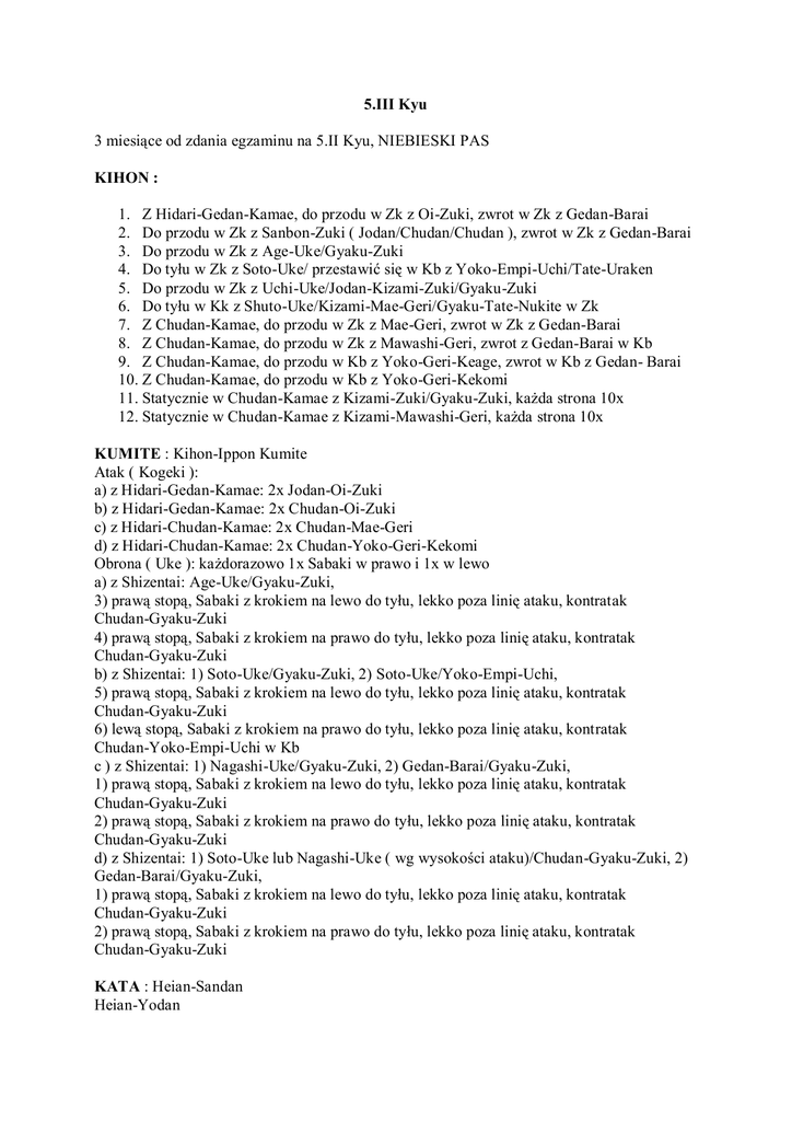 5.III Kyu 3 miesiące od zdania egzaminu na 5.II Kyu, NIEBIESKI PAS KIHON : 1. Z Hidari-Gedan-Kamae, do przodu w Zk z Oi-Zuki, zwrot w Zk z Gedan-Barai 2. Do przodu w Zk z Sanbon-Zuki ( Jodan/Chudan/Chudan ), zwrot w Zk z Gedan-Barai 3. Do przodu w Zk z Age-Uke/Gyaku-Zuki 4. Do tyłu w Zk z Soto-Uke/ przestawić się w Kb z Yoko-Empi-Uchi/Tate-Uraken 5. Do przodu w Zk z Uchi-Uke/Jodan-Kizami-Zuki/Gyaku-Zuki 6. Do tyłu w Kk z Shuto-Uke/Kizami-Mae-Geri/Gyaku-Tate-Nukite w Zk 7. Z Chudan-Kamae, do przodu w Zk z Mae-Geri, zwrot w Zk z Gedan-Barai 8. Z Chudan-Kamae, do przodu w Zk z Mawashi-Geri, zwrot z Gedan-Barai w Kb 9. Z Chudan-Kamae, do przodu w Kb z Yoko-Geri-Keage, zwrot w Kb z Gedan- Barai 10. Z Chudan-Kamae, do przodu w Kb z Yoko-Geri-Kekomi 11. Statycznie w Chudan-Kamae z Kizami-Zuki/Gyaku-Zuki, każda strona 10x 12. Statycznie w Chudan-Kamae z Kizami-Mawashi-Geri, każda strona 10x KUMITE : Kihon-Ippon Kumite Atak ( Kogeki ): a) z Hidari-Gedan-Kamae: 2x Jodan-Oi-Zuki b) z Hidari-Gedan-Kamae: 2x Chudan-Oi-Zuki c) z Hidari-Chudan-Kamae: 2x Chudan-Mae-Geri d) z Hidari-Chudan-Kamae: 2x Chudan-Yoko-Geri-Kekomi Obrona ( Uke ): każdorazowo 1x Sabaki w prawo i 1x w lewo a) z Shizentai: Age-Uke/Gyaku-Zuki, 3) prawą stopą, Sabaki z krokiem na lewo do tyłu, lekko poza linię ataku, kontratak Chudan-Gyaku-Zuki 4) prawą stopą, Sabaki z krokiem na prawo do tyłu, lekko poza linię ataku, kontratak Chudan-Gyaku-Zuki b) z Shizentai: 1) Soto-Uke/Gyaku-Zuki, 2) Soto-Uke/Yoko-Empi-Uchi, 5) prawą stopą, Sabaki z krokiem na lewo do tyłu, lekko poza linię ataku, kontratak Chudan-Gyaku-Zuki 6) lewą stopą, Sabaki z krokiem na prawo do tyłu, lekko poza linię ataku, kontratak Chudan-Yoko-Empi-Uchi w Kb c ) z Shizentai: 1) Nagashi-Uke/Gyaku-Zuki, 2) Gedan-Barai/Gyaku-Zuki, 1) prawą stopą, Sabaki z krokiem na lewo do tyłu, lekko poza linię ataku, kontratak Chudan-Gyaku-Zuki 2) prawą stopą, Sabaki z krokiem na prawo do tyłu, lekko poza linię ataku, kontratak Chudan-Gyaku-Zuki d) z Shizentai: 1) Soto-Uke lub Nagashi-Uke ( wg wysokości ataku)/Chudan-Gyaku-Zuki, 2) Gedan-Barai/Gyaku-Zuki, 1) prawą stopą, Sabaki z krokiem na lewo do tyłu, lekko poza linię ataku, kontratak Chudan-Gyaku-Zuki 2) prawą stopą, Sabaki z krokiem na prawo do tyłu, lekko poza linię ataku, kontratak Chudan-Gyaku-Zuki KATA : Heian-Sandan Heian-Yodan ZNACZENIE SŁÓW : 1. 2. 3. 4. 5. 6. 7. Hansoku-Chui 8. Mienai Mubobi 9. Aiuchi Shikkaku 10. Kiken Shitei-Kata 11. Shobu-Sanbon-Hajime Torimasen 12. Atenai-Yoni Moto-No-Ichi 13. Hachimaki Shobu-Hajime BŁĘDY, KTÓRE NIE POWINNY SIĘ POJAWIĆ : 1. 2. 3. 4. Brak koordynacji technik (nierównoczesne zakończenie kroku i techniki) Brak rozluźnienia w początkowej fazie techniki Niewłaściwe napięcie - Kime Niewłaściwy dystans w czasie ćwiczeń z partnerem
