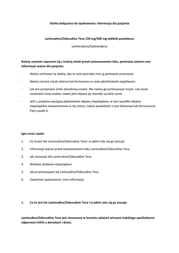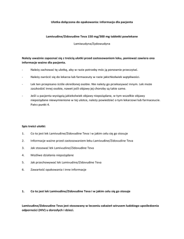 Ulotka dołączona do opakowania: informacja dla pacjenta Lamivudine/Zidovudine Teva 150 mg/300 mg tabletki powlekane Lamiwudyna/Zydowudyna Należy uważnie zapoznać się z treścią ulotki przed zastosowaniem leku, ponieważ zawiera ona informacje ważne dla pacjenta. - Należy zachować tę ulotkę, aby w razie potrzeby móc ją ponownie przeczytać. - Należy zwrócić się do lekarza lub farmaceuty w razie jakichkolwiek wątpliwości. - Lek ten przepisano ściśle określonej osobie. Nie należy go przekazywać innym. Lek może zaszkodzić innej osobie, nawet jeśli objawy jej choroby są takie same. - Jeśli u pacjenta wystąpią jakiekolwiek objawy niepożądane, w tym wszelkie objawy niepożądane niewymienione w tej ulotce, należy powiedzieć o tym lekarzowi lub farmaceucie. Patrz punkt 4. Spis treści ulotki: 1. Co to jest lek Lamivudine/Zidovudine Teva i w jakim celu się go stosuje 2. Informacje ważne przed zastosowaniem leku Lamivudine/Zidovudine Teva 3. Jak stosować lek Lamivudine/Zidovudine Teva 4. Możliwe działania niepożądane 5. Jak przechowywać lek Lamivudine/Zidovudine Teva 6. Zawartość opakowania i inne informacje 1. Co to jest lek Lamivudine/Zidovudine Teva i w jakim celu się go stosuje Lamivudine/Zidovudine Teva jest stosowany w leczeniu zakażeń wirusem ludzkiego upośledzenia odporności (HIV) u dorosłych i dzieci. Lamivudine/Zidovudine Teva zawiera dwie substancje czynne stosowane w leczeniu zakażeń HIV: lamiwudynę i zydowudynę. Obie te substancje należą do grupy leków przeciwretrowirusowych, nazywanych nukleozydowymi inhibitorami odwrotnej transkryptazy (NRTI). Lamivudine/Zidovudine Teva nie powoduje wyleczenia z zakażenia HIV; zmniejsza on liczbę wirusów oraz utrzymuje ją na niskim poziomie. Zwiększa on także liczbę komórek CD4 we krwi. Komórki CD4 to rodzaj białych krwinek, które pełnią istotną rolę, wspomagając zwalczanie zakażeń przez organizm. Nie wszyscy pacjenci reagują na leczenie lekiem Lamivudine/Zidovudine Teva w ten sam sposób. Skuteczność leczenia będzie kontrolowana przez lekarza prowadzącego. 2. Informacje ważne przed zastosowaniem leku Lamivudine/Zidovudine Teva Kiedy nie stosować leku Lamivudine/Zidovudine Teva - Jeśli pacjent ma uczulenie na lamiwudynę lub zydowudynę lub którykolwiek z pozostałych składników tego leku (wymienionych w punkcie 6). - W przypadku bardzo małej liczby krwinek czerwonych (niedokrwistości) lub bardzo małej liczby krwinek białych (neutropenii). Należy skonsultować się z lekarzem prowadzącym, jeśli pacjent przypuszcza, że dotyczą go opisane powyżej okoliczności. Kiedy zachować szczególną ostrożność stosując lek Lamivudine/Zidovudine Teva Niektórzy pacjenci stosujący Lamivudine/Zidovudine Teva lub inne skojarzone leczenie przeciw HIV są bardziej narażeni na wystąpienie ciężkich działań niepożądanych. Pacjent powinien wiedzieć o tym dodatkowym ryzyku: • jeśli kiedykolwiek w przeszłości u pacjenta występowały choroby wątroby, w tym zapalenie wątroby typu B lub C (jeśli pacjent ma zapalenie wątroby typu B, nie powinien przerywać stosowania leku Lamivudine/Zidovudine Teva bez zalecenia lekarza, ponieważ może nastąpić nawrót zapalenia wątroby) • jeśli u pacjenta występują choroby nerek • jeśli pacjent ma dużą nadwagę (szczególnie w przypadku kobiet) • jeśli pacjent choruje na cukrzycę i stosuje insulinę. Należy poinformować lekarza, jeśli którekolwiek z powyższych okoliczności dotyczą pacjenta. Lekarz może w trakcie leczenia zalecić wykonanie dodatkowych badań kontrolnych, w tym badania krwi. Więcej informacji patrz punkt 4. Zwracanie uwagi na ważne objawy U niektórych pacjentów przyjmujących leki stosowane w zakażeniu HIV mogą wystąpić inne powikłania, które mogą być poważne. Pacjent powinien zapoznać się z informacjami o ważnych oznakach i objawach, na które powinien zwrócić uwagę podczas stosowania leku Lamivudine/Zidovudine Teva. Należy przeczytać informację ‘Inne działania niepożądane skojarzonego leczenia zakażeń HIV’ zawartą w punkcie 4 tej ulotki. Ochrona innych ludzi Zakażenie HIV może być przenoszone przez kontakty seksualne z osobami zakażonymi lub przez zakażoną krew (np. poprzez używanie wspólnych igieł do wstrzykiwań). Stosowanie leku Lamivudine/Zidovudine Teva nie zapobiega przeniesieniu wirusa HIV na inne osoby. Aby uchronić inne osoby przed zakażeniem HIV: • należy używać prezerwatywy podczas seksu oralnego i penetracji; • nie należy ryzykować przeniesienia zakażenia przez krew – np. nie używać wspólnych igieł. Stosowanie innych leków Należy poinformować lekarza lub farmaceutę o wszystkich lekach obecnie przyjmowanych lub przyjmowanych ostatnio, w tym lekach pochodzenia roślinnego oraz innych lekach kupionych bez recepty. Jeśli pacjent rozpoczyna stosowanie nowego leku podczas stosowania leku Lamivudine/Zidovudine Teva, należy pamiętać, aby poinformować o tym lekarza lub farmaceutę. Następujących leków nie należy stosować z lekiem Lamivudine/Zidovudine Teva: inne produkty lecznicze zawierające lamiwudynę, stosowane w leczeniu zakażenia HIV lub wirusowego zapalenia wątroby typu B emtrycytabina, stosowana w leczeniu zakażenia HIV stawudyna lub zalcytabina, stosowane w leczeniu zakażeń HIV rybawiryna lub iniekcje gancyklowiru, stosowane w leczeniu zakażeń wirusowych duże dawki ko-trymoksazolu stosowanego jako antybiotyk kladrybina stosowana w leczeniu białaczki włochatokomórkowej. Należy poinformować lekarza prowadzącego, jeśli pacjent jest leczony którymkolwiek z tych leków. Niektóre leki mogą zwiększyć prawdopodobieństwo wystąpienia działań niepożądanych lub nasilić już występujące. Są to: walproinian sodu, stosowany w leczeniu padaczki interferon, stosowany w leczeniu zakażeń wirusowych pirymetamina, stosowana w leczeniu malarii i innych zarażeń pasożytniczych dapson,