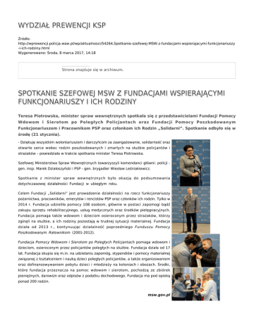 WYDZIAŁ PREWENCJI KSP Źródło: http://wprewencji.policja.waw.pl/wp/aktualnosci/54264,Spotkanie-szefowej-MSW-z-fundacjami-wspierajacymi-funkcjonariuszy -i-ich-rodziny.html Wygenerowano: Środa, 8 marca 2017, 14:18 Strona znajduje się w archiwum. SPOTKANIE SZEFOWEJ MSW Z FUNDACJAMI WSPIERAJĄCYMI FUNKCJONARIUSZY I ICH RODZINY Teresa Piotrowska, minister spraw wewnętrznych spotkała się z przedstawicielami Fundacji Pomocy Wdowom i Sierotom po Poległych Policjantach oraz Fundacji Pomocy Poszkodowanym Funkcjonariuszom i Pracownikom PSP oraz członkom ich Rodzin „Solidarni”. Spotkanie odbyło się w środę (21 stycznia). - Dziękuję wszystkim wolontariuszom i darczyńcom za zaangażowanie, solidarność oraz otwarte serce wobec rodzin poszkodowanych i zmarłych na służbie policjantów i strażaków – powiedziała w trakcie spotkania minister Teresa Piotrowska. Szefowej Ministerstwa Spraw Wewnętrznych towarzyszyli komendanci główni: policji gen. insp. Marek Działoszyński i PSP - gen. brygadier Wiesław Leśniakiewicz. Spotkanie z minister spraw wewnętrznych było okazją do podsumowania dotychczasowej działalności Fundacji w ubiegłym roku. Celem Fundacji „Solidarni” jest prowadzenie działalności na rzecz funkcjonariuszy pożarnictwa, pracowników, emerytów i rencistów PSP oraz członków ich rodzin. Tylko w 2014 r. Fundacja udzieliła pomocy 108 osobom, głównie w postaci zapomogi bądź zakupu sprzętu rehabilitacyjnego, usług medycznych oraz środków pielęgnacyjnych. Fundacja pomaga także wdowom i dzieciom osieroconym przez strażaków, którzy zginęli na służbie, a ich rodziny pozostają w trudnej sytuacji materialnej. Fundacja działa od 2013 r., kontynuując działalność poprzedniego Funduszu Pomocy Poszkodowanym Ratownikom (2001-2012). Fundacja Pomocy Wdowom i Sierotom po Poległych Policjantach pomaga wdowom i dzieciom, osieroconym przez policjantów poległych na służbie. Fundacja działa od 17 lat. Fundacja skupia się m.in. na udzielaniu zapomóg, stypendiów i pomocy materialnej związanej z kształceniem i nauką dzieci poległych policjantów, a także organizowaniem oraz dofinansowywaniem pobytu dzieci i młodzieży na koloniach i obozach. Środki, które fundacja przeznacza na pomoc wdowom i sierotom, pochodzą ze zbiórek pieniężnych, darowizn oraz odpisów z podatku dochodowego. Fundacja ma pod opieką ponad 200 rodzin. msw.gov.pl Ocena: 0/5 (0) Tweetnij