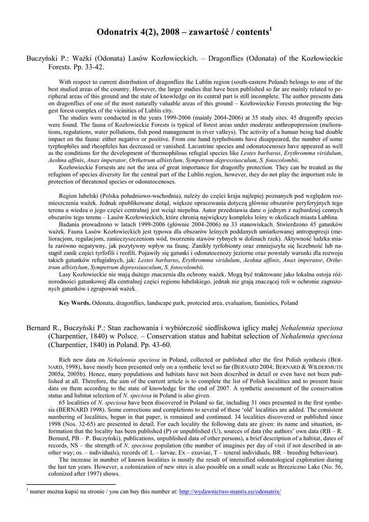 Odonatrix 4(2), 2008 – zawartość / contents1 Buczyński P.: WaŜki (Odonata) Lasów Kozłowieckich. – Dragonflies (Odonata) of the Kozłowieckie Forests. Pp. 33-42. With respect to current distribution of dragonflies the Lublin region (south-eastern Poland) belongs to one of the best studied areas of the country. However, the larger studies that have been published so far are mainly related to peripheral areas of this ground and the state of knowledge on its central part is still incomplete. The author presents data on dragonflies of one of the most naturally valuable areas of this ground – Kozłowieckie Forests protecting the biggest forest complex of the vicinities of Lublin city. The studies were conducted in the years 1999-2006 (mainly 2004-2006) at 35 study sites. 45 dragonfly species were found. The fauna of Kozłowieckie Forests is typical of forest areas under moderate anthropopression (meliorations, regulations, water pollutions, fish pond management in river valleys). The activity of a human being had double impact on the fauna: either negative or positive. From one hand tyrphobionts have disappeared, the number of some tyrphophiles and rheophiles has decreased or vanished. Lacustrine species and odonatocenoses have appeared as well as the conditions for the development of thermophilous refugial species like Lestes barbarus, Erythromma viridulum, Aeshna affinis, Anax imperator, Orthetrum albistylum, Sympetrum depressiusculum, S. fonscolombii. Kozłowieckie Forsests are not the area of great importance for dragonfly protection. They can be treated as the refugium of species diversity for the central part of the Lublin region, however, they do not play the important role in protection of threatened species or odonatocenoses. Region lubelski (Polska południowo-wschodnia), naleŜy do części kraju najlepiej poznanych pod względem rozmieszczenia waŜek. Jednak opublikowane dotąd, większe opracowania dotyczą głównie obszarów peryferyjnych tego terenu a wiedza o jego części centralnej jest wciąŜ niepełna. Autor przedstawia dane o jednym z najbardziej cennych obszarów tego terenu – Lasów Kozłowieckich, które chronią największy kompleks leśny w okolicach miasta Lublina. Badania prowadzono w latach 1999-2006 (głównie 2004-2006) na 33 stanowiskach. Stwierdzono 45 gatunków waŜek. Fauna Lasów Kozłowieckich jest typowa dla obszarów leśnych poddanych umiarkowanej antropopresji (melioracjom, regulacjom, zanieczyszczeniom wód, tworzeniu stawów rybnych w dolinach rzek). Aktywność ludzka miała zarówno negatywny, jak pozytywny wpływ na faunę. Zanikły tyrfobionty oraz zmniejszyła się liczebność lub nastąpił zanik części tyrfofili i reofili. Pojawiły się gatunki i odonatocenozy jeziorne oraz powstały warunki dla rozwoju takich gatunków refugialnych, jak: Lestes barbarus, Erythromma viridulum, Aeshna affinis, Anax imperator, Orthetrum albistylum, Sympetrum depressiusculum, S. fonscolombii. Lasy Kozłowieckie nie mają duŜego znaczenia dla ochrony waŜek. Mogą być traktowane jako lokalna ostoja róŜnorodności gatunkowej dla centralnej części regionu lubelskiego, jednak nie grają znaczącej roli w ochronie zagroŜonych gatunków i zgrupowań waŜek. Key Words. Odonata, dragonflies, landscape park, protected area, evaluation, faunistics, Poland Bernard R., Buczyński P.: Stan zachowania i wybiórczość siedliskowa iglicy małej Nehalennia speciosa (Charpentier, 1840) w Polsce. – Conservation status and habitat selection of Nehalennia speciosa (Charpentier, 1840) in Poland. Pp. 43-60. Rich new data on Nehalennia speciosa in Poland, collected or published after the first Polish synthesis (BER1998), have mostly been presented only on a synthetic level so far (BERNARD 2004; BERNARD & WILDERMUTH 2005a, 2005b). Hence, many populations and habitats have not been described in detail or even have not been published at all. Therefore, the aim of the current article is to complete the list of Polish localities and to present basic data on them according to the state of knowledge for the end of 2007. A synthetic assessment of the conservation status and habitat selection of N. speciosa in Poland is also given. 65 localities of N. speciosa have been discovered in Poland so far, including 31 ones presented in the first synthesis (BERNARD 1998). Some corrections and completions to several of these ‘old’ localities are added. The consistent numbering of localities, begun in that paper, is remained and continued. 34 localities discovered or published since 1998 (Nos. 32-65) are presented in detail. For each locality the following data are given: its name and situation, information that the locality has been published (P) or unpublished (U), sources of data (the authors’ own data (RB – R. Bernard, PB – P. Buczyński), publications, unpublished data of other persons), a brief description of a habitat, dates of records, NS – the strength of N. speciosa population (the number of imagines per day of visit if not described in another way; os. – individuals), records of: L – larvae, Ex – exuviae, T – teneral individuals, BR – breeding behaviour). The increase in number of known localities is mostly the result of intensified odonatological exploration during the last ten years. However, a colonization of new sites is also possible on a small scale as Brzeziczno Lake (No. 56, colonized after 1997) shows. NARD, 1 numer moŜna kupić na stronie / you can buy this number at: http://wydawnictwo-mantis.eu/odonatrix/ 38 local populations recorded since 1990 are treated current, although one of them (No. 51) is already extinct. Considering insufficiently explored areas in the North and East, ca 50 current localities are expected. The current distribution of N. speciosa in Poland is almost confined to the North above 53ºN (rich in primary habitats) and the local far East (fig. 1). Unexpectedly, the species has recently been rediscovered in the 