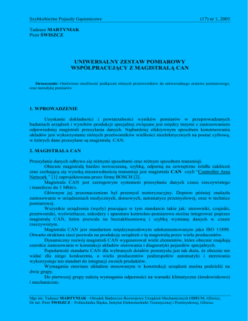 Szybkobieżne Pojazdy Gąsienicowe (17) nr 1, 2003 Tadeusz MARTYNIAK Piotr ŚWISZCZ UNIWERSALNY ZESTAW POMIAROWY WSPÓŁPRACUJĄCY Z MAGISTRALĄ CAN Streszczenie: Omówiono możliwość podłączeń różnych przetworników do uniwersalnego zestawu pomiarowego, oraz metodykę pomiarów 1. WPROWADZENIE Uzyskanie dokładności i powtarzalności wyników pomiarów w przeprowadzanych badaniach urządzeń i wyrobów produkcji specjalnej związane jest między innymi z zastosowaniem odpowiedniej magistrali przesyłania danych. Najbardziej efektywnym sposobem konstruowania układów jest wykorzystanie różnych przetworników wielkości nieelektrycznych na postać cyfrową, w których dane przesyłane są magistralą CAN. 2. MAGISTRALA CAN Przesyłanie danych odbywa się różnymi sposobami oraz różnym sposobem transmisji. Obecnie magistralą bardzo nowoczesną, szybką, odporną na zewnętrzne źródła zakłóceń oraz cechującą się wysoką niezawodnością transmisji jest magistrala CAN czyli “Controller Area Network ” [1] zaprojektowana przez firmę BOSCH [2]. Magistrala CAN jest szeregowym systemem przesyłania danych czasu rzeczywistego i transferze do 1 Mbit/s. Głównym jej przeznaczeniem był przemysł motoryzacyjny. Dopiero później znalazła zastosowanie w urządzeniach medycznych, domowych, automatyce przemysłowej, oraz w technice pomiarowej. Wszystkie urządzenia (węzły) pracujące w tym standarcie takie jak: sterowniki, czujniki, przetworniki, wyświetlacze, enkodery i aparatura kontrolno-pomiarowa można integrować poprzez magistralę CAN, która pozwala na bezzakłóceniową i szybką wymianę danych w czasie rzeczywistym. Magistrala CAN jest standartem międzynarodowym udokumentowanym jako ISO 11898. Otwarta struktura sieci pozwala na produkcję urządzeń z tą magistralą przez wielu producentów. Dynamiczny rozwój magistrali CAN wygenerował wiele elementów, które obecnie znajdują szerokie zastosowanie w konstukcji układów sterowania i diagnostyki pojazdów specjalnych. Popularność standartu CAN dla wybranych działów przemysłu jest tak duża, że obecnie nie widać dla niego konkurenta, a wielu producentów podzespołów automatyki i sterowania wykorzystuje ten standart do integracji swoich produktów. Wymagania stawiane układom stosowanym w konstrukcji urządzeń można podzielić na dwie grupy. Do pierwszej grupy należą wymagania odporności na warunki klimatyczne (środowiskowe) i mechaniczne. Mgr inż. Tadeusz MARTYNIAK - Ośrodek Badawczo-Rozwojowy Urządzeń Mechanicznych OBRUM, Gliwice, Dr inż. Piotr ŚWISZCZ – Politechnika Śląska, Instytut Elektrotechniki Teoretycznej i Przemysłowej, Gliwice Tadeusz MARTYNIAK, Piotr ŚWISZCZ Do drugiej grupy należą: podatność na diagnostykę, technikę pomiarową, język programowania oraz możliwość współpracy z urządzeniami oferowanymi przez różnych producentów. Obecnie standard CAN jest liderem w konstrukcjach pojazdów cywilnych (samochody osobowe, ciężarowe i autokary), a ostatnio również w pojazdach specjalnych [8]. Po dokonaniu obserwacji wymagań stawianym współczesnym pojazdom inżynieryjnym i logistycznym wydaje się, że wykorzystanie cyfrowych sieci do integracji zróżnicowanego wyposażenia jest jedyną słusznie obraną drogą. Dlatego celowe jest wprowadzenie rozwiązań pozwalających na elastyczne projektowanie systemów, których rozwój nie jest związany z dużymi nakładami przy modernizacjach pojazdów. Do podstawowych zalet wynikających z zastosowania magistrali CAN w instalacjach wyrobów i technice pomiarowej (połączenia sieciowe) należą: 1. Niezawodność – transmisja w sieci kontynuowana jest nawet w przypadku krótkotrwałego przerwania jednego z przewodów transmisji lub jego zwarcia do masy lub zasilania. 2. Odporność na zakłócenia – stosuje się połączenia za pomocą tzw. skrętki dwuprzewodowej ekranowanej lub nieekranowanej. Dane w postaci bitowej są kodowane w systemie NRZ (non Return to Zero) i przesyłane różnicowo. Taki sposób kodowania zapewnia minimalną liczbę przejść przez zero i bardzo dużą odporność na zakłócenia zewnętrzne (w mobilnych zastosowaniach wymagana jest wysoka niezawodność w transmisji danych). 3. Oszczędność okablowania – zmniejsza ilość przewodów łączących elementy wyposażenia elektrycznego. 4. Kompatybilność – standard magistrali CAN jest protokołem otwartym, a zatem przetworniki urządzeń wykonawczych różnych producentów podzespołów automatyki i sterowania mogą współpracować ze sobą bez żadnych konfliktów. 5. Prostota obsługi i eksploatacji – standard magistrali CAN pozwala na szybkie przeszkolenie w zakresie obsługi urządzeń. 3. ZASTOSOWANIE Nieustanny rozwój techniki powoduje, że w wyrobach specjalnych stosuje się urządzenia nowej generacji, które podlegają szeregom specjalistycznych badań. Ponadto brak możliwości zakupu specjalistycznych przyrządów pomiarowych niejednokrotnie stanowił czynnik nowatorski dla badaczy-pomiarowców, automatyków i programistów. Potrzeba wykonania dokładnego pomiaru kąta przechyłu osi Ramowego Układu Wsporczego (RUW) w wyrobach SPR i BREŃ w płaszczyźnie X-Y spowodowała, że autorzy referatu przeprowadzili analizę techniczną i ekonomiczną dostępnych na rynku czujników kąta, kierując się kryteriami dokładności pomiaru oraz ceny. Ostatecznie do wykonania zestawu pomiarowego zwanego dalej uniwersalnym zostały dobrane następujące elementy firmy Ifm Electronic GmbH - Niemcy[3] współpracujące z magistralą CAN [4]: sterownik CR0501 (rys.1), wyświetlacz graficzny CR1001 (rys.2), przetwornik kąta CR2101 (rys.3), dodatkowy osprzęt, napisane oprogramowanie do sterownika i wyświetlacza. Uniwersalny zestaw pomiarowy współtracujący z magistralą CAN Dane techniczne ww. urządzeń podano w tablicy: CR0501 – STEROWNIK 1. Wejścia - 8 cyfrowych typu L, - 8 impulsowych 0 - 50 kHz, - 2 wejścia analo