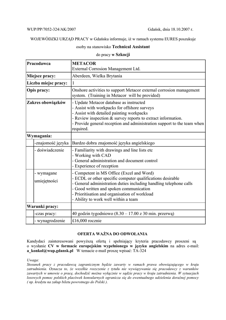 WUP/PP/7052-324/AK/2007 Gdańsk, dnia 18.10.2007 r. WOJEWÓDZKI URZĄD PRACY w Gdańsku informuje, iż w ramach systemu EURES poszukuje osoby na stanowisko Technical Assistant do pracy w Szkocji Pracodawca METACOR External Corrosion Management Ltd. Miejsce pracy: Aberdeen, Wielka Brytania Liczba miejsc pracy: 1 Opis pracy: Onshore activities to support Metacor external corrosion management system. (Training in Metacor will be provided) Zakres obowiązków - Update Metacor database as instructed - Assist with workpacks for offshore surveys - Assist with detailed painting workpacks - Review inspection & survey reports to extract information. - Provide general reception and administration support to the team when required. Wymagania: -znajomość języka Bardzo dobra znajomość języka angielskiego - doświadczenie - Familiarity with drawings and line lists etc - Working with CAD - General administration and document control - Experience of reception - wymagane - Competent in MS Office (Excel and Word) - ECDL or other specific computer qualifications desirable - General administration duties including handling telephone calls - Good written and spoken communication - Prioritisation and organisation of workload - Ability to work well within a team umiejętności Warunki pracy: -czas pracy: 40 godzin tygodniowo (8.30 – 17.00 z 30 min. przerwą) - wynagrodzenie £16,000 rocznie OFERTA WAŻNA DO ODWOŁANIA Kandydaci zainteresowani powyższą ofertą i spełniający kryteria pracodawcy proszeni są o wysłanie CV w formacie europejskim wypełnionego w języku angielskim na adres e-mail: [email protected] W temacie e-mail proszę wpisać: TA-324 Uwaga: Stosunek pracy z pracodawcą zagranicznym będzie zawarty w ramach prawa obowiązującego w kraju zatrudnienia. Oznacza to, że wszelkie roszczenie z tytułu nie wywiązywania się pracodawcy z warunków zawartych w umowie o pracę, dochodzić można wyłącznie w sądzie pracy w kraju zatrudnienia. W sytuacjach losowych pomoc polskich placówek konsularnych ogranicza się do ewentualnego udzielenia doraźnej pomocy ( np. kredytu na zakup biletu powrotnego do Polski ).