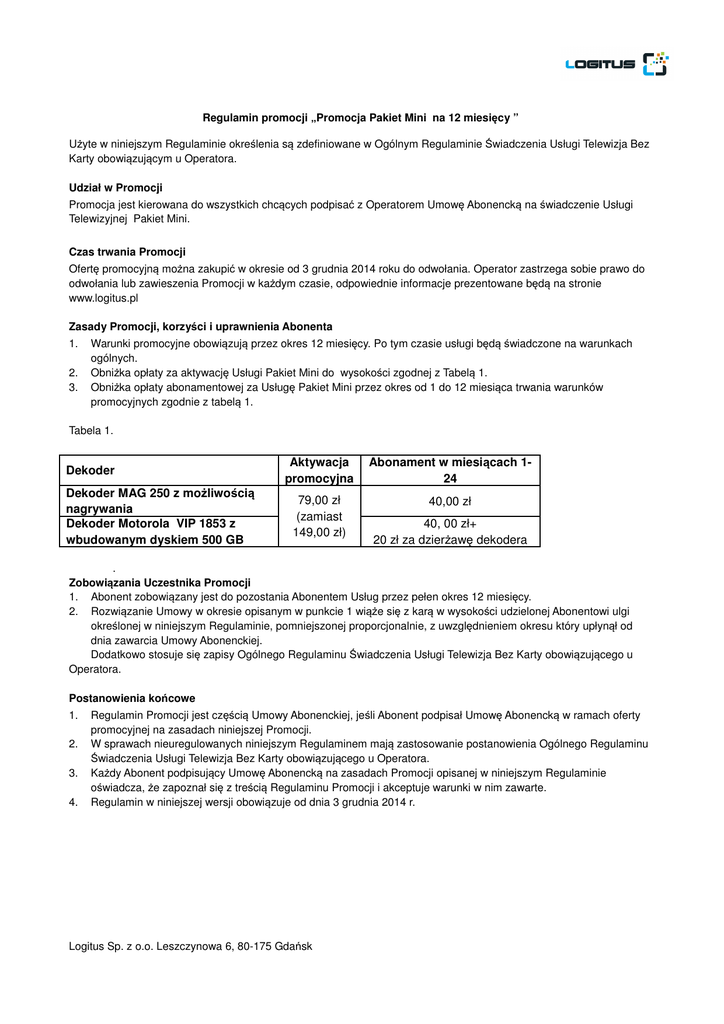 Regulamin promocji „Promocja Pakiet Mini na 12 miesięcy ” Użyte w niniejszym Regulaminie określenia są zdefiniowane w Ogólnym Regulaminie Świadczenia Usługi Telewizja Bez Karty obowiązującym u Operatora. Udział w Promocji Promocja jest kierowana do wszystkich chcących podpisać z Operatorem Umowę Abonencką na świadczenie Usługi Telewizyjnej Pakiet Mini. Czas trwania Promocji Ofertę promocyjną można zakupić w okresie od 3 grudnia 2014 roku do odwołania. Operator zastrzega sobie prawo do odwołania lub zawieszenia Promocji w każdym czasie, odpowiednie informacje prezentowane będą na stronie www.logitus.pl Zasady Promocji, korzyści i uprawnienia Abonenta 1. 2. 3. Warunki promocyjne obowiązują przez okres 12 miesięcy. Po tym czasie usługi będą świadczone na warunkach ogólnych. Obniżka opłaty za aktywację Usługi Pakiet Mini do wysokości zgodnej z Tabelą 1. Obniżka opłaty abonamentowej za Usługę Pakiet Mini przez okres od 1 do 12 miesiąca trwania warunków promocyjnych zgodnie z tabelą 1. Tabela 1. Dekoder Dekoder MAG 250 z możliwością nagrywania Dekoder Motorola VIP 1853 z wbudowanym dyskiem 500 GB Aktywacja promocyjna Abonament w miesiącach 124 79,00 zł (zamiast 149,00 zł) 40,00 zł 40, 00 zł+ 20 zł za dzierżawę dekodera . Zobowiązania Uczestnika Promocji 1. Abonent zobowiązany jest do pozostania Abonentem Usług przez pełen okres 12 miesięcy. 2. Rozwiązanie Umowy w okresie opisanym w punkcie 1 wiąże się z karą w wysokości udzielonej Abonentowi ulgi określonej w niniejszym Regulaminie, pomniejszonej proporcjonalnie, z uwzględnieniem okresu który upłynął od dnia zawarcia Umowy Abonenckiej. Dodatkowo stosuje się zapisy Ogólnego Regulaminu Świadczenia Usługi Telewizja Bez Karty obowiązującego u Operatora. Postanowienia końcowe 1. 2. 3. 4. Regulamin Promocji jest częścią Umowy Abonenckiej, jeśli Abonent podpisał Umowę Abonencką w ramach oferty promocyjnej na zasadach niniejszej Promocji. W sprawach nieuregulowanych niniejszym Regulaminem mają zastosowanie postanowienia Ogólnego Regulaminu Świadczenia Usługi Telewizja Bez Karty obowiązującego u Operatora. Każdy Abonent podpisujący Umowę Abonencką na zasadach Promocji opisanej w niniejszym Regulaminie oświadcza, że zapoznał się z treścią Regulaminu Promocji i akceptuje warunki w nim zawarte. Regulamin w niniejszej wersji obowiązuje od dnia 3 grudnia 2014 r. Logitus Sp. z o.o. Leszczynowa 6, 80-175 Gdańsk