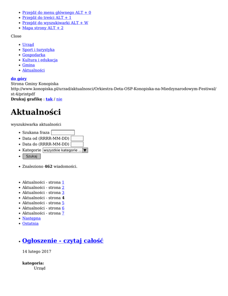 Przejdź do menu głównego ALT + 0 Przejdź do treści ALT + 1 Przejdź do wyszukiwarki ALT + W Mapa strony ALT + 2 Close Urząd Sport i turystyka Gospodarka Kultura i edukacja Gmina Aktualności do góry Strona Gminy Konopiska http://www.konopiska.pl/urzad/aktualnosci/Orkiestra-Deta-OSP-Konopiska-na-Miedzynarodowym-Festiwal/ st:4/printpdf Drukuj grafikę : tak / nie Aktualności wyszukiwarka aktualności Szukana fraza Data od (RRRR-MM-DD) Data do (RRRR-MM-DD) Kategorie wszystkie kategorie ... ▼ Szukaj Znaleziono 462 wiadomości. Aktualności - strona 1 Aktualności - strona 2 Aktualności - strona 3 Aktualności - strona 4 Aktualności - strona 5 Aktualności - strona 6 Aktualności - strona 7 Następna Ostatnia Ogłoszenie - czytaj całość 14 lutego 2017 kategoria: Urząd 14 lutego 2017 roku, została złożona oferta przez Gminny Ludowy Klub Sportowy „LOT” Konopiska na realizację zadania publicznego z zakresu upowszechniania kultury fizycznej i sportu: pt. Finał, Finałów Konopiska Cup 2017 Ogłoszenie Ogłoszenie - czytaj całość Nadzwyczajna Sesja Rady Gminy Konopiska - czytaj całość 11 lutego 2017 kategoria: Urząd 10 lutego 2017 roku na nadzwyczajnej Sesji Rady Gminy Konopiska Stanisław Sączek na mocy Uchwały Rady został wpisany do Księgi Zasłużonych dla Gminy Konopiska. Radni podjęli też drugą uchwałę nadania nazwy rondu w Rększowicach imienia biskupa Franciszka Musiela. To bardzo ważne uchwały, które zostały podjęte. Nadzwyczajna Sesja Rady Gminy Konopiska Nadzwyczajna Sesja Rady Gminy Konopiska - czytaj całość Obwieszczenie - czytaj całość 10 lutego 2017 kategoria: Urząd Obwieszczenie Wójta Gminy Konopiska Obwieszczenie Obwieszczenie - czytaj całość Sprostowanie - czytaj całość 10 lutego 2017 kategoria: Urząd Sprostowanie obwieszczenia z dnia 7 lutego 2017 r. Sprostowanie Sprostowanie - czytaj całość Krzysztof Smela nowym Starostą Częstochowskim - czytaj całość 09 lutego 2017 kategoria: Urząd 9 lutego na XXI sesji Rady Powiatu Krzysztof Smela został nowym starostą częstochowskim. Poprzednik Andrzej Kwapisz z dniem 5 lutego 2017r. złożył rezygnację z powodów zdrowotnych. Andrzej Kwapisz był starostą częstochowskim przez trzy kadencje. Radni najpierw przyjęli rezygnację dotychczasowego, a później powołali następcę. Krzysztof Smela nowym Starostą Częstochowskim Krzysztof Smela nowym Starostą Częstochowskim - czytaj całość Komunikat - Zmiana przepisów edukacyjnych - czytaj całość 09 lutego 2017 kategoria: Kultura i Edukacja Terminy rekrutacji do przedszkoli, oddziałów przedszkolnych w szkołach podstawowych i do klas I szkół podstawowych na rok szkolny 2017/2018 ulegają przesunięciu. Komunikat - Zmiana przepisów edukacyjnych Komunikat - Zmiana przepisów edukacyjnych - czytaj całość Dzień Babci i Dziadka w GCKiR - czytaj całość 09 lutego 2017 kategoria: Kultura i Edukacja Tak wiele zawdzięczamy naszym babciom i dziadkom, dlatego warto uczcić ten dzień w szczególny sposób!!! Dzień Babci i Dziadka w GCKiR Dzień Babci i Dziadka w GCKiR - czytaj całość Ptasia grypa - czytaj całość 09 lutego 2017 kategoria: Urząd W związku z zagrożeniem wystąpienia na naszym terenie wysoce zjadliwej grypy ptaków (HPAI), podtypu H5N8 hodowcy drobiu powinni zachowywać szczególną ostrożność i stosować odpowiednie środki bioasekuracji minimalizujące ryzyko przeniesienia wirusa grypy ptaków do gospodarstwa Ptasia grypa Ptasia grypa - czytaj całość "Bractwo w biznesie" - czytaj całość 09 lutego 2017 kategoria: Urząd Zarząd Lokalnej Grupy Działania „Bractwo Kuźnic” w ramach realizacji „Planu Komunikacji” serdecznie zaprasza na bezpłatne szkolenie pod hasłem "Bractwo w biznesie", które odbędzie się 15.02.2017 r. (środa) godzina 12.00 w sali sesyjnej Urzędu Gminy Poczesna ul. Wolności 2. "Bractwo w biznesie" "Bractwo w biznesie" - czytaj całość OGŁOSZENIE KONKURSU - czytaj całość 08 lutego 2017 kategoria: Kultura i Edukacja Wójt Gminy Konopiska, ogłasza otwarty konkurs ofert na realizację zadań publicznych w zakresie kultury i sztuki oraz kultury fizycznej i sportu na 2017 rok OGŁOSZENIE KONKURSU OGŁOSZENIE KONKURSU - czytaj całość Aktualności - strona 1 Aktualności - strona 2 Aktualności - strona 3 Aktualności - strona 4 Aktualności - strona 5 Aktualności - strona 6 Aktualności - strona 7 Następna Ostatnia