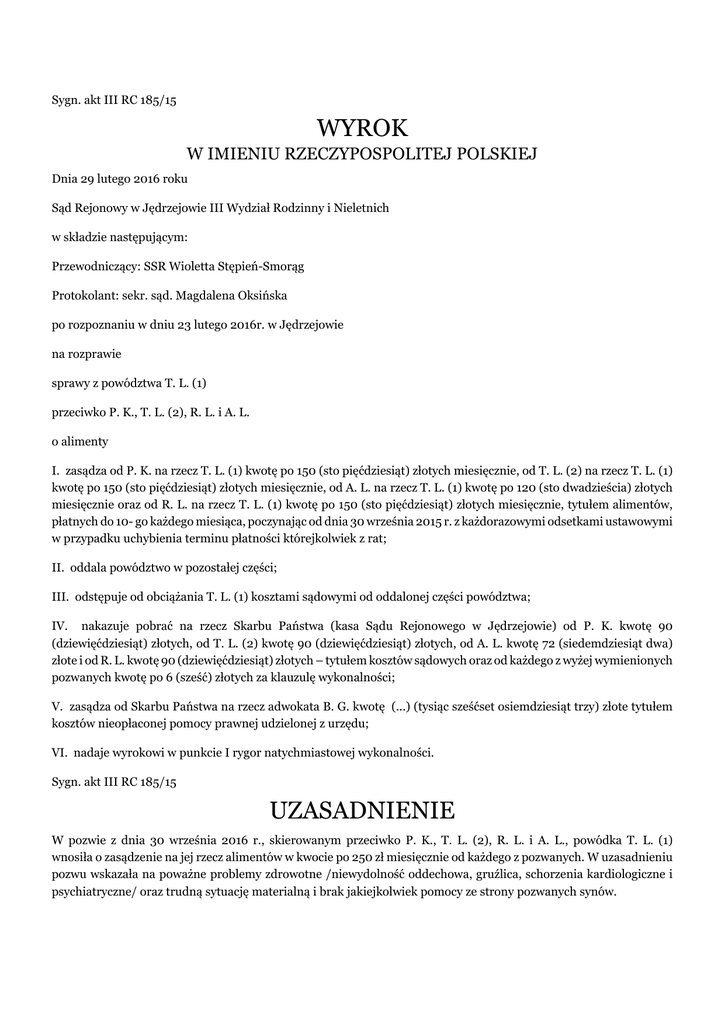 Sygn. akt III RC 185/15 WYROK W IMIENIU RZECZYPOSPOLITEJ POLSKIEJ Dnia 29 lutego 2016 roku Sąd Rejonowy w Jędrzejowie III Wydział Rodzinny i Nieletnich w składzie następującym: Przewodniczący: SSR Wioletta Stępień-Smorąg Protokolant: sekr. sąd. Magdalena Oksińska po rozpoznaniu w dniu 23 lutego 2016r. w Jędrzejowie na rozprawie sprawy z powództwa T. L. (1) przeciwko P. K., T. L. (2), R. L. i A. L. o alimenty I. zasądza od P. K. na rzecz T. L. (1) kwotę po 150 (sto pięćdziesiąt) złotych miesięcznie, od T. L. (2) na rzecz T. L. (1) kwotę po 150 (sto pięćdziesiąt) złotych miesięcznie, od A. L. na rzecz T. L. (1) kwotę po 120 (sto dwadzieścia) złotych miesięcznie oraz od R. L. na rzecz T. L. (1) kwotę po 150 (sto pięćdziesiąt) złotych miesięcznie, tytułem alimentów, płatnych do 10- go każdego miesiąca, poczynając od dnia 30 września 2015 r. z każdorazowymi odsetkami ustawowymi w przypadku uchybienia terminu płatności którejkolwiek z rat; II. oddala powództwo w pozostałej części; III. odstępuje od obciążania T. L. (1) kosztami sądowymi od oddalonej części powództwa; IV. nakazuje pobrać na rzecz Skarbu Państwa (kasa Sądu Rejonowego w Jędrzejowie) od P. K. kwotę 90 (dziewięćdziesiąt) złotych, od T. L. (2) kwotę 90 (dziewięćdziesiąt) złotych, od A. L. kwotę 72 (siedemdziesiąt dwa) złote i od R. L. kwotę 90 (dziewięćdziesiąt) złotych – tytułem kosztów sądowych oraz od każdego z wyżej wymienionych pozwanych kwotę po 6 (sześć) złotych za klauzulę wykonalności; V. zasądza od Skarbu Państwa na rzecz adwokata B. G. kwotę (...) (tysiąc sześćset osiemdziesiąt trzy) złote tytułem kosztów nieopłaconej pomocy prawnej udzielonej z urzędu; VI. nadaje wyrokowi w punkcie I rygor natychmiastowej wykonalności. Sygn. akt III RC 185/15 UZASADNIENIE W pozwie z dnia 30 września 2016 r., skierowanym przeciwko P. K., T. L. (2), R. L. i A. L., powódka T. L. (1) wnosiła o zasądzenie na jej rzecz alimentów w kwocie po 250 zł miesięcznie od każdego z pozwanych. W uzasadnieniu pozwu wskazała na poważne problemy zdrowotne /niewydolność oddechowa, gruźlica, schorzenia kardiologiczne i psychiatryczne/ oraz trudną sytuację materialną i brak jakiejkolwiek pomocy ze strony pozwanych synów. Pozwani T. K. i A. L. uznali powództwo do kwoty po 100 zł miesięcznie. Natomiast pozwani A. L. i R. L. wnosili o oddalenie powództwa w całości. Wszyscy przyznali, że nie pomagają matce finansowo, ani w żaden inny sposób, ale jednocześnie podkreślali, że zerwali kontakty z powódką z jej winy i ze względu na skomplikowane relacje rodzinne. W ocenie pozwanych T. L. (1) nigdy nie była dobrą matką. Nadużywała alkoholu i nie dbała o zdrowie, stąd jej obecne problemy. T. L. (2) i A. L. zarzucili ponadto powódce, że nie zajmowała się nimi w dzieciństwie, lecz pozostawiła ich w G. pod opieką i na utrzymaniu macierzystych dziadków, na których scedowała obowiązki rodzicielskie. Pozwani powoływali się także na swoją sytuację materialną i rodzinną. Sąd ustalił następujący stan faktyczny : T. L. (1) ma 58 lat. Nie ma wykształcenia, ani żadnego wyuczonego zawodu. Od 10 lat żyje w faktycznej separacji z mężem J. L.. Otrzymuje od niego alimenty w kwocie po 500 zł miesięcznie, zasądzone wyrokiem zaocznym Sądu Rejonowego w Jędrzejowie z 19 maja 2011r., sygn. akt III RC 54/11. Małżonkowie mieszkają po sąsiedzku w T. w mieszkaniach socjalnych, ale powódka nie może liczyć na żadną pomoc ze strony męża-alkoholika. Sama /czasem ze wsparciem finansowym córek/ reguluje opłaty związane z utrzymaniem mieszkania /czynsz, woda i ścieki - około 130 zł łącznie co miesiąc, prąd i gaz – około 180 zł co dwa miesiące, opał – około 1000 zł rocznie/. T. L. (1) jest poważnie chora. Od wielu lat /od około 1994 r./ cierpi na astmę i przewlekłą obturacyjną chorobę płuc. Kilkakrotnie była hospitalizowana / w 2008 r. była leczona z powodu gruźlicy naciekowej płuca prawego /. Mimo duszności i postępującej astmy powódka nadal paliła nałogowo papierosy i nie stroniła od alkoholu. W czerwcu 2015 r. trafiła do szpitala w C. w związku z niewydolnością oddechową. Tam rozpoznano gruźlicę płuc w zaawansowanym stadium, prątkującą. Ponadto powódka cierpi na schorzenia kardiologiczne /uszkodzenie mięśnia sercowego w okresie niewydolności krążenia, arytmię, napadowe migotanie przedsionków / i zaburzenia depresyjnolękowe. Przez trzy miesiące T. L. (1) była hospitalizowana w związku z leczeniem gruźlicy, a następnie przez około dwa miesiące przebywała u swojej córki A. P., która się nią opiekowała. Po opuszczeniu szpitala powódka była bardzo osłabiona, wymagała specjalnej diety białkowej i pomocy przy codziennych czynnościach. Pod koniec października 2015 r., kiedy poczuła się lepiej, wróciła do Tarnawy i obecnie mieszka sama. Powódka wymaga systematycznego leczenia pulmonologicznego i kardiologicznego. Leki na astmę, które musi stale zażywać są częściowo refundowane, a pozostałe kosztują około 130-150 zł miesięcznie, lub więcej, jeśli dojdzie do jakichś infekcji, na które T. l. jest bardzo podatna. Stan zdrowia powódki pogarsza się. Ze względu na utrzymującą się niewydolność oddechową T. L. (1) została zakwalifikowana od stycznia 2016 r. do terapii tlenem / (...) /. Przez 15 godzin dziennie musi korzystać z tlenu. Bez tego nie może funkcjonować. Koszt utrzymania T. L. (1) w dacie wniesienia pozwu wynosił około 1200 zł miesięcznie /lub więcej w razie infekcji/. Od stycznia 2016 r. potrzeby powódki wzrosły w związku z wydatkami na terapię tlenową / większe zużycie prądu oraz koszty zakupu wody destylowanej do aparatury tlenowej /. T. L. (1) nie ma żadnego majątku, ani oszczędności. Zwracała się do ośrodka pomocy społecznej o przyznanie świadczeń socjalnych, lecz usłyszała, że ma 