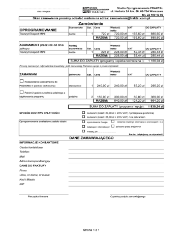 ........................................................... Studio Oprogramowania FRAKTAL ul. Herbsta 2A lok. 68, 02-784 Warszawa tel. 22 490 43 86 data i miejsce Skan zamówienia prosimy odesłać mailem na adres: [email protected] Zamówienie OPROGRAMOWANIE Stanowisko Szt. 1 Tranzyt Eksport MINI każde ABONAMENT przez rok od dnia zakupu Rodzaj stanowiska Tranzyt Eksport MINI każde Szt. 1 Cena Wartość netto 720 zł RAZEM: Cena 720,00 zł 720,00 zł Wartość netto 228 zł RAZEM: VAT DO ZAPŁATY 165,60 zł 165,60 zł VAT 228,00 zł 228,00 zł 885,60 zł 885,60 zł DO ZAPŁATY 52,44 zł 52,44 zł 280,44 zł 280,44 zł SUMA DO ZAPŁATY (programy i opieka techniczna I): 1 166,04 zł Proszę zaznaczyć odpowiednie kwadraty, jeśli zamawiają Państwo opcje z poniższej tabeli ZAMAWIAM □ Rozszerzenie abonamentu do □ Pakiet 2 godzin szkolenia zdalnego z POZIOMU II (pomoc techniczna) użytkowania programu SPOSÓB DOSTAWY I PŁATNOŚCI Oprogramowanie znalezione zostało dzięki: jednostka Szt. Cena Wartość netto VAT DO ZAPŁATY stanowisko 1 240,00 zł 240,00 zł 55,20 zł 295,20 zł godzina 2 150,00 zł RAZEM: 300,00 zł 540,00 zł 69,00 zł 124,20 zł 369,00 zł 664,20 zł SUMA DO ZAPŁATY (programy i opcje): 1 830,24 zł kurierem (koszt: 20,00 zł + 23% VAT) / przedpłata (proforma) kurierem (koszt: 25,00 zł + 23% VAT) / za pobraniem wyszukiwarce Google katalogom internetowym □ □ reklamie (mailingi, informacje o promocjach i in.) polecone przez znajomych inaczej, jak . Bardzo dziękujemy za odpowiedź! DANE ZAMAWIAJĄCEGO INFORMACJE KONTAKTOWE Osoba kontaktowa Telefon: Mail Adres korespondencyjny DANE DO FAKTURY Firma Ulica, nr domu, nr lokalu Kod i Miasto NIP Pieczątka firmowa Czytelny podpis zamawiającego Strona 1 z 1