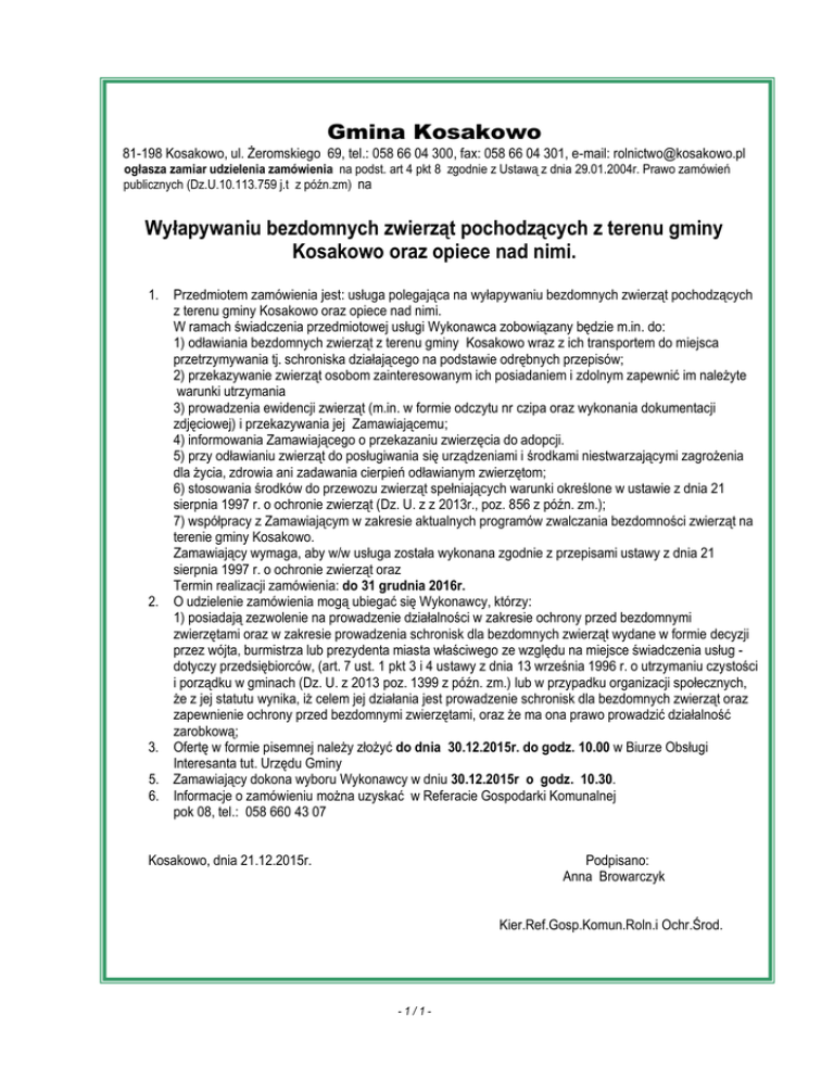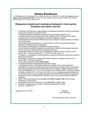 Gmina Kosakowo 81-198 Kosakowo, ul. Żeromskiego 69, tel.: 058 66 04 300, fax: 058 66 04 301, e-mail: [email protected] ogłasza zamiar udzielenia zamówienia na podst. art 4 pkt 8 zgodnie z Ustawą z dnia 29.01.2004r. Prawo zamówień publicznych (Dz.U.10.113.759 j.t z późn.zm) na Wyłapywaniu bezdomnych zwierząt pochodzących z terenu gminy Kosakowo oraz opiece nad nimi. 1. Przedmiotem zamówienia jest: usługa polegająca na wyłapywaniu bezdomnych zwierząt pochodzących z terenu gminy Kosakowo oraz opiece nad nimi. W ramach świadczenia przedmiotowej usługi Wykonawca zobowiązany będzie m.in. do: 1) odławiania bezdomnych zwierząt z terenu gminy Kosakowo wraz z ich transportem do miejsca przetrzymywania tj. schroniska działającego na podstawie odrębnych przepisów; 2) przekazywanie zwierząt osobom zainteresowanym ich posiadaniem i zdolnym zapewnić im należyte warunki utrzymania 3) prowadzenia ewidencji zwierząt (m.in. w formie odczytu nr czipa oraz wykonania dokumentacji zdjęciowej) i przekazywania jej Zamawiającemu; 4) informowania Zamawiającego o przekazaniu zwierzęcia do adopcji. 5) przy odławianiu zwierząt do posługiwania się urządzeniami i środkami niestwarzającymi zagrożenia dla życia, zdrowia ani zadawania cierpień odławianym zwierzętom; 6) stosowania środków do przewozu zwierząt spełniających warunki określone w ustawie z dnia 21 sierpnia 1997 r. o ochronie zwierząt (Dz. U. z z 2013r., poz. 856 z późn. zm.); 7) współpracy z Zamawiającym w zakresie aktualnych programów zwalczania bezdomności zwierząt na terenie gminy Kosakowo. Zamawiający wymaga, aby w/w usługa została wykonana zgodnie z przepisami ustawy z dnia 21 sierpnia 1997 r. o ochronie zwierząt oraz Termin realizacji zamówienia: do 31 grudnia 2016r. 2. O udzielenie zamówienia mogą ubiegać się Wykonawcy, którzy: 1) posiadają zezwolenie na prowadzenie działalności w zakresie ochrony przed bezdomnymi zwierzętami oraz w zakresie prowadzenia schronisk dla bezdomnych zwierząt wydane w formie decyzji przez wójta, burmistrza lub prezydenta miasta właściwego ze względu na miejsce świadczenia usług dotyczy przedsiębiorców, (art. 7 ust. 1 pkt 3 i 4 ustawy z dnia 13 września 1996 r. o utrzymaniu czystości i porządku w gminach (Dz. U. z 2013 poz. 1399 z późn. zm.) lub w przypadku organizacji społecznych, że z jej statutu wynika, iż celem jej działania jest prowadzenie schronisk dla bezdomnych zwierząt oraz zapewnienie ochrony przed bezdomnymi zwierzętami, oraz że ma ona prawo prowadzić działalność zarobkową; 3. Ofertę w formie pisemnej należy złożyć do dnia 30.12.2015r. do godz. 10.00 w Biurze Obsługi Interesanta tut. Urzędu Gminy 5. Zamawiający dokona wyboru Wykonawcy w dniu 30.12.2015r o godz. 10.30. 6. Informacje o zamówieniu można uzyskać w Referacie Gospodarki Komunalnej pok 08, tel.: 058 660 43 07 Kosakowo, dnia 21.12.2015r. Podpisano: Anna Browarczyk Kier.Ref.Gosp.Komun.Roln.i Ochr.Środ. -1/1-