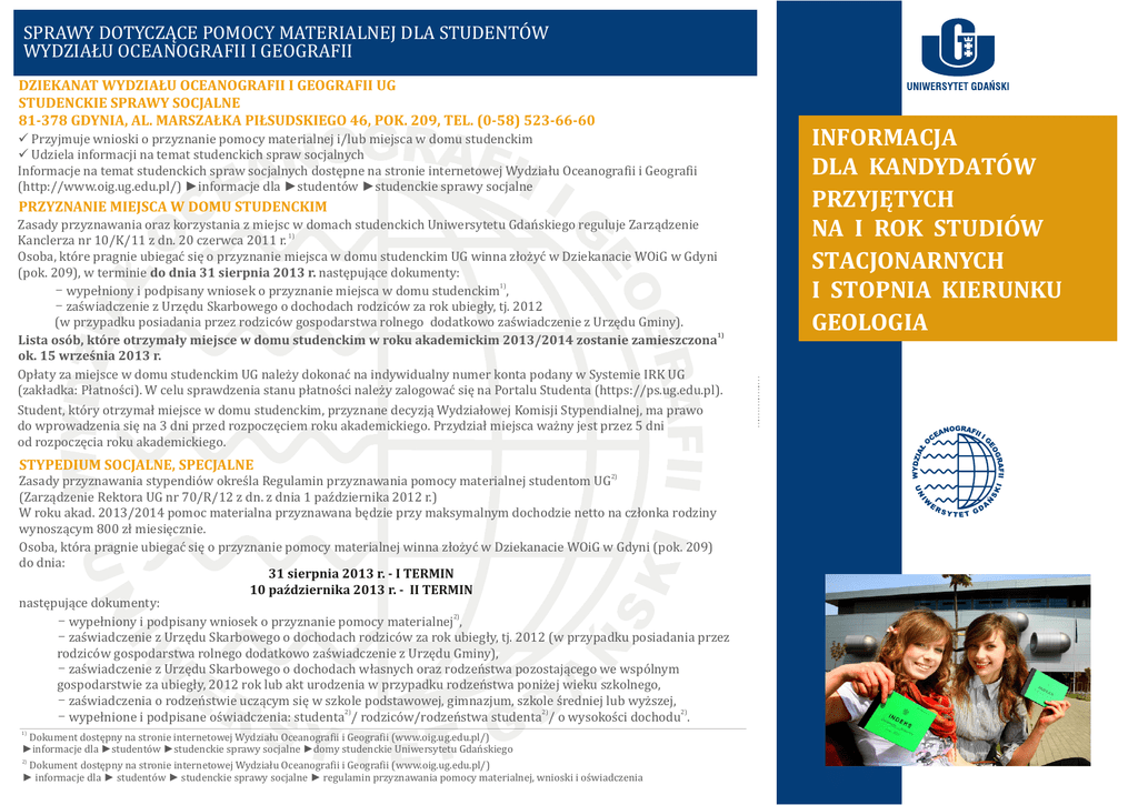SPRAWY DOTYCZĄCE POMOCY MATERIALNEJ DLA STUDENTÓW WYDZIAŁU OCEANOGRAFII I GEOGRAFII DZIEKANAT WYDZIAŁU OCEANOGRAFII I GEOGRAFII UG STUDENCKIE SPRAWY SOCJALNE 81-378 GDYNIA, AL. MARSZAŁKA PIŁSUDSKIEGO 46, POK. 209, TEL. (0-58) 523-66-60 Przyjmuje wnioski o przyznanie pomocy materialnej i/lub miejsca w domu studenckim Udziela informacji na temat studenckich spraw socjalnych Informacje na temat studenckich spraw socjalnych dostępne na stronie internetowej Wydziału Oceanografii i Geografii (http://www.oig.ug.edu.pl/) ►informacje dla ►studentów ►studenckie sprawy socjalne PRZYZNANIE MIEJSCA W DOMU STUDENCKIM Zasady przyznawania oraz korzystania z miejsc w domach studenckich Uniwersytetu Gdańskiego reguluje Zarządzenie Kanclerza nr 10/K/11 z dn. 20 czerwca 2011 r. 1) Osoba, które pragnie ubiegać się o przyznanie miejsca w domu studenckim UG winna złożyć w Dziekanacie WOiG w Gdyni (pok. 209), w terminie do dnia 31 sierpnia 2013 r. następujące dokumenty: - wypełniony i podpisany wniosek o przyznanie miejsca w domu studenckim1), - zaświadczenie z Urzędu Skarbowego o dochodach rodziców za rok ubiegły, tj. 2012 (w przypadku posiadania przez rodziców gospodarstwa rolnego dodatkowo zaświadczenie z Urzędu Gminy). Lista osób, które otrzymały miejsce w domu studenckim w roku akademickim 2013/2014 zostanie zamieszczona1) ok. 15 września 2013 r. Opłaty za miejsce w domu studenckim UG należy dokonać na indywidualny numer konta podany w Systemie IRK UG (zakładka: Płatności). W celu sprawdzenia stanu płatności należy zalogować się na Portalu Studenta (https://ps.ug.edu.pl). Student, który otrzymał miejsce w domu studenckim, przyznane decyzją Wydziałowej Komisji Stypendialnej, ma prawo do wprowadzenia się na 3 dni przed rozpoczęciem roku akademickiego. Przydział miejsca ważny jest przez 5 dni od rozpoczęcia roku akademickiego. STYPEDIUM SOCJALNE, SPECJALNE Zasady przyznawania stypendiów określa Regulamin przyznawania pomocy materialnej studentom UG2) (Zarządzenie Rektora UG nr 70/R/12 z dn. z dnia 1 października 2012 r.) W roku akad. 2013/2014 pomoc materialna przyznawana będzie przy maksymalnym dochodzie netto na członka rodziny wynoszącym 800 zł miesięcznie. Osoba, która pragnie ubiegać się o przyznanie pomocy materialnej winna złożyć w Dziekanacie WOiG w Gdyni (pok. 209) do dnia: 31 sierpnia 2013 r. - I TERMIN 10 października 2013 r. - II TERMIN następujące dokumenty: - wypełniony i podpisany wniosek o przyznanie pomocy materialnej2), - zaświadczenie z Urzędu Skarbowego o dochodach rodziców za rok ubiegły, tj. 2012 (w przypadku posiadania przez rodziców gospodarstwa rolnego dodatkowo zaświadczenie z Urzędu Gminy), - zaświadczenie z Urzędu Skarbowego o dochodach własnych oraz rodzeństwa pozostającego we wspólnym gospodarstwie za ubiegły, 2012 rok lub akt urodzenia w przypadku rodzeństwa poniżej wieku szkolnego, - zaświadczenia o rodzeństwie uczącym się w szkole podstawowej, gimnazjum, szkole średniej lub wyższej, - wypełnione i podpisane oświadczenia: studenta2)/ rodziców/rodzeństwa studenta2)/ o wysokości dochodu2). 1) Dokument dostępny na stronie internetowej Wydziału Oceanografii i Geografii (www.oig.ug.edu.pl/) ►informacje dla ►studentów ►studenckie sprawy socjalne ►domy studenckie Uniwersytetu Gdańskiego 2) Dokument dostępny na stronie internetowej Wydziału Oceanografii i Geografii (www.oig.ug.edu.pl/) ► informacje dla ► studentów ► studenckie sprawy socjalne ► regulamin przyznawania pomocy materialnej, wnioski i oświadczenia INFORMACJA DLA KANDYDATÓW PRZYJĘTYCH NA I ROK STUDIÓW STACJONARNYCH I STOPNIA KIERUNKU GEOLOGIA Drogi Kandydacie, Cieszymy się, że wybrałeś studia na Wydziale Oceanografii i Geografii UG. Szczerze gratulujemy przyjęcia na I rok studiów na kierunku Geologia. Aby wstąpić do społeczności akademickiej Uniwersytetu Gdańskiego i cieszyć się statusem jej pełnoprawnego członka, powinieneś dopełnić jeszcze następujących formalności: I. PIERWSZE KROKI KANDYDATA Kandydat zobowiązany jest do: w terminie do 14 dni od daty ogłoszenia listy przyjętych na studia zaimportowania do Systemu IRK UG (https://irk.ug.edu.pl) kolorowego zdjęcia do Elektronicznej Legitymacji Studenckiej (ELS). Wprowadzenie zdjęcia jest równoznaczne z wypełnieniem wniosku o wydanie ELS, w terminie do 30 dni od daty ogłoszenia listy przyjętych na studia sprawdzenia w Systemie IRK UG numeru konta bankowego, a następnie uiszczenia opłat: za indeks (4 zł) oraz za ELS1) (17 zł), zalogowania się do Portalu Studenta (https://ps.ug.edu.pl) w celu: - samodzielnego wypełnienia wniosku o wydanie Elektronicznej Legitymacji Studenckiej UG 2), - sprawdzenia stanu dokonanych płatności. II. WIZYTA W DZIEKANACIE Dnia 2 października 2013 r. Kandydat zobowiązany jest do zgłoszenia się do Dziekanatu WOiG3) (zgodnie z zamieszczonym harmonogramem) w celu: Złożenia (UPRZEDNIO WYDRUKOWANYCH, WYPEŁNIONYCH ORAZ PODPISANYCH) dokumentów: - Oświadczenia Studenta4) o spełnieniu warunków do podjęcia i kontynuowania studiów stacjonarnych w uczelni publicznej bez wznoszenia opłat, - tekstu Ślubowania4), - Deklaracji wyboru przedmiotów4). Kandydat dokonuje wyboru jednego spośród dwóch przedmiotów: języka łacińskiego, filozofii przyrody. Podpisania (przygotowanej przez Dziekanat) Umowy o warunkach odpłatności za usługi edukacyjne w UG świadczone dla studentów studiów stacjonarnych. Prosimy o wcześniejsze zapoznanie się z treścią Umowy4). Odebrania Elektronicznej Legitymacji Studenckiej (po spełnieniu wszystkich powyższych warunków zawartych w punktach I i II). Dokonania opłaty za ubezpieczenie od nieszczęśliwych wypadków (ok. 40-50 zł). Ubezpieczenie nie jest obowiązkowe. Osoby chcące się ubezpieczyć, bardzo prosimy o przygotowanie odliczonej kwoty. Złożenia zaświadczenia lekarskiego. HARMONOGRAM PRZYJMOWANIA KANDYDATÓW W DZIEKANACIE WOiG w dni