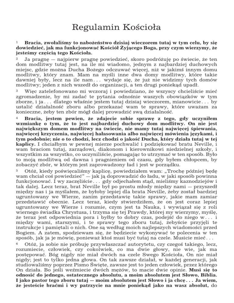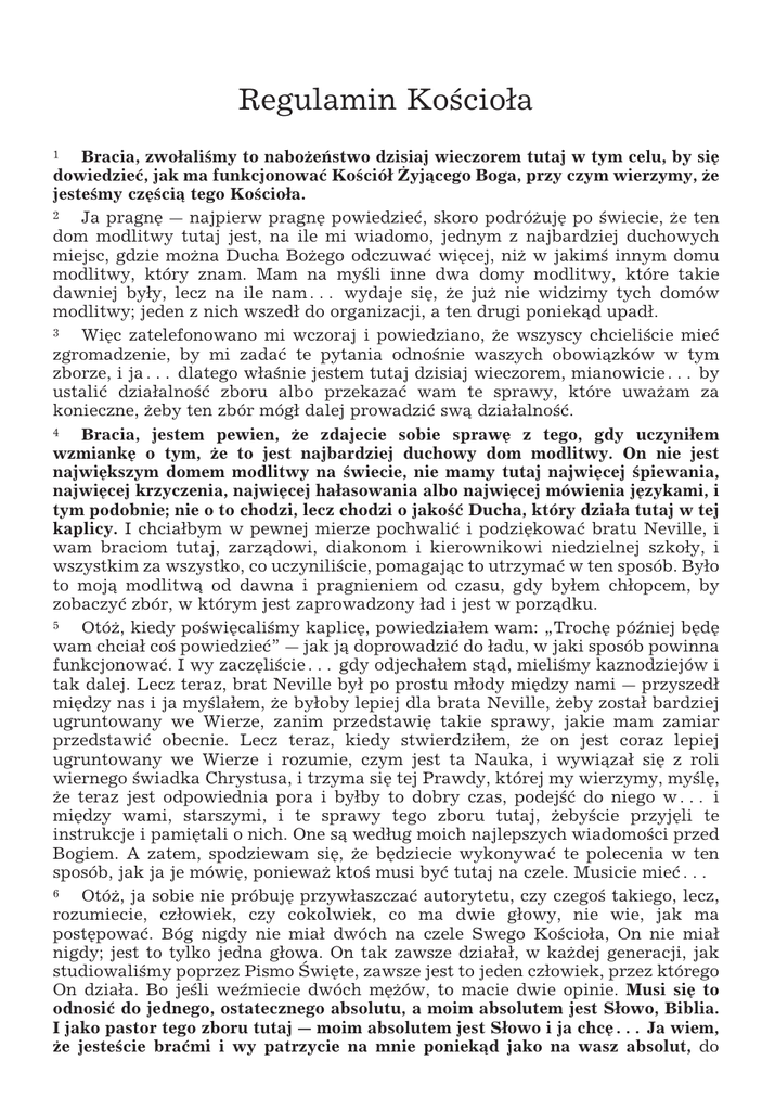 Regulamin Ko™cioa ƒ Bracia, zwoali™my to naboŒe§stwo dzisiaj wieczorem tutaj w tym celu, by siŸ dowiedzieø, jak ma funkcjonowaø Ko™ció yjcego Boga, przy czym wierzymy, Œe jeste™my czŸ™ci tego Ko™cioa. „ Ja pragnŸ _ najpierw pragnŸ powiedzieø, skoro podróŒujŸ po ™wiecie, Œe ten dom modlitwy tutaj jest, na ile mi wiadomo, jednym z najbardziej duchowych miejsc, gdzie moŒna Ducha BoŒego odczuwaø wiŸcej, niŒ w jakim™ innym domu modlitwy, który znam. Mam na my™li inne dwa domy modlitwy, które takie dawniej byy, lecz na ile nam^ wydaje siŸ, Œe juŒ nie widzimy tych domów modlitwy; jeden z nich wszed do organizacji, a ten drugi poniekd upad. … WiŸc zatelefonowano mi wczoraj i powiedziano, Œe wszyscy chcieli™cie mieø zgromadzenie, by mi zadaø te pytania odno™nie waszych obowizków w tym zborze, i ja^ dlatego wa™nie jestem tutaj dzisiaj wieczorem, mianowicie^ by ustaliø dziaalno™ø zboru albo przekazaø wam te sprawy, które uwaŒam za konieczne, Œeby ten zbór móg dalej prowadziø sw dziaalno™ø. † Bracia, jestem pewien, Œe zdajecie sobie sprawŸ z tego, gdy uczyniem wzmiankŸ o tym, Œe to jest najbardziej duchowy dom modlitwy. On nie jest najwiŸkszym domem modlitwy na ™wiecie, nie mamy tutaj najwiŸcej ™piewania, najwiŸcej krzyczenia, najwiŸcej haasowania albo najwiŸcej mówienia jŸzykami, i tym podobnie; nie o to chodzi, lecz chodzi o jako™ø Ducha, który dziaa tutaj w tej kaplicy. I chciabym w pewnej mierze pochwaliø i podziŸkowaø bratu Neville, i wam braciom tutaj, zarzdowi, diakonom i kierownikowi niedzielnej szkoy, i wszystkim za wszystko, co uczynili™cie, pomagajc to utrzymaø w ten sposób. Byo to moj modlitw od dawna i pragnieniem od czasu, gdy byem chopcem, by zobaczyø zbór, w którym jest zaprowadzony ad i jest w porzdku. ‡ OtóŒ, kiedy po™wiŸcali™my kaplicŸ, powiedziaem wam: TrochŸ pó›niej bŸdŸ wam chcia co™ powiedzieø” _ jak j doprowadziø do adu, w jaki sposób powinna funkcjonowaø. I wy zaczŸli™cie^ gdy odjechaem std, mieli™my kaznodziejów i tak dalej. Lecz teraz, brat Neville by po prostu mody miŸdzy nami _ przyszed miŸdzy nas i ja my™laem, Œe byoby lepiej dla brata Neville, Œeby zosta bardziej ugruntowany we Wierze, zanim przedstawiŸ takie sprawy, jakie mam zamiar przedstawiø obecnie. Lecz teraz, kiedy stwierdziem, Œe on jest coraz lepiej ugruntowany we Wierze i rozumie, czym jest ta Nauka, i wywiza siŸ z roli wiernego ™wiadka Chrystusa, i trzyma siŸ tej Prawdy, której my wierzymy, my™lŸ, Œe teraz jest odpowiednia pora i byby to dobry czas, podej™ø do niego w^ i miŸdzy wami, starszymi, i te sprawy tego zboru tutaj, Œeby™cie przyjŸli te instrukcje i pamiŸtali o nich. One s wedug moich najlepszych wiadomo™ci przed Bogiem. A zatem, spodziewam siŸ, Œe bŸdziecie wykonywaø te polecenia w ten sposób, jak ja je mówiŸ, poniewaŒ kto™ musi byø tutaj na czele. Musicie mieø^ ˆ OtóŒ, ja sobie nie próbujŸ przywaszczaø autorytetu, czy czego™ takiego, lecz, rozumiecie, czowiek, czy cokolwiek, co ma dwie gowy, nie wie, jak ma postŸpowaø. Bóg nigdy nie mia dwóch na czele Swego Ko™cioa, On nie mia nigdy; jest to tylko jedna gowa. On tak zawsze dziaa, w kaŒdej generacji, jak studiowali™my poprzez Pismo šwiŸte, zawsze jest to jeden czowiek, przez którego On dziaa. Bo je™li we›miecie dwóch mŸŒów, to macie dwie opinie. Musi siŸ to odnosiø do jednego, ostatecznego absolutu, a moim absolutem jest Sowo, Biblia. I jako pastor tego zboru tutaj _ moim absolutem jest Sowo i ja chcŸ^ Ja wiem, Œe jeste™cie braømi i wy patrzycie na mnie poniekd jako na wasz absolut, do 620 MÓWIONE S~OWO tego^ jak dugo ja na™ladujŸ Boga, jak powiedzia Pawe w Pi™mie šwiŸtym: Na™ladujcie mnie, jak ja na™ladujŸ Chrystusa”. ‰ A potem, oczekujŸ od was, bracia, kiedykolwiek widzicie, Œe odchylam siŸ od tego Pisma, Œeby™cie przyszli do mnie prywatnie i powiedzieli mi, gdzie siŸ mylŸ. NiezaleŒnie od tego, czy jeste™ jednym ze starszych albo^ albo czy jeste™ od›wiernym, kimkolwiek jeste™, twoim obowizkiem wobec mnie (jako brata w Chrystusie) jest powiedzieø mi, jeŒeli siŸ mylŸ odno™nie Pisma šwiŸtego. A je™li jest jakie™ pytanie, usid›my i rozwiŒmy je wspólnie. Š I przypuszczam, Œe wa™nie dlatego przychodzicie do mnie dzisiaj wieczorem _ sprowadzili™cie mnie tutaj, poniewaŒ s tu pytania, które, jak siŸ wydaje, zaprztaj wasze umysy, odno™nie tych spraw, które mam _ mamy tutaj. Zatem, bracia, pamiŸtajcie, Œe ja nie wiem^ na Œadnej z tych kartek nie ma podpisu, lecz^ i oni je napisali, a ja nie mogŸ _ nie wiem, kto je napisa, lecz s to pytania, które macie na my™li, i ja jestem tutaj, by na nie odpowiedzieø wedug moich najlepszych wiadomo™ci. ‹ I pamiŸtajcie, Bóg patrzy na mnie, by dopilnowaø, Œebym siŸ trzyma Sowa. A ja patrzŸ na was, by dopilnowaø, Œeby™cie wypeniali Sowo, rozumiecie, rozumiecie, w tym zborze. A zachowujcie go duchowym, pamiŸtajcie bowiem, Œe wszelkie moce ciemnego królestwa szatana obróc siŸ przeciwko wam, kiedy zaczniecie wzrastaø w Panu. I wy musicie byø Œonierzami, nie tylko ™wieŒymi rekrutami. Jeste™cie teraz dorosymi Œonierzami i zostali™cie wyøwiczeni do boju. A szatan przyjdzie miŸdzy was i sprawi, Œe siŸ zaczniecie kóciø miŸdzy sob, jeŒeli mu siŸ uda. Odrzuøcie go natychmiast; jeste™cie braømi, a on jest nieprzyjacielem. I my jeste™my tutaj, by trzymaø sztandar w tym czasie wieczornego šwiata, tak, kiedy ™wiat jest w ciemno™ciach a caa rzesza ko™cioa idzie do šwiatowej Rady Ko™cioa. A niebawem oni bŸd chcieli przybiø tabliczkŸ na te drzwi tutaj: ZamkniŸte!” I potem bŸdziemy siŸ zgromadzaø w innych pomieszczeniach, poniewaŒ na pewno zamkn te kaplice pewnego dnia, jeŒeli nie przyjmiemy piŸtna bestii. My polegamy na tym, Œe zostaniemy wierni Bogu, aŒ nas ™mierø wyzwoli, i to wa™nie mamy z
