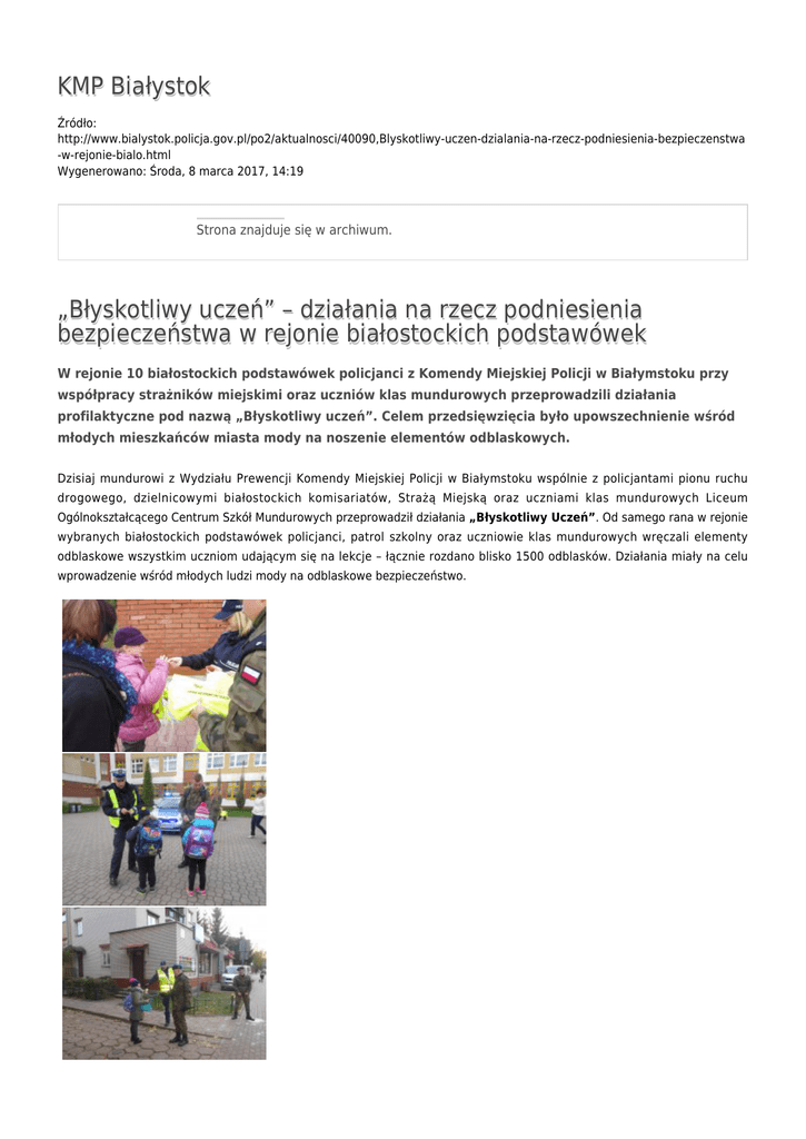 KMP Białystok Źródło: http://www.bialystok.policja.gov.pl/po2/aktualnosci/40090,Blyskotliwy-uczen-dzialania-na-rzecz-podniesienia-bezpieczenstwa -w-rejonie-bialo.html Wygenerowano: Środa, 8 marca 2017, 14:19 Strona znajduje się w archiwum. „Błyskotliwy uczeń” – działania na rzecz podniesienia bezpieczeństwa w rejonie białostockich podstawówek W rejonie 10 białostockich podstawówek policjanci z Komendy Miejskiej Policji w Białymstoku przy współpracy strażników miejskimi oraz uczniów klas mundurowych przeprowadzili działania profilaktyczne pod nazwą „Błyskotliwy uczeń”. Celem przedsięwzięcia było upowszechnienie wśród młodych mieszkańców miasta mody na noszenie elementów odblaskowych. Dzisiaj mundurowi z Wydziału Prewencji Komendy Miejskiej Policji w Białymstoku wspólnie z policjantami pionu ruchu drogowego, dzielnicowymi białostockich komisariatów, Strażą Miejską oraz uczniami klas mundurowych Liceum Ogólnokształcącego Centrum Szkół Mundurowych przeprowadził działania „Błyskotliwy Uczeń”. Od samego rana w rejonie wybranych białostockich podstawówek policjanci, patrol szkolny oraz uczniowie klas mundurowych wręczali elementy odblaskowe wszystkim uczniom udającym się na lekcje – łącznie rozdano blisko 1500 odblasków. Działania miały na celu wprowadzenie wśród młodych ludzi mody na odblaskowe bezpieczeństwo. Ocena: 0/5 (0) Tweetnij