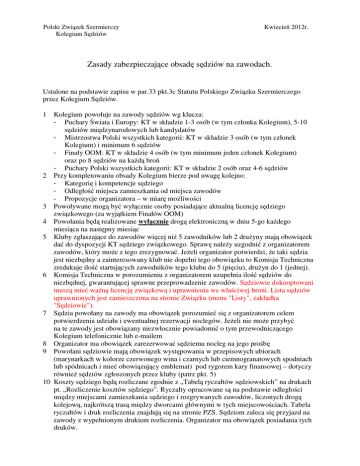 Polski Związek Szermierczy Kolegium Sędziów Kwiecień 2012r. Zasady zabezpieczające obsadę sędziów na zawodach. Ustalone na podstawie zapisu w par.33 pkt.3c Statutu Polskiego Związku Szermierczego przez Kolegium Sędziów. 1 2 3 4 5 6 7 8 9 10 Kolegium powołuje na zawody sędziów wg klucza: - Puchary Świata i Europy: KT w składzie 1-3 osób (w tym członka Kolegium), 5-10 sędziów międzynarodowych lub kandydatów - Mistrzostwa Polski wszystkich kategorii: KT w składzie 3 osób (w tym członek Kolegium) i minimum 6 sędziów - Finały OOM: KT w składzie 4 osób (w tym minimum jeden członek Kolegium) oraz po 8 sędziów na kaŜdą broń - Puchary Polski wszystkich kategorii: KT w składzie 2 osób oraz 4-6 sędziów Przy kompletowaniu obsady Kolegium bierze pod uwagę kolejno: - Kategorię i kompetencje sędziego - Odległość miejsca zamieszkania od miejsca zawodów - Propozycje organizatora – w miarę moŜliwości Powoływane mogą być wyłącznie osoby posiadające aktualną licencję sędziego związkowego (za wyjątkiem Finałów OOM) Powołania będą realizowane wyłącznie drogą elektroniczną w dniu 5-go kaŜdego miesiąca na następny miesiąc Kluby zgłaszające do zawodów więcej niŜ 5 zawodników lub 2 druŜyny mają obowiązek dać do dyspozycji KT sędziego związkowego. Sprawę naleŜy uzgodnić z organizatorem zawodów, który moŜe z tego zrezygnować. JeŜeli organizator potwierdzi, Ŝe taki sędzia jest niezbędny a zainteresowany klub nie dopełni tego obowiązku to Komisja Techniczna zredukuje ilość startujących zawodników tego klubu do 5 (pięciu), druŜyn do 1 (jednej). Komisja Techniczna w porozumieniu z organizatorem uzupełnia ilość sędziów do niezbędnej, gwarantującej sprawne przeprowadzenie zawodów. Sędziowie dokooptowani muszą mieć waŜną licencję związkową i uprawnienia we właściwej broni. Lista sędziów uprawnionych jest zamieszczona na stronie Związku (menu "Listy", zakładka "Sędziowie"). Sędzia powołany na zawody ma obowiązek porozumieć się z organizatorem celem potwierdzenia udziału i ewentualnej rezerwacji noclegów. JeŜeli nie moŜe przybyć na te zawody jest obowiązany niezwłocznie powiadomić o tym przewodniczącego Kolegium telefonicznie lub e-mailem Organizator ma obowiązek zarezerwować sędziemu nocleg na jego prośbę Powołani sędziowie mają obowiązek występowania w przepisowych ubiorach (marynarkach w kolorze czerwonego wina i czarnych lub ciemnogranatowych spodniach lub spódnicach i mieć obowiązujący emblemat) pod rygorem kary finansowej – dotyczy równieŜ sędziów zgłoszonych przez kluby (patrz pkt. 5) Koszty sędziego będą rozliczane zgodnie z „Tabelą ryczałtów sędziowskich” na drukach pt. „Rozliczenie kosztów sędziego”. Ryczałty opracowane są na podstawie odległości między miejscami zamieszkania sędziego i rozgrywanych zawodów, liczonych drogą kolejową, najkrótszą trasą między dworcami głównymi w tych miejscowościach. Tabela ryczałtów i druk rozliczenia znajdują się na stronie PZS. Sędziom zaleca się przyjazd na zawody z wypełnionym drukiem rozliczenia. Organizator ma obowiązek posiadania tych druków. 11 JeŜeli organizator zabezpiecza sędziemu nieodpłatne noclegi, to przy odległościach, o których mowa w pkt. 10 powyŜej 200 km, od ryczałtu sędziowskiego odlicza się kwotę 90 (dziewięćdziesiąt) PLN za kaŜdy nocleg. JeŜeli program zawodów nie powoduje konieczności noclegu przed pierwszym dniem zawodów, to przy odległościach, o których mowa w pkt.10 powyŜej 200 km, od ryczałtu za pierwszy dzień odlicza się tę samą kwotę. 12 Sędziowie z Okręgu, na którego terenie odbywają się zawody, zamieszkali nie dalej niŜ 60 (sześćdziesiąt) km od miejsca zawodów, rozliczani są jak miejscowi. 13 Powołani sędziowie mają obowiązek zapoznać się z Komunikatem Kolegium Sędziów 03/2011 z 12.08.2011 (patrz Informacje - Sprawy sędziowskie). Przewodniczący Kolegium Sędziów Wojciech Dryla Tel. 693-437-975 e-mail: [email protected]