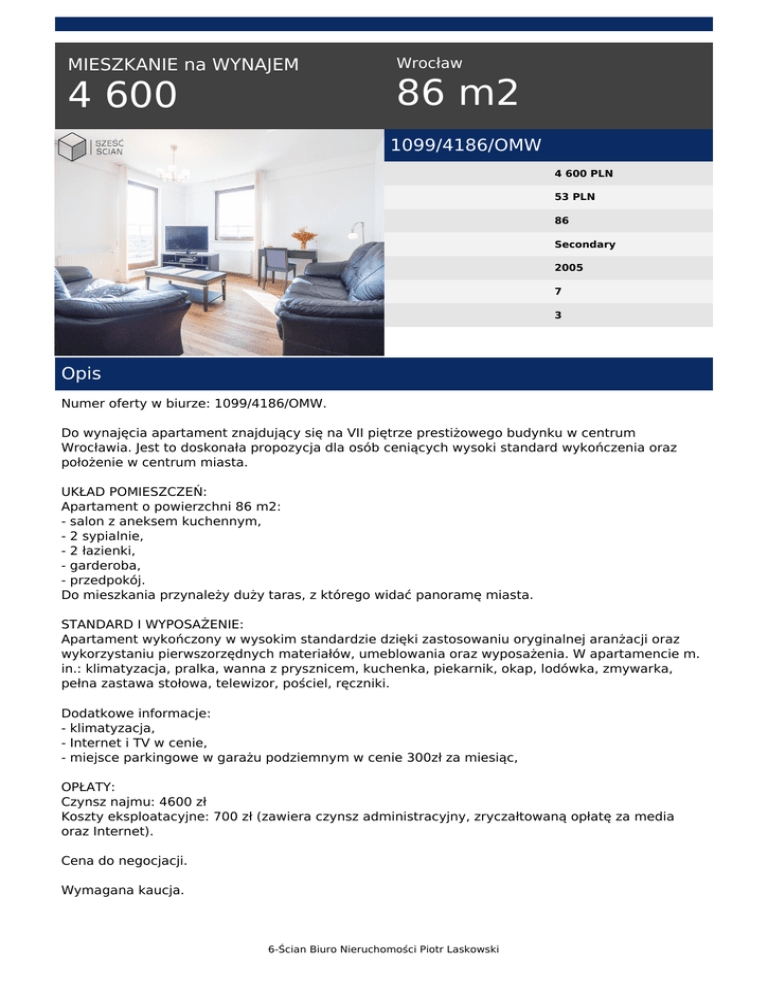 MIESZKANIE na WYNAJEM 4 600 Wrocław 86 m2 1099/4186/OMW 4 600 PLN 53 PLN 86 Secondary 2005 7 3 Opis Numer oferty w biurze: 1099/4186/OMW. Do wynajęcia apartament znajdujący się na VII piętrze prestiżowego budynku w centrum Wrocławia. Jest to doskonała propozycja dla osób ceniących wysoki standard wykończenia oraz położenie w centrum miasta. UKŁAD POMIESZCZEŃ: Apartament o powierzchni 86 m2: - salon z aneksem kuchennym, - 2 sypialnie, - 2 łazienki, - garderoba, - przedpokój. Do mieszkania przynależy duży taras, z którego widać panoramę miasta. STANDARD I WYPOSAŻENIE: Apartament wykończony w wysokim standardzie dzięki zastosowaniu oryginalnej aranżacji oraz wykorzystaniu pierwszorzędnych materiałów, umeblowania oraz wyposażenia. W apartamencie m. in.: klimatyzacja, pralka, wanna z prysznicem, kuchenka, piekarnik, okap, lodówka, zmywarka, pełna zastawa stołowa, telewizor, pościel, ręczniki. Dodatkowe informacje: - klimatyzacja, - Internet i TV w cenie, - miejsce parkingowe w garażu podziemnym w cenie 300zł za miesiąc, OPŁATY: Czynsz najmu: 4600 zł Koszty eksploatacyjne: 700 zł (zawiera czynsz administracyjny, zryczałtowaną opłatę za media oraz Internet). Cena do negocjacji. Wymagana kaucja. 6-Ścian Biuro Nieruchomości Piotr Laskowski Zapraszam na prezentację. Numer oferty w biurze: 1099/4186/OMW. Więcej ofert na naszej stronie internetowej www . 6-scian . pl --------------------------------------6-ścian Biuro Nieruchomości Katarzyna Fludra [email protected] tel: 514411543 Niniejsza oferta nie stanowi oferty w rozumieniu przepisów Kodeksu Cywilnego, a dane w niej zawarte mają jedynie charakter informacyjny i mogą ulec zmianie. Katarzyna Fludra tel. 514411543 email: [email protected] 6-Ścian Biuro Nieruchomości Piotr Laskowski Powered by TCPDF (www.tcpdf.org)