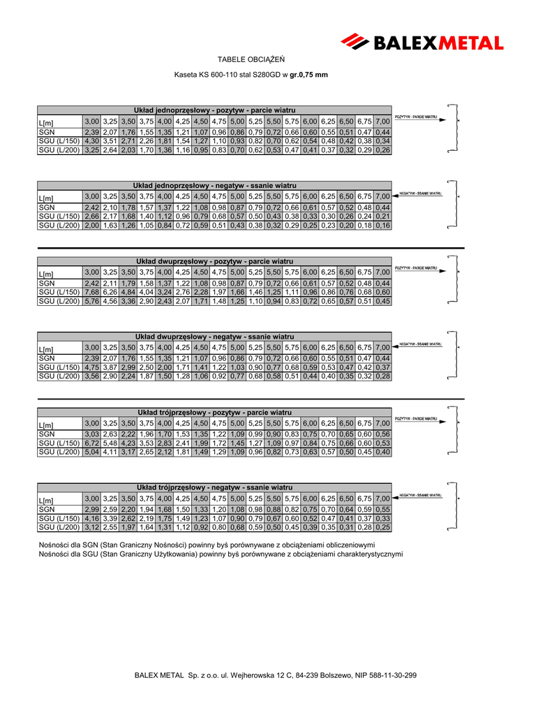 TABELE OBCIĄŻEŃ Kaseta KS 600-110 stal S280GD w gr.0,75 mm Układ jednoprzęsłowy - pozytyw - parcie wiatru L[m] SGN SGU (L/150) SGU (L/200) 3,00 3,25 3,50 3,75 4,00 4,25 4,50 4,75 5,00 5,25 5,50 5,75 6,00 6,25 6,50 6,75 7,00 L[m] SGN SGU (L/150) SGU (L/200) 3,00 3,25 3,50 3,75 4,00 4,25 4,50 4,75 5,00 5,25 5,50 5,75 6,00 6,25 6,50 6,75 7,00 L[m] SGN SGU (L/150) SGU (L/200) 3,00 3,25 3,50 3,75 4,00 4,25 4,50 4,75 5,00 5,25 5,50 5,75 6,00 6,25 6,50 6,75 7,00 2,39 2,07 1,76 1,55 1,35 1,21 1,07 0,96 0,86 0,79 0,72 0,66 0,60 0,55 0,51 0,47 0,44 4,30 3,51 2,71 2,26 1,81 1,54 1,27 1,10 0,93 0,82 0,70 0,62 0,54 0,48 0,42 0,38 0,34 3,25 2,64 2,03 1,70 1,36 1,16 0,95 0,83 0,70 0,62 0,53 0,47 0,41 0,37 0,32 0,29 0,26 Układ jednoprzęsłowy - negatyw - ssanie wiatru 2,42 2,10 1,78 1,57 1,37 1,22 1,08 0,98 0,87 0,79 0,72 0,66 0,61 0,57 0,52 0,48 0,44 2,66 2,17 1,68 1,40 1,12 0,96 0,79 0,68 0,57 0,50 0,43 0,38 0,33 0,30 0,26 0,24 0,21 2,00 1,63 1,26 1,05 0,84 0,72 0,59 0,51 0,43 0,38 0,32 0,29 0,25 0,23 0,20 0,18 0,16 Układ dwuprzęsłowy - pozytyw - parcie wiatru 2,42 2,11 1,79 1,58 1,37 1,22 1,08 0,98 0,87 0,79 0,72 0,66 0,61 0,57 0,52 0,48 0,44 7,68 6,26 4,84 4,04 3,24 2,76 2,28 1,97 1,66 1,46 1,25 1,11 0,96 0,86 0,76 0,68 0,60 5,76 4,56 3,36 2,90 2,43 2,07 1,71 1,48 1,25 1,10 0,94 0,83 0,72 0,65 0,57 0,51 0,45 Układ dwuprzęsłowy - negatyw - ssanie wiatru L[m] SGN SGU (L/150) SGU (L/200) 3,00 3,25 3,50 3,75 4,00 4,25 4,50 4,75 5,00 5,25 5,50 5,75 6,00 6,25 6,50 6,75 7,00 2,39 2,07 1,76 1,55 1,35 1,21 1,07 0,96 0,86 0,79 0,72 0,66 0,60 0,55 0,51 0,47 0,44 4,75 3,87 2,99 2,50 2,00 1,71 1,41 1,22 1,03 0,90 0,77 0,68 0,59 0,53 0,47 0,42 0,37 3,56 2,90 2,24 1,87 1,50 1,28 1,06 0,92 0,77 0,68 0,58 0,51 0,44 0,40 0,35 0,32 0,28 Układ trójprzęsłowy - pozytyw - parcie wiatru L[m] SGN SGU (L/150) SGU (L/200) 3,00 3,25 3,50 3,75 4,00 4,25 4,50 4,75 5,00 5,25 5,50 5,75 6,00 6,25 6,50 6,75 7,00 3,03 2,63 2,22 1,96 1,70 1,53 1,35 1,22 1,09 0,99 0,90 0,83 0,75 0,70 0,65 0,60 0,56 6,72 5,48 4,23 3,53 2,83 2,41 1,99 1,72 1,45 1,27 1,09 0,97 0,84 0,75 0,66 0,60 0,53 5,04 4,11 3,17 2,65 2,12 1,81 1,49 1,29 1,09 0,96 0,82 0,73 0,63 0,57 0,50 0,45 0,40 Układ trójprzęsłowy - negatyw - ssanie wiatru 3,00 3,25 3,50 3,75 4,00 4,25 4,50 4,75 5,00 5,25 5,50 5,75 6,00 6,25 6,50 6,75 7,00 L[m] SGN 2,99 2,59 2,20 1,94 1,68 1,50 1,33 1,20 1,08 0,98 0,88 0,82 0,75 0,70 0,64 0,59 0,55 SGU (L/150) 4,16 3,39 2,62 2,19 1,75 1,49 1,23 1,07 0,90 0,79 0,67 0,60 0,52 0,47 0,41 0,37 0,33 SGU (L/200) 3,12 2,55 1,97 1,64 1,31 1,12 0,92 0,80 0,68 0,59 0,50 0,45 0,39 0,35 0,31 0,28 0,25 Nośności dla SGN (Stan Graniczny Nośności) powinny byś porównywane z obciążeniami obliczeniowymi Nośności dla SGU (Stan Graniczny Użytkowania) powinny byś porównywane z obciążeniami charakterystycznymi BALEX METAL Sp. z o.o. ul. Wejherowska 12 C, 84-239 Bolszewo, NIP 588-11-30-299 TABELE OBCIĄŻEŃ Kaseta KS 600-110 stal S280GD w gr.0,88 mm Układ jednoprzęsłowy - pozytyw - parcie wiatru 3,00 3,25 3,50 3,75 4,00 4,25 4,50 4,75 5,00 5,25 5,50 5,75 6,00 6,25 6,50 6,75 7,00 L[m] SGN 2,77 2,40 2,03 1,79 1,56 1,40 1,24 1,12 1,00 0,91 0,82 0,75 0,69 0,64 0,59 0,55 0,51 SGU (L/150) 4,99 4,07 3,14 2,63 2,11 1,80 1,48 1,28 1,08 0,95 0,81 0,72 0,62 0,56 0,49 0,44 0,39 SGU (L/200) 3,74 3,05 2,36 1,97 1,58 1,35 1,11 0,96 0,81 0,71 0,61 0,54 0,47 0,42 0,37 0,33 0,29 Układ jednoprzęsłowy - negatyw - ssanie wiatru 3,00 3,25 3,50 3,75 4,00 4,25 4,50 4,75 5,00 5,25 5,50 5,75 6,00 6,25 6,50 6,75 7,00 L[m] SGN 3,04 2,64 2,24 1,98 1,72 1,53 1,35 1,22 1,09 1,00 0,91 0,84 0,77 0,71 0,65 0,60 0,56 SGU (L/150) 3,25 2,65 2,05 1,71 1,37 1,17 0,96 0,83 0,70 0,62 0,53 0,47 0,41 0,37 0,32 0,29 0,26 SGU (L/200) 2,44 1,99 1,54 1,29 1,03 0,88 0,72 0,63 0,53 0,47 0,40 0,36 0,31 0,28 0,24 0,22 0,20 Układ dwuprzęsłowy - pozytyw - parcie wiatru 3,00 3,25 3,50 3,75 4,00 4,25 4,50 4,75 5,00 5,25 5,50 5,75 6,00 6,25 6,50 6,75 7,00 L[m] SGN 3,04 2,64 2,24 1,98 1,72 1,53 1,35 1,22 1,09 1,00 0,91 0,84 0,77 0,71 0,65 0,60 0,56 SGU (L/150) 8,91 7,26 5,61 4,69 3,76 3,20 2,64 2,28 1,92 1,69 1,45 1,28 1,11 1,00 0,88 0,79 0,70 SGU (L/200) 6,68 5,45 4,21 3,52 2,82 2,40 1,98 1,71 1,44 1,27 1,09 0,96 0,83 0,75 0,66 0,60 0,53 Układ dwuprzęsłowy - negatyw - ssanie wiatru 3,00 3,25 3,50 3,75 4,00 4,25 4,50 4,75 5,00 5,25 5,50 5,75 6,00 6,25 6,50 6,75 7,00 L[m] SGN 2,77 2,40 2,03 1,79 1,56 1,40 1,24 1,12 1,00 0,91 0,82 0,75 0,69 0,64 0,59 0,55 0,51 SGU (L/150) 5,81 4,74 3,66 3,06 2,45 2,09 1,72 1,49 1,25 1,10 0,94 0,84 0,73 0,65 0,57 0,52 0,46 SGU (L/200) 4,36 3,56 2,75 2,30 1,84 1,57 1,29 1,12 0,94 0,83 0,71 0,63 0,55 0,49 0,43 0,39 0,35 Układ trójprzęsłowy - pozytyw - parcie wiatru 3,00 3,25 3,50 3,75 4,00 4,25 4,50 4,75 5,00 5,25 5,50 5,75 6,00 6,25 6,50 6,75 7,00 L[m] SGN 3,81 3,30 2,80 2,47 2,15 1,92 1,69 1,53 1,37 1,25 1,13 1,04 0,95 0,88 0,81 0,75 0,70 SGU (L/150) 7,80 6,36 4,91 4,10 3,29 2,80 2,31 2,00 1,68 1,48 1,27 1,13 0,98 0,88 0,77 0,69 0,61 SGU (L/200) 5,85 4,77 3,68 3,08 2,47 2,10 1,73 1,50 1,26 1,11 0,95 0,85 0,74 0,66 0,58 0,52 0,46 Układ trójprzęsłowy - negatyw - ssanie wiatru L[m] SGN SGU (L/150) SGU (L/200) 3,00 3,25 3,50 3,75 4,00 4,25 4,50 4,75 5,00 5,25 5,50 5,75 6,00 6,25 6,50 6,75 7,00 3,46 3,00 2,54 2,24 1,95 1,74 1,53 1,39 1,25 1,14 1,03 0,94 0,86 0,80 0,74 0,69 0,64 5,08 4,14 3,20 2,67 2,14 1,83 1,51 1,31 1,10 0,96 0,82 0,73 0,64 0,57 0,50 0,45 0,40 3,81 3,11 2,40 2,01 1,61 1,37 1,13 0,98 0,83 0,73 0,62 0,55 0,48 0,43 0,38 0,34 0,30 Nośności dla SGN (Stan Graniczny Nośności) powinny byś porównywane z obciążeniami obliczeniowymi Nośności dla SGU (Stan Graniczny Użytkowania) powinny byś porównywane z obciążeniami charakterystycznymi BALEX METAL Sp. z o.o. ul. Wejherowska 12 C, 84-239 Bolszewo, NIP 588-11-30-299