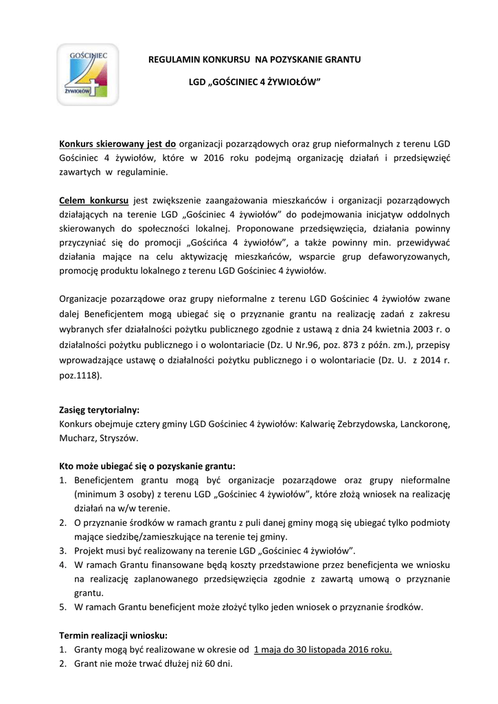 REGULAMIN KONKURSU NA POZYSKANIE GRANTU LGD „GOŚCINIEC 4 ŻYWIOŁÓW” Konkurs skierowany jest do organizacji pozarządowych oraz grup nieformalnych z terenu LGD Gościniec 4 żywiołów, które w 2016 roku podejmą organizację działań i przedsięwzięć zawartych w regulaminie. Celem konkursu jest zwiększenie zaangażowania mieszkańców i organizacji pozarządowych działających na terenie LGD „Gościniec 4 żywiołów” do podejmowania inicjatyw oddolnych skierowanych do społeczności lokalnej. Proponowane przedsięwzięcia, działania powinny przyczyniać się do promocji „Gościńca 4 żywiołów”, a także powinny min. przewidywać działania mające na celu aktywizację mieszkańców, wsparcie grup defaworyzowanych, promocję produktu lokalnego z terenu LGD Gościniec 4 żywiołów. Organizacje pozarządowe oraz grupy nieformalne z terenu LGD Gościniec 4 żywiołów zwane dalej Beneficjentem mogą ubiegać się o przyznanie grantu na realizację zadań z zakresu wybranych sfer działalności pożytku publicznego zgodnie z ustawą z dnia 24 kwietnia 2003 r. o działalności pożytku publicznego i o wolontariacie (Dz. U Nr.96, poz. 873 z późn. zm.), przepisy wprowadzające ustawę o działalności pożytku publicznego i o wolontariacie (Dz. U. z 2014 r. poz.1118). Zasięg terytorialny: Konkurs obejmuje cztery gminy LGD Gościniec 4 żywiołów: Kalwarię Zebrzydowska, Lanckoronę, Mucharz, Stryszów. Kto może ubiegać się o pozyskanie grantu: 1. Beneficjentem grantu mogą być organizacje pozarządowe oraz grupy nieformalne (minimum 3 osoby) z terenu LGD „Gościniec 4 żywiołów”, które złożą wniosek na realizację działań na w/w terenie. 2. O przyznanie środków w ramach grantu z puli danej gminy mogą się ubiegać tylko podmioty mające siedzibę/zamieszkujące na terenie tej gminy. 3. Projekt musi być realizowany na terenie LGD „Gościniec 4 żywiołów”. 4. W ramach Grantu finansowane będą koszty przedstawione przez beneficjenta we wniosku na realizację zaplanowanego przedsięwzięcia zgodnie z zawartą umową o przyznanie grantu. 5. W ramach Grantu beneficjent może złożyć tylko jeden wniosek o przyznanie środków. Termin realizacji wniosku: 1. Granty mogą być realizowane w okresie od 1 maja do 30 listopada 2016 roku. 2. Grant nie może trwać dłużej niż 60 dni. Termin i sposób złożenia wniosku: 1. Wniosek należy wypełnić elektronicznie i dostarczyć osobiście lub za pomocą poczty do biura Stowarzyszenia w formie wydrukowanej, podpisany przez osoby do tego upoważnione. 2. W przypadku grupy nieformalnej wniosek podpisują dwie osoby, reprezentujące grupę nieformalną. 3. Każda uprawniona organizacja pozarządowa lub grupa nieformalna może złożyć w ramach jednego konkursu tylko jeden wniosek. 4. Poprawnie wypełniony, podpisany wniosek o pozyskanie grantu należy przesłać pocztą lub dostarczyć osobiście na adres biura: Gościniec 4 żywiołów 34-143 Lanckorona 473 w terminie 11.04.2016r. do 21.04.2016r.w godzinach pracy biura, w dniu 21.04.2016r r. do godziny 15:00. O przyjęciu wniosku decyduje data wpływu do biura Gościniec 4 żywiołów. 5. Niespełnienie w/w warunków skutkuje odrzuceniem wniosku bez możliwości odwołania i złożenia wyjaśnień. Kwoty na realizację Grantu: 1. Beneficjent może ubiegać się o wsparcie finansowe z puli danej gminy w wysokości od 400 zł. do 800 zł. lecz nie więcej niż do wyczerpania puli środków na daną gminę. 2. Na realizację Grantów „Gościniec 4 żywiołów” w 2016 r. Zarząd przeznaczył kwotę w wysokości 14 709,20 zł. 3. W/w kwota jest podzielona na gminy należące do LGD Gościniec 4 żywiołów, wyliczona na podstawie wpłaconej składki członkowskiej przez poszczególne gminy. Podział kwot przeznaczonych na granty w danej gminie: - Gmina Mucharz – 1 613,60 zł. - Gmina Stryszów – 2 749,20 zł. - Gmina Lanckorona – 2 442,40 zł. - Gmina Kalwaria Zebrzydowska – 7 904,00 zł. Sposób wyliczenia kwoty: liczba mieszkańców poszczególnych gmin x 0,40zł. 4. Niewykorzystane w konkursie w danym roku środki zostaną wydatkowane na działania statutowe Stowarzyszenia „Gościniec 4 żywiołów”. Przedmiot konkursu grantowego: W ramach grantu mogą być przeprowadzone przedsięwzięcia oraz działania obejmujące realizację wybranych zadań z zakresu sfer działalności pożytku publicznego (m.in.: art. 4 ust. 1 ustawy z dnia 24 kwietnia 2003 r. o działalności pożytku publicznego i o wolontariacie): 1. Podtrzymywanie tradycji narodowej, pielęgnowanie polskości oraz rozwoju świadomości narodowej, obywatelskiej i kulturowej; 2. Działalność na rzecz osób niepełnosprawnych; 3. Działalność na rzecz dzieci i młodzieży, w tym wypoczynku dzieci i młodzieży; 4. Działania w zakresie nauki, edukacji, oświaty i wychowania; 5. Działania w zakresie kultury, sztuki, ochrony dóbr kultury i dziedzictwa narodowego; Wydatki kwalifikowalne: Wydatki są kwalifikowalne jeżeli: 1. są niezbędne do realizacji zadania, 2. są racjonalne i efektywne (skalkulowane o ceny rynkowe), 3. zostały przewidziane w budżecie wniosku, 4. zostały udokumentowane zgodnie z przepisami prawa (np. faktura, rachunek), 5. zostały faktycznie poniesione w okresie realizacji zaplanowanego zadania, zawartego w umowie. Wydatki niekwalifikowalne: 1. wydatki ponoszone w ramach umów cywilno- prawnych, umów o prace. 2. koszty zakupu napojów alkoholowych. 3. koordynacja projektu Wybór wniosków do finansowania: 1. Wniosek po wpłynięciu do biura Stowarzyszenia „Gościniec 4 żywiołów” zostanie sprawdzony pod względem formalnym. Niespełnienie warunków formalnych skutkuje odrzuceniem wniosku bez możliwości odwołania i złożenia wyjaśnień. 2. Oceny i wyboru wniosków dokonuje Zarząd „Gościniec 4 żywiołów”, na podstawie kryteriów wyboru. Ocena, wybór, podpisanie umów nastąpi dnia 29.04.2016r. 3. W uzasadnionych przypadkach Zarzą