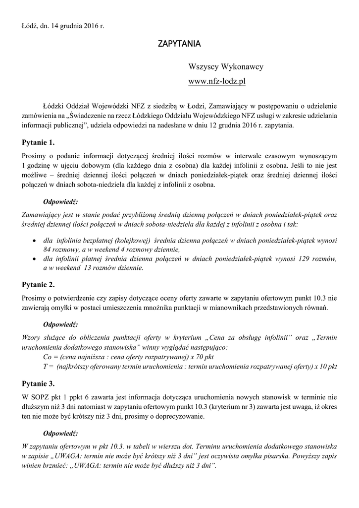 Łódź, dn. 14 grudnia 2016 r. ZAPYTANIA Wszyscy Wykonawcy www.nfz-lodz.pl Łódzki Oddział Wojewódzki NFZ z siedzibą w Łodzi, Zamawiający w postępowaniu o udzielenie zamówienia na „Świadczenie na rzecz Łódzkiego Oddziału Wojewódzkiego NFZ usługi w zakresie udzielania informacji publicznej”, udziela odpowiedzi na nadesłane w dniu 12 grudnia 2016 r. zapytania. Pytanie 1. Prosimy o podanie informacji dotyczącej średniej ilości rozmów w interwale czasowym wynoszącym 1 godzinę w ujęciu dobowym (dla każdego dnia z osobna) dla każdej infolinii z osobna. Jeśli to nie jest możliwe – średniej dziennej ilości połączeń w dniach poniedziałek-piątek oraz średniej dziennej ilości połączeń w dniach sobota-niedziela dla każdej z infolinii z osobna. Odpowiedź: Zamawiający jest w stanie podać przybliżoną średnią dzienną połączeń w dniach poniedziałek-piątek oraz średniej dziennej ilości połączeń w dniach sobota-niedziela dla każdej z infolinii z osobna i tak: dla infolinia bezpłatnej (kolejkowej) średnia dzienna połączeń w dniach poniedziałek-piątek wynosi 84 rozmowy, a w weekend 4 rozmowy dziennie, dla infolinii płatnej średnia dzienna połączeń w dniach poniedziałek-piątek wynosi 129 rozmów, a w weekend 13 rozmów dziennie. Pytanie 2. Prosimy o potwierdzenie czy zapisy dotyczące oceny oferty zawarte w zapytaniu ofertowym punkt 10.3 nie zawierają omyłki w postaci umieszczenia mnożnika punktacji w mianownikach przedstawionych równań. Odpowiedź: Wzory służące do obliczenia punktacji oferty w kryterium „Cena za obsługę infolinii” oraz „Termin uruchomienia dodatkowego stanowiska” winny wyglądać następująco: Co = (cena najniższa : cena oferty rozpatrywanej) x 70 pkt T = (najkrótszy oferowany termin uruchomienia : termin uruchomienia rozpatrywanej oferty) x 10 pkt Pytanie 3. W SOPZ pkt 1 ppkt 6 zawarta jest informacja dotycząca uruchomienia nowych stanowisk w terminie nie dłuższym niż 3 dni natomiast w zapytaniu ofertowym punkt 10.3 (kryterium nr 3) zawarta jest uwaga, iż okres ten nie może być krótszy niż 3 dni, prosimy o doprecyzowanie. Odpowiedź: W zapytaniu ofertowym w pkt 10.3. w tabeli w wierszu dot. Terminu uruchomienia dodatkowego stanowiska w zapisie „UWAGA: termin nie może być krótszy niż 3 dni” jest oczywista omyłka pisarska. Powyższy zapis winien brzmieć: „UWAGA: termin nie może być dłuższy niż 3 dni”. Pytanie 4. Nawiązując do powyższego prosimy o określenie jaka jednostka czasu stanowi minimalną przyjmowaną wartość do oceny tego kryterium, czy to jest dzień, godzina czy też minuta? Odpowiedź: Zamawiający jako minimalną wartość do oceny kryterium „Terminu uruchomienia dodatkowego stanowiska” przyjmuje jednostkę czasu godzinę. Pytanie 5. W SOPZ pkt 1 ppkt 4 są zamieszczone informacje dotyczące maksymalnego średniego czasu oczekiwania na połączenie w skali miesiąca – prosimy tym samym o informacje dotyczące wysokości kar umownych związanych z niewypełnieniem tych parametrów. Odpowiedź: Kary umowne związane z niewypełnieniem parametrów maksymalnego średniego czasu oczekiwania na połączenie w skali miesiąca określa § 7 ust. 2 projektu umowy, stanowiącego załącznik nr 4 do zapytania ofertowego. Pytanie 6. Prosimy o informację co mieści się w szeroko rozumianym zwrocie „nieprawidłowe świadczenie usługi”, o którym mowa w projekcie umowy, paragraf 7 pkt 2. Odpowiedź: Pod pojęciem „nieprawidłowe świadczenie usługi” Zamawiający rozumie każdy przypadek świadczenia usługi w sposób niezgodny z warunkami umowy.