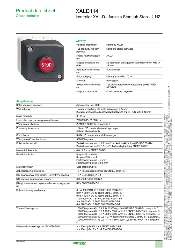 Product data sheet Characteristics XALD114 kontroler XAL-D - funkcja Start lub Stop - 1 NZ Rodzina produktów Harmony XALD Typ produktu lub komponentu Kompleta stacja sterująca Krótka nazwa urządzenia XALD Miejsce docelowe produktu Do jednostek sterujących i sygnalizacyjnych XB5 Ø 22 mm Aplikacja stacji sterującej Funkcja stop Polor pokrywy Ciemny szary RAL 7016 Materiał Poliwęglan Składanie stacji sterującej 1 przycisk natynkowy samoczynny powrót RED 1 NZ STOP Miejsce oznaczenia Oznaczenie na przycisku Uzupełnienie Kolor podstawy obudowy Jasno szary RAL 7035 Wlot kablowy 1 otwór wypychany dla wlotu kablowego ≤ 14 mm 2 otwory wypychane dla dławików kablowych Pg 13 i ISO M20 ≤ 12 mm Masa produktu 0,165 kg Uszczelka odporna na wysokie ciśnienie 7000000 Pa 55 °C 0,1 m Wymuszone otwarcie Z EN/IEC 60947-5-1 załącznik K Przesunięcie robocze 1,5 mm NZ zmiana stanu elektrycznego 4,3 mm skok całkowity Siła robocza 3,5 N NZ zmiana stanu elektrycznego Wytrzymałość mechaniczna 5000000 cycles Połączenia - zaciski Zaciski śrubowe >= 1 x 0,22 mm² bez końcówki kablowej EN/IEC 60947-1 Zaciski śrubowe <= 2 x 1,5 mm² z końcówką kablową EN/IEC 60947-1 Moment dokręcania 0,8...1,2 N.m EN/IEC 60947-1 Kształt łba śruby Krzyżak Pozidriv No 1 Krzyżak Philips nr 1 Perforowany płaska Ø 4 mm Perforowany płaska Ø 5.5 mm Materiał styków Stop srebra (Ag/Ni) Zabezpieczenie zwarciowe 10 A kaseta bezpiecznika gG EN/IEC 60947-5-1 [Ith] znamionowy prąd cieplny - przestrzeń otwarta 10 A EN/IEC 60947-5-1 [Ui] napięcie znamionowe izolacji 600 V 3 EN/IEC 60947-1 [Uimp] znamionowe napięcie udarowe wytrzymywane 6 kV EN/IEC 60947-1 [Ie] znamionowy prąd pracy 0,1 A 600 V DC-13 Q600 EN/IEC 60947-5-1 0,27 A 250 V DC-13 Q600 EN/IEC 60947-5-1 0,55 A 125 V DC-13 Q600 EN/IEC 60947-5-1 1,2 A 600 V AC-15 A600 EN/IEC 60947-5-1 3 A 240 V AC-15 A600 EN/IEC 60947-5-1 6 A 120 V AC-15 A600 EN/IEC 60947-5-1 Trwałość elektryczna 1000000 cycles AC-15 4 A 24 V 3600 cyc/h 0,5 EN/IEC 60947-5-1 załącznik C 1000000 cycles AC-15 3 A 120 V 3600 cyc/h 0,5 EN/IEC 60947-5-1 załącznik C 1000000 cycles AC-15 2 A 230 V 3600 cyc/h 0,5 EN/IEC 60947-5-1 załącznik C 1000000 cycles DC-13 0,5 A 24 V 3600 cyc/h 0,5 EN/IEC 60947-5-1 załącznik C 1000000 cycles DC-13 0,2 A 110 V 3600 cyc/h 0,5 EN/IEC 60947-5-1 załącznik C Niezawodność elektryczna IEC 60947-5-4 Λ < 10exp(-6) 5 V 1 mA EN/IEC 60947-5-4 Λ < 10exp(-8) 17 V 5 mA EN/IEC 60947-5-4 2012-04-12 1 The information provided in this documentation contains general descriptions and/or technical characteristics of the performance of the products contained herein. This documentation is not intended as a substitute for and is not to be used for determining suitability or reliability of these products for specific user applications. It is the duty of any such user or integrator to perform the appropriate and complete risk analysis, evaluation and testing of the products with respect to the relevant specific application or use thereof. Neither Schneider Electric Industries SAS nor any of its affiliates or subsidiaries shall be responsible or liable for misuse of the information contained herein. Główny Środowisko Działanie ochronne TH Temepratura otoczenia dla przechowywania -40...70 °C Temepratura otoczenia dla pracy -25...70 °C Klasa ochrony przez porażeniem prądem elektryczny Klasa II IEC 60536 Stopień ochrony IP IP65 IEC 60529 Stopień ochrony NEMA NEMA 13 NEMA 4X Stopień ochrony IK IK03 EN 50102 Normy CSA C22-2 nr 14 EN/IEC 60947-1 EN/IEC 60947-5-1 EN/IEC 60947-5-4 EN/IEC 60947-5-5 JIS C 4520 UL 508 Certyfikacja produktu CSA UL w spisie Odporność na wibracje 5 gn 12...500 Hz IEC 60068-2-6 Odporność na wstrząsy 30 gn 18 ms przyspieszenie półsinusoidalne IEC 60068-2-27 50 gn 11 ms przyspieszenie półsinusoidalne IEC 60068-2-27 RoHS EUR conformity date 0807 RoHS EUR status Compliant 2