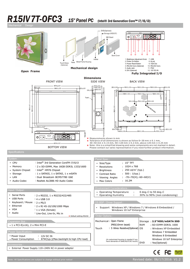 R15IV7T-OFC3 Mechanical 15" Panel PC Design (Intel® 3rd Generation Core™ i7/i5/i3) Storage (HDD/CF) USB USB USB USB RJ45 RJ45 RS232 SBC Board VR SDVO VGA RS232 RS232 RS232 PS2 DC IN PS2 Audio 1 Back Cover Inverter Touch/Glass (Optional) 6 4 11 10 8 12 1. Brightness Adjustment Knob 7. USB 2. Power On Button 8. RJ-45 3. Power Reset Button 9. VGA Out 4. RS-232 Conn.(Optional) 10. RS-232 Conn. 5. Audio Jack 11. PS/2 6. DVI (Optional) 12. 12V DC-IN Panel Metal Frame Housing Mechanical design Open Frame 9 7 5 3 2 Fully Integrated I/O Dimensions SIDE VIEW FRONT VIEW USB USB USB USB RJ45 RJ45 RS232 VR SDVO VGA RS232 RS232 RS232 PS2 BACK VIEW DC IN PS2 Audio BOTTOM VIEW Measurements shown in mm * Tolerance dimensions is shown as follow 0~30 mm ± 0.1 mm, * 30~50 mmof±all0.15 mm, 50~120 mm ± 0.2 mm, above 120 mm ± 0.25 mm Note: this is a simplified drawing and some components are not marked in detail. * Please contact our sales representative if you need further product information. Specifications System : Panel Spec : CPU : Intel® 3rd Generation CoreTM i7/i5/i3 Size/Type : 15" TFT Memory : 2 x SO-DIMM, Max 16GB DDR3L 1333/1600 : Intel® HM76 Chipset Resolutions : 1024 x 768 Brightness : 250 cd/m (typ.) : 1 x SATAIII, 1 x SATAII, 1 x mSATA : Dual Broadcom BCM57780 GbE Contrast Ratio : 500 : 1(typ.) LAN Viewing Angles : -70~70(H);-60~60(V) Audio Codec : Realtek ALC886 HD Audio Codec Max Colors : 16.2M System Chipset Storage Environment Considerations : Input / Output : Serial Ports : 2 x RS232, 1 x RS232/422/485 USB Ports : 4 x USB 3.0 Keyboard / Mouse : 2 x PS/2 Ethernet VGA Audio 2 : 2 x RJ 45-10/100/1000 Mbps : 1 x VGA (female) : Line-Out, Line-In, Mic in Operating Temperature Operating Humidity Windows XP / Windows 7 / Windows 8 Embedded / Windows 10 IoT Enterprise Order Options : Mechanical : Open Frame Expansion Slot : 0 deg.C to 50 deg.C 30% to 90% (non condensing) OS BSP / Driver Support : Support Default setting:RS232 : : Storage : 2.5”HDD/mSATA SSD : SO-DIMM DDR3L 1600 IP65(10mm bezel) 1 x PCI-E(x16), 2 x Mini PCI-E Touch RAM : 5 Wires Resistive(Optional) OS Power Specifications : Power Input Power Consumption : Windows XP Embedded Windows 7 Embedded : 12V DC IN : 87W (typ.)(Max.backlight & high CPU load) Accessories : Windows 8 Embedded (A customized housing is needed if you have demands of SAW/IR/IT/SC touch) Windows 10 IoT Enterprise DVD : Yes(Optional) External Power Supply 110~240V AC-in power adapter Note: All Specifications are subject to change without prior notice! Revised date: 06/17/2016 V1.2