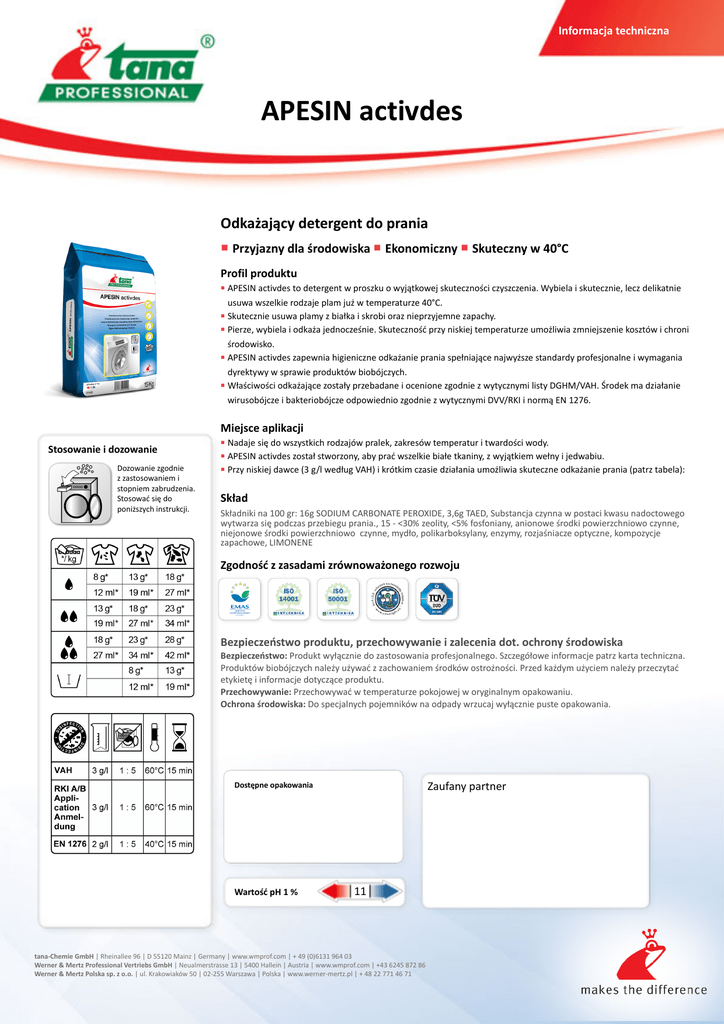 Informacja techniczna APESIN activdes Odkażający detergent do prania ■ Przyjazny dla środowiska ■ Ekonomiczny ■ Skuteczny w 40°C Profil produktu APESIN activdes to detergent w proszku o wyjątkowej skuteczności czyszczenia. Wybiela i skutecznie, lecz delikatnie usuwa wszelkie rodzaje plam już w temperaturze 40°C. ■ Skutecznie usuwa plamy z białka i skrobi oraz nieprzyjemne zapachy. ■ Pierze, wybiela i odkaża jednocześnie. Skuteczność przy niskiej temperaturze umożliwia zmniejszenie kosztów i chroni środowisko. ■ APESIN activdes zapewnia higieniczne odkażanie prania spełniające najwyższe standardy profesjonalne i wymagania dyrektywy w sprawie produktów biobójczych. ■ Właściwości odkażające zostały przebadane i ocenione zgodnie z wytycznymi listy DGHM/VAH. Środek ma działanie wirusobójcze i bakteriobójcze odpowiednio zgodnie z wytycznymi DVV/RKI i normą EN 1276. ■ Miejsce aplikacji Stosowanie i dozowanie Dozowanie zgodnie z zastosowaniem i stopniem zabrudzenia. Stosować się do poniższych instrukcji. Nadaje się do wszystkich rodzajów pralek, zakresów temperatur i twardości wody. APESIN activdes został stworzony, aby prać wszelkie białe tkaniny, z wyjątkiem wełny i jedwabiu. ■ Przy niskiej dawce (3 g/l według VAH) i krótkim czasie działania umożliwia skuteczne odkażanie prania (patrz tabela): ■ ■ Skład Składniki na 100 gr: 16g SODIUM CARBONATE PEROXIDE, 3,6g TAED, Substancja czynna w postaci kwasu nadoctowego wytwarza się podczas przebiegu prania., 15 - <30% zeolity, <5% fosfoniany, anionowe środki powierzchniowo czynne, niejonowe środki powierzchniowo czynne, mydło, polikarboksylany, enzymy, rozjaśniacze optyczne, kompozycje zapachowe, LIMONENE Zgodność z zasadami zrównoważonego rozwoju Bezpieczeństwo produktu, przechowywanie i zalecenia dot. ochrony środowiska Bezpieczeństwo: Produkt wyłącznie do zastosowania profesjonalnego. Szczegółowe informacje patrz karta techniczna. Produktów biobójczych należy używać z zachowaniem środków ostrożności. Przed każdym użyciem należy przeczytać etykietę i informacje dotyczące produktu. Przechowywanie: Przechowywać w temperaturze pokojowej w oryginalnym opakowaniu. Ochrona środowiska: Do specjalnych pojemników na odpady wrzucaj wyłącznie puste opakowania. Zaufany partner Dostępne opakowania Wartość pH 1 % 11 tana-Chemie GmbH | Rheinallee 96 | D 55120 Mainz | Germany | www.wmprof.com | + 49 (0)6131 964 03 Werner & Mertz Professional Vertriebs GmbH | Neualmerstrasse 13 | 5400 Hallein | Austria | www.wmprof.com | +43 6245 872 86 Werner & Mertz Polska sp. z o.o. | ul. Krakowiaków 50 | 02-255 Warszawa | Polska | www.werner-mertz.pl | + 48 22 771 46 71