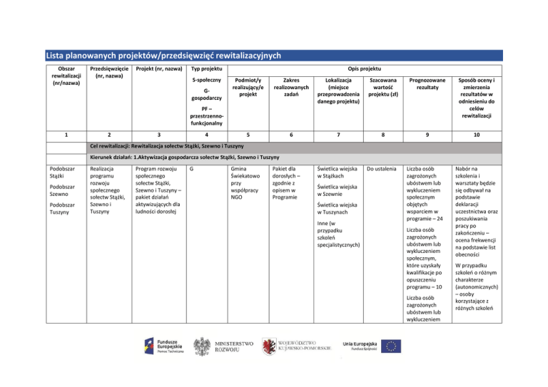 Lista planowanych projektów/przedsięwzięć rewitalizacyjnych Obszar rewitalizacji (nr/nazwa) Przedsięwzięcie (nr, nazwa) Projekt (nr, nazwa) Typ projektu S-społeczny Ggospodarczy Opis projektu Podmiot/y realizujący/e projekt Zakres realizowanych zadań Lokalizacja (miejsce przeprowadzenia danego projektu) Szacowana wartość projektu (zł) Prognozowane rezultaty Sposób oceny i zmierzenia rezultatów w odniesieniu do celów rewitalizacji 5 6 7 8 9 10 Świetlica wiejska w Stążkach Do ustalenia PF – przestrzennofunkcjonalny 1 2 3 4 Cel rewitalizacji: Rewitalizacja sołectw Stążki, Szewno i Tuszyny Kierunek działań: 1.Aktywizacja gospodarcza sołectw Stążki, Szewno i Tuszyny Podobszar Stążki Podobszar Szewno Podobszar Tuszyny Realizacja programu rozwoju społecznego sołectw Stążki, Szewno i Tuszyny Program rozwoju społecznego sołectw Stążki, Szewno i Tuszyny – pakiet działań aktywizujących dla ludności dorosłej G Gmina Świekatowo przy współpracy NGO Pakiet dla dorosłych – zgodnie z opisem w Programie Świetlica wiejska w Szewnie Świetlica wiejska w Tuszynach Inne (w przypadku szkoleń specjalistycznych) Liczba osób zagrożonych ubóstwem lub wykluczeniem społecznym objętych wsparciem w programie – 24 Liczba osób zagrożonych ubóstwem lub wykluczeniem społecznym, które uzyskały kwalifikacje po opuszczeniu programu – 10 Liczba osób zagrożonych ubóstwem lub wykluczeniem Nabór na szkolenia i warsztaty będzie się odbywał na podstawie deklaracji uczestnictwa oraz poszukiwania pracy po zakończeniu – ocena frekwencji na podstawie list obecności W przypadku szkoleń o różnym charakterze (autonomicznych) – osoby korzystające z różnych szkoleń społecznym poszukujących pracy po opuszczeniu programu - 18 będą liczone pojedynczo Liczba osób uzyskujących kwalifikacje – na podstawie wydanych dokumentów potwierdzających ich uzyskanie Liczba osób poszukujących pracy po zakończeniu programu – na podstawie imiennego wywiadu środowiskowego z osobami uczestniczącymi w szkoleniach i warsztatach Podobszar Szewno Realizacja programu rozwoju społecznego sołectw Stążki, Szewno i Tuszyny Zakup sprzętu pływającego dla gospodarczego i rekreacyjnego wykorzystania potencjału Jeziora Branickiego G/S Gmina Świekatowo Do ustalenia Szewno Do ustalenia Liczba wspartych obiektów infrastruktury zlokalizowanych na rewitalizowanych obszarach – 1 Do ustalenia Liczba osób zagrożonych ubóstwem lub wykluczeniem Cel rewitalizacji: Rewitalizacja sołectw Stążki, Szewno i Tuszyny Kierunek działań: 2: Przeciwdziałanie wykluczeniom społecznym w sołectwach Stążki, Szewno i Tuszyny Podobszar Stążki Realizacja programu rozwoju społecznego Program rozwoju społecznego sołectw Stążki, Szewno i Tuszyny – S Gmina Świekatowo przy Cykl zajęć mających na celu poprawę wyników Świetlica wiejska w Stążkach Nabór na podstawie deklaracji uczestnictwa – Podobszar Szewno Podobszar Tuszyny sołectw Stążki, Szewno i Tuszyny pakiet działań przeciwdziałających wkluczeniom dla dzieci i młodzieży współpracy NGO kształcenia dzieci i młodzieży uczęszczających do szkół prowadzonych przez samorząd gminy Świetlica wiejska w Szewnie Świetlica wiejska w Tuszynach społecznym objętych wsparciem w programie - 36 ocena frekwencji na podstawie list obecności Liczba osób zagrożonych ubóstwem lub wykluczeniem społecznym objętych wsparciem w programie - 30 Nabór na podstawie deklaracji uczestnictwa – ocena frekwencji na podstawie list obecności Cykl zajęć mających na celu szeroko rozumiany rozwój społeczny dzieci i młodzieży Podobszar Stążki Podobszar Szewno Podobszar Tuszyny Realizacja programu rozwoju społecznego sołectw Stążki, Szewno i Tuszyny Program rozwoju społecznego sołectw Stążki, Szewno i Tuszyny – rozwój aktywności ruchowej dzieci i młodzieży S Gmina Świekatowo przy współpracy NGO regularne zajęcia sportowe dla dzieci i młodzieży, prowadzone przez trenera – mające na celu wzrost aktywności ruchowej, integrację, wyrobienie zdolności działań w grupie (drużynie), a także wykorzystanie autorytetu Do ustalenia Do ustalenia trenera w kształtowaniu prawidłowych postaw Zakup ujednoliconych strojów sportowych dla uczestników zajęć sportowych Podobszar Stążki Realizacja programu rozwoju społecznego sołectw Stążki, Szewno i Tuszyny Program rozwoju społecznego sołectw Stążki, Szewno i Tuszyny – pakiet działań przeciwdziałających wkluczeniom dla seniorów S Gmina Świekatowo przy współpracy NGO Cykle zajęć integracyjnych dla seniorów Świetlica wiejska w Stążkach Do ustalenia Liczba osób zagrożonych ubóstwem lub wykluczeniem społecznym objętych usługami społecznymi świadczonymi w interesie ogólnym w programie - 10 Podobszar Tuszyny Realizacja programu rozwoju społecznego sołectw Stążki, Szewno i Tuszyny Doposażenie świetlicy w Tuszynach w sprzęt służący integracji społeczności lokalnej i rozwojowi społecznemu S Gmina Świekatowo Zakup gier planszowych Świetlica wiejska w Tuszynach Do ustalenia Liczba wspartych obiektów infrastruktury zlokalizowanych na rewitalizowanych obszarach – 1 Zakup wyposażenia i sprzętu sportowego Liczba wspartych w programie miejsc świadczenia usług społecznych istniejących po Nabór na podstawie deklaracji uczestnictwa – ocena frekwencji na podstawie list obecności zakończeniu projektu - 1 Cel rewitalizacji: Rewitalizacja sołectw Stążki, Szewno i Tuszyny Kierunek działań: 3. Rozwój infrastruktury dla rozwoju społecznego w sołectwach Stążki, Szewno i Tuszyny Podobszar Stążki Rozwój infrastruktury rozwoju społecznego w sołectwach Stążki, Szewno i Tuszyny Przebudowa budynku świetlicy wiejskiej w Stążkach PF Gmina Świekatowo Do ustalenia Świetlica wiejska w Stążkach Do ustalenia Liczba wspartych obiektów infrastruktury zlokalizowanych na rewitalizowanych obszarach – 