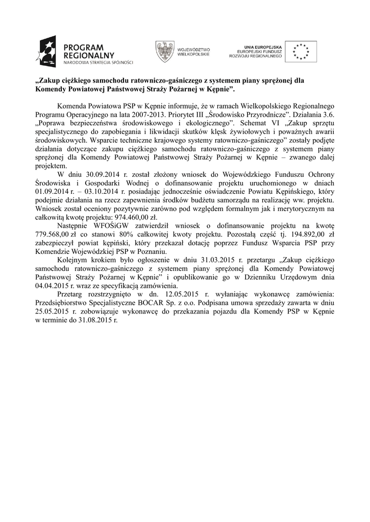 „Zakup ciężkiego samochodu ratowniczo-gaśniczego z systemem piany sprężonej dla Komendy Powiatowej Państwowej Straży Pożarnej w Kępnie”. Komenda Powiatowa PSP w Kępnie informuje, że w ramach Wielkopolskiego Regionalnego Programu Operacyjnego na lata 2007-2013. Priorytet III „Środowisko Przyrodnicze”. Działania 3.6. „Poprawa bezpieczeństwa środowiskowego i ekologicznego”. Schemat VI „Zakup sprzętu specjalistycznego do zapobiegania i likwidacji skutków klęsk żywiołowych i poważnych awarii środowiskowych. Wsparcie techniczne krajowego systemy ratowniczo-gaśniczego” zostały podjęte działania dotyczące zakupu ciężkiego samochodu ratowniczo-gaśniczego z systemem piany sprężonej dla Komendy Powiatowej Państwowej Straży Pożarnej w Kępnie – zwanego dalej projektem. W dniu 30.09.2014 r. został złożony wniosek do Wojewódzkiego Funduszu Ochrony Środowiska i Gospodarki Wodnej o dofinansowanie projektu uruchomionego w dniach 01.09.2014 r. – 03.10.2014 r. posiadając jednocześnie oświadczenie Powiatu Kępińskiego, który podejmie działania na rzecz zapewnienia środków budżetu samorządu na realizację ww. projektu. Wniosek został oceniony pozytywnie zarówno pod względem formalnym jak i merytorycznym na całkowitą kwotę projektu: 974.460,00 zł. Następnie WFOŚiGW zatwierdził wniosek o dofinansowanie projektu na kwotę 779.568,00 zł co stanowi 80% całkowitej kwoty projektu. Pozostałą część tj. 194.892,00 zł zabezpieczył powiat kępiński, który przekazał dotację poprzez Fundusz Wsparcia PSP przy Komendzie Wojewódzkiej PSP w Poznaniu. Kolejnym krokiem było ogłoszenie w dniu 31.03.2015 r. przetargu „Zakup ciężkiego samochodu ratowniczo-gaśniczego z systemem piany sprężonej dla Komendy Powiatowej Państwowej Straży Pożarnej w Kępnie” i opublikowanie go w Dzienniku Urzędowym dnia 04.04.2015 r. wraz ze specyfikacją zamówienia. Przetarg rozstrzygnięto w dn. 12.05.2015 r. wyłaniając wykonawcę zamówienia: Przedsiębiorstwo Specjalistyczne BOCAR Sp. z o.o. Podpisana umowa sprzedaży zawarta w dniu 25.05.2015 r. zobowiązuje wykonawcę do przekazania pojazdu dla Komendy PSP w Kępnie w terminie do 31.08.2015 r.