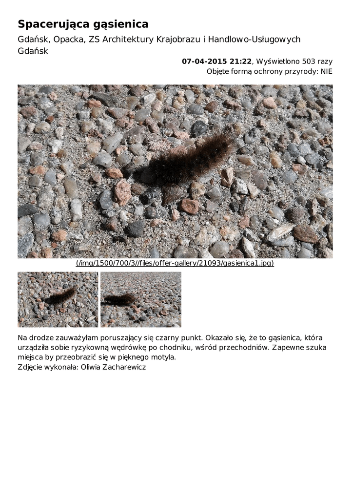 Spacerująca gąsienica Gdańsk, Opacka, ZS Architektury Krajobrazu i Handlowo-Usługowych Gdańsk 07-04-2015 21:22, Wyświetlono 503 razy Objęte formą ochrony przyrody: NIE (/img/1500/700/3//files/offer-gallery/21093/gasienica1.jpg) Na drodze zauważyłam poruszający się czarny punkt. Okazało się, że to gąsienica, która urządziła sobie ryzykowną wędrówkę po chodniku, wśród przechodniów. Zapewne szuka miejsca by przeobrazić się w pięknego motyla. Zdjęcie wykonała: Oliwia Zacharewicz