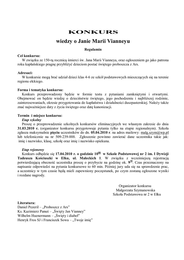 KONKURS wiedzy o Janie Marii Vianneyu Regulamin Cel konkursu: W związku ze 150-tą rocznicą śmierci św. Jana Marii Vianneya, oraz ogłoszeniem go jako patrona roku kapłańskiego pragnę przybliżyć dzieciom postać świętego proboszcza z Ars. Adresaci: W konkursie mogą brać udział dzieci klas 4-6 ze szkół podstawowych mieszczących się na terenie regionu ełckiego. Forma i tematyka konkursu: Konkurs przeprowadzony będzie w formie testu z pytaniami zamkniętymi i otwartymi. Obejmować on będzie wiedzę o dzieciństwie świętego, jego pochodzeniu i najbliższej rodzinie, zainteresowaniach, okresie przygotowania do kapłaństwa i działalności duszpasterskiej. Należy także znać najważniejsze daty z życia świętego oraz datę kanonizacji. Termin i miejsce konkursu: Etap szkolny Proszę o przeprowadzenie szkolnych konkursów eliminacyjnych we własnym zakresie do dnia 31.03.2010 r. (organizator konkursu przygotowuje pytania tylko na etapie regionalnym). Szkoła zgłasza maksymalnie pięciu uczestników do dn. 05.04.2010 r. na adres mailowy: [email protected] lub telefonicznie na nr 509-239-888. Zgłoszenie powinno zawierać dane uczestnika takie jak: imię i nazwisko, klasę, szkołę oraz imię i nazwisko opiekuna. Etap rejonowy Konkurs odbędzie się 17.04.2010 r. o godzinie 1000 w Szkole Podstawowej nr 2 im. I Dywizji Tadeusza Kościuszki w Ełku, ul. Małeckich 1. W związku z wcześniejszą rejestracją potwierdzającą obecność uczestnika proszę o przybycie na godzinę ok. 930. Czas przeznaczony na napisanie odpowiedzi na pytania konkursowe to 60 min. Później jury uda się na sprawdzenie prac, a uczestnicy w tym czasie będą mieli zapewniony poczęstunek, po czym zostaną ogłoszone wyniki i rozdane nagrody. Organizator konkursu Małgorzata Szymanowska Szkoła Podstawowa nr 2 w Ełku Literatura: Daniel Pezeril – „Proboszcz z Ars” Ks. Kazimierz Panuś – „Święty Jan Vianney” Wilhelm Huenermann – „Święty i diabeł” Henryk Fros SJ i Franciszek Sowa – „Twoje imię”