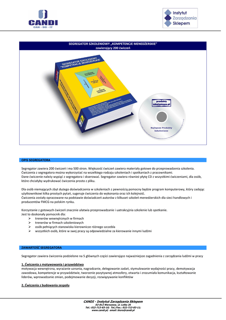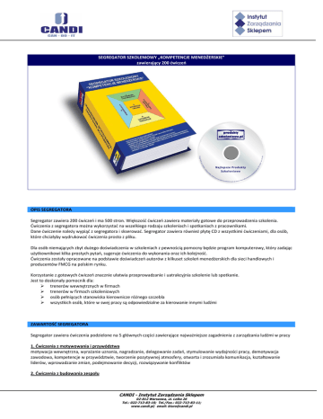 SEGREGATOR SZKOLENIOWY „KOMPETENCJE MENEDŻERSKIE” zawierający 200 ćwiczeń OPIS SEGREGATORA Segregator zawiera 200 ćwiczeń i ma 500 stron. Większość ćwiczeń zawiera materiały gotowe do przeprowadzenia szkolenia. Ćwiczenia z segregatora można wykorzystać na wszelkiego rodzaju szkoleniach i spotkaniach z pracownikami. Dane ćwiczenie należy wypiąć z segregatora i skserować. Segregator zawiera również płytę CD z wszystkimi ćwiczeniami, dla osób, które chciałyby wydrukować ćwiczenia prosto z pliku. Dla osób niemających zbyt dużego doświadczenia w szkoleniach z pewnością pomocny będzie program komputerowy, który zadając użytkownikowi kilka prostych pytań, sugeruje ćwiczenia do wykonania oraz ich kolejność. Ćwiczenia zostały opracowane na podstawie doświadczeń autorów z kilkuset szkoleń menedżerskich dla sieci handlowych i producentów FMCG na polskim rynku. Korzystanie z gotowych ćwiczeń znacznie ułatwia przeprowadzanie i uatrakcyjnia szkolenie lub spotkanie. Jest to doskonały pomocnik dla: trenerów wewnętrznych w firmach trenerów w firmach szkoleniowych osób pełniących stanowiska kierownicze różnego szczebla wszystkich osób, które w swej pracy są odpowiedzialne za kierowanie innymi ludźmi ZAWARTOŚĆ SEGREGATORA Segregator zawiera ćwiczenia podzielone na 5 głównych części zawierające najważniejsze zagadnienia z zarządzania ludźmi w pracy 1. Ćwiczenia z motywowania i przywództwa motywacja wewnętrzna, wyrażanie uznania, nagradzanie, delegowanie zadań, stymulowanie wydajności pracy, demotywacja zawodowa, kompetencje w przywództwie, tworzenie pozytywnej atmosfery, otwarta i zrozumiała komunikacja, kształtowanie liderów, wprowadzanie zmian, podejmowanie decyzji, rozwiązywanie konfliktów 2. Ćwiczenia z budowania zespołu CANDI - Instytut Zarządzania Sklepem 02-812 Warszawa, ul. Lelka 26 Tel.: 022-713-83-10; Tel./Fax.: 022-713-83-11; www.candi.pl; email: [email protected] definiowanie ról w zespole, angażowanie pracowników w realizacje celów, praca zespołowa, rozwiązywanie problemów, komunikacja w zespole 3. Ćwiczenia z zarządzania personelem rekrutacja, wprowadzanie do pracy, rozmowy wyjaśniająco-dyscyplinujące, delegowanie zadań, wydawanie poleceń, oceny pracy, rozmowy zwalniające 4. Ćwiczenia z komunikacji umiejętność aktywnego słuchania, skuteczne przekazywanie poleceń, jasne formułowanie komunikatów, autoprezentacja, komunikacja niewerbalna, udzielanie krytyki i pochwał 5. Ćwiczenia integrujące i relaksujące ćwiczenia, których celem jest rozluźnienie atmosfery, pobudzenie umysłu do wysiłku, wprowadzanie ciekawego i interesującego przerywnika; ćwiczenia mają formę m. in.: układanek, quizów, zadań arytmetycznych, logicznych, słownych i ruchowych Większość ćwiczeń zawiera załączniki-materiały gotowe do przeprowadzenia szkolenia, dlatego aby ułatwić przygotowywanie materiałów ćwiczeniowych, przygotowano je na osobnych arkuszach, w celu łatwego skopiowania odpowiedniej ilości. Spis treści przygotowano w taki sposób, aby zawierał wszystkie niezbędne informacje ułatwiające dobór właściwych ćwiczeń do potrzeb uczestników szkolenia/ spotkania. Prócz spisu ćwiczeń, zawiera cel ćwiczenia, rodzaj, czas trwania, poziom trudności i ilość załączników. Każde ćwiczenie opisane jest według schematu: Tytuł: Cel: Rodzaj ćwiczenia: Poziom ćwiczenia: Potrzebne materiały: Czas: Ilość osób: Opis ćwiczenia: O co zapytać: Jak podsumować: Ogólna nazwa ćwiczenia Czego dotyczy ćwiczenie, jakie rozwija umiejętności Np. Indywidualny, grupowy, dyskusja, praca w grupach, quiz, itp. Jeden z trzech poziomów: początkujący, średniozaawansowany, zaawansowany Przedmioty, które uczestnicy będą potrzebowali do wykonania ćwiczenia Czas potrzebny na wykonanie ćwiczenia Ilość uczestników danego ćwiczenia Opis tego, w jaki sposób należy ćwiczenie wykonać Pytania, które można zadać, aby ułatwić wyciąganie wniosków z wykonania ćwiczenia Informacje wyjaśniające sens ćwiczenia i wnioski, jakie mogą z niego wynikać, oraz jego przydatność w pracy ĆWICZENIA I WYSZUKIWARKA NA CD Segregator zawiera również płytę CD z wszystkimi ćwiczeniami, dla osób, które chciałyby wydrukować ćwiczenia prosto z pliku, oraz program komputerowy, który w szybki i łatwy sposób pomaga w wyborze właściwych ćwiczeń, które najbardziej odpowiadają potrzebom osoby korzystającej z segregatora. Poprzez wybór 4 żądanych opcji filtrów, program pokaże na ekranie te ćwiczenia, które spełniają wybrane kryteria. Te filtry to: filtr wg bloku tematycznego (motywowanie i przewodzenie; budowanie zespołu; zarządzanie personelem; komunikacja; integracja i relaks) filtr wg rodzaju ćwiczenia (indywidualne czy grupowe) filtr wg czasu trwania ćwiczenia (<5 minut; 6-10 minut; 11-20 minut; >20 minut) filtr wg poziomu zaawansowania ćwiczących (dla wszystkich; początkujący; średnio zaawansowany; zaawansowany) --------------------------------------------------------------------------------------------------------------------------------------------------- CANDI - Instytut Zarządzania Sklepem 02-812 Warszawa, ul. Lelka 26 Tel.: 022-713-83-10; Tel./Fax.: 022-713-83-11; www.candi.pl; email: [email protected] FILTRY EFEKTY WYSZUKIWANIA ĆWICZEŃ Ikony pozwalają na poruszanie się po programie. Ikona „drukuj” pozwala na wydruk listy ćwiczeń, które wybraliśmy – dodatkowo lista pokazuje informacje o celu każdego ćwiczenia. Ikony „strzałki” pozwalają na przejścia do odpowiedniej pozycji na liście ćwiczeń: w górę, w dół, na sam początek listy i na jej koniec. Ikona „Koniec” pozwala na zamknięcie programu. ZAMÓWIENIE SEGREGATORA Aby zamówić segregator należy wydrukować formularz zamówienia (od pobrania tutaj), wypełnić , oraz przesłać faxem pod nr 022 713 83 11, lub mailem na adres [email protected]. Tutaj m
