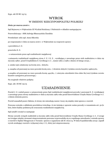 Sygn. akt III RC 25/15 WYROK W IMIENIU RZECZYPOSPOLITEJ POLSKIEJ Dnia 30 marca 2016 r. Sąd Rejonowy w Wąbrzeźnie III Wydział Rodzinny i Nieletnich w składzie następującym: Przewodniczący : SSR Jadwiga Błaszczyńska-Żuralska Protokolant: sekr.sąd. Anna Sikorska po rozpoznaniu w dniu 22 marca 2016 r. w Wąbrzeźnie na rozprawie sprawy z powództwa J. Z. przeciwko E. Z. - o ustanowienie przez sąd rozdzielności majątkowej 1.ustanawia rozdzielność majątkową stron J. Z. i E. Z. , wynikającą z zawartego przez nich małżeństwa w dniu 09 stycznia 1982r. przed Urzędnikiem S. Cywilnego w J. , numer aktu 1/1982 z dniem 16 lutego 2015r.,2. ustala wpis ostateczny na kwotę 200,- złotych,3. zasądza od pozwanej na rzecz powoda kwotę 200,- ( dwieście złotych ) tytułem zwrotu kosztów sądowych,4.zasądza od pozwanej na rzecz powoda kwotę 442,80,- ( czterysta czterdzieści dwa złote 80/100) tytułem zwrotu kosztów zastępstwa procesowego,Na oryginale właściwe podpisy. Sygn. akt. III RC 25/15 UZASADNIENIE Powód J. Z. wniósł pozew o ustanowienie przez Sąd rozdzielności majątkowej powoda i pozwanej E. Z. wynikającej z zawartego przez strony małżeństwa w dniu 9 stycznia 1982 roku przed kierownikiem Urzędu Stanu Cywilnego w J. z dniem złożenia pozwu. Powód uzasadnił pozew faktem, iż strony nie mieszkają razem i toczy się między nimi sprawa o rozwód. Pozwana wniosła o oddalenie powództwa twierdząc, iż nie istnieją w sprawie ważne powody w rozumieniu art. 52 §1 krio, które byłyby podstawą do orzeczenia rozdzielności majątkowej. Sąd ustalił i zważył co następuje: Strony zawarły związek małżeński 9 stycznia 1982 roku przed kierownikiem Urzędu Stanu Cywilnego w J.. Z uwagi na trwające między stronami nieporozumienia pozwana wyprowadziła się ze wspólnego mieszkania i wniosła sprawę o rozwód w Sądzie Okręgowym w Toruniu- sprawa o sygnaturze akt IC 1610/14. W dniu 8 października 2015r. zapadł wyrok orzekający rozwód z wyłącznej winy J. Z., który jest nieprawomocny. Strony mieszkają osobno i nie prowadzą wspólnego gospodarstwa domowego. Powód prowadzi działalność gospodarczą- transport samochodowy i według jego twierdzeń powinien zaciągnąć kredyty, na które potrzebna jest zgoda żony. Strony nie dokonały żadnego dobrowolnego podziału majątku wspólnego. Wszystkie wspólne ruchomości pozostały w mieszkaniu, które pozwana opuściła. Strony posiadają dwa wspólne mieszkania i samochody w firmie powoda. Powyższy stan faktyczny Sąd ustalił na podstawie zebranych w sprawie dokumentów, dowodu z zeznań świadków- M. Z. (k.41), Z. D. (k.52), I. S. (k.115) oraz dowodu z przesłuchania stron (k. 165, 166). Wyrokiem z dnia 30 marca 2016 roku Sąd ustanowił rozdzielność majątkową stron z dniem 16 lutego 2015 roku, tj. z dniem wniesienia pozwu. Zgodnie z art. 52 §1 krio z różnych powodów każdy z małżonków może żądać ustanowienia przez Sąd rozdzielności majątkowej. W przedmiotowej sprawie zachodzą ważne powody w rozumieniu tego przepisu, choćby przez fakt, iż strony żyją w separacji faktycznej, która uniemożliwia im współdziałanie majątkiem wspólnym. Powód prowadzi działalność gospodarczą, przy której wiarygodne jest jego twierdzenie, iż stwarza ona potrzebę brania kredytów. Sprzeczne zeznania stron na ten temat świadczą o braku porozumienia w tej kwestii. Z zaświadczenia Starostwa Powiatowego w W. z dnia 22 maja 2015 roku wynika, że powód bez zgody żony zbył pojazdy mechaniczne stanowiące wspólny majątek stron, a więc zaistniała sytuacja, która stwarza zagrożenie interesów majątkowych małżonków. W tym stanie rzeczy na mocy cytowanych przepisów orzekł Sąd jak w sentencji. O kosztach orzeczono na mocy art. 98 kpc. Sędzia