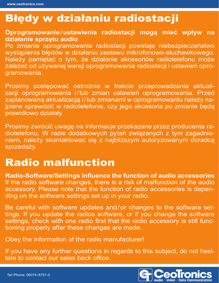 www.ceotronics.com Błędy w działaniu radiostacji Oprogramowanie / ustawienia radiostacji mogą mieć wpływ na działanie sprzętu audio Po zmianie oprogramowania radiostacji powstaje niebezpieczeństwo wystąpienia błędów w działaniu zestawu mikrofonowo-słuchawkowego. Należy pamiętać o tym, że działanie akcesoriów radiotelefonu może zależeć od używanej wersji oprogramowania radiostacji i ustawień oprogramowania. Prosimy postępować ostrożnie w trakcie przeprowadzania aktualizacji oprogramowania i / lub zmian ustawień oprogramowania. Przed zaplanowaną aktualizacją i / lub zmianami w oprogramowaniu należy najpierw sprawdzić w radiotelefonie, czy jego akcesoria po zmianie będą prawidłowo działały. Prosimy zwrócić uwagę na informacje przekazane przez producenta radiotelefonu. W razie dodatkowych pytań związanych z tym zagadnieniem, należy skontaktować się z najbliższym autoryzowanym doradcą sprzedaży. Radio malfunction Radio-Software/Settings influence the function of audio accessories If the radio software changes, there is a risk of malfunction of the audio accessory. Please note that the function of radio accessories is depending on the software settings set up in your radio. Be careful with software updates and / or changes to the software settings. If you update the radios software, or if you change the software settings, check with one radio first that the radio accessory is still functioning properly after these changes are made. Obey the information of the radio manufacturer! If you have any further questions in regards to this subject, do not hesitate to contact our sales back office. Tel / Phone: 06074 / 8751-0 Geschäftsbericht 09/10 I 1