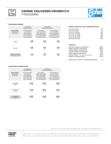 CENNIK OGŁOSZEŃ DROBNYCH TYGODNIKI OGŁOSZENIA DROBNE TYGODNIKI MAZOWIECKIE Cena netto cena brutto (z VAT-em) echo kozienickie, echo powiśla echo przysuchy echo szydłowca echo znad pilicy echo radomskie 3,80 4,67 zwykłe RABATY (NIE DOTYCZĄ TOWARZYSKICH) TYGODNIKI ŚWIĘTOKRZYSKIE echo buskie, echo kazimierskie echo opatowskie, echo pińczowskie echo sandomierskie, echo staszowskie echo jędrzejowa, echo koneckie echo ostrowieckie, echo skarżyskie echo starachowickie, echo włoszczowy 3,20 3,94 od 3 do 5 emisji od 6 do 8 emisji od 9 do 12 emisji od 13 do 16 emisji od 17 do 21 emisji od 22 do 30 emisji powyżej 30 emisji 5% 7% 10% 12% 15% 18% 20% 3,80 4,67 DOPŁATY ramka 5,00 6,15 4,20 5,17 5,00 6,15 ogłoszenie z tłem 7,40 9,10 6,20 7,63 7,40 9,10 pierwsze miejsce w podrubryce 300% drugie miejsce w podrubryce 200% trzecie miejsce w podrubryce 100% czwarte miejsce w podrubryce 50% piąte miejsce w podrubryce 30% zmiana rubryki* (*nie dotyczy towarzyskich)100% dopłata za zbieranie ofert 100 zł Maksymalna liczba linii w ogłoszeniu drobnym 12 OGŁOSZENIA TOWARZYSKIE TYGODNIKI MAZOWIECKIE Cena netto cena brutto (z VAT-em) echo kozienickie, echo powiśla echo przysuchy echo szydłowca echo znad pilicy echo radomskie TYGODNIKI ŚWIĘTOKRZYSKIE echo buskie, echo kazimierskie echo opatowskie, echo pińczowskie echo sandomierskie, echo staszowskie echo jędrzejowa, echo koneckie echo ostrowieckie, echo skarżyskie echo starachowickie, echo włoszczowy towarzyskie zwykłe 34,00 41,82 28,00 34,44 34,00 41,82 towarzyskie w ramce 37,00 45,51 30,00 36,90 37,00 45,51 towarzyskie z tłem 48,00 59,04 40,00 49,20 48,00 59,04 Ceny netto w PLN, należy doliczyć 23% podatku VAT, obowiązują od 20 października 2014 r. Polska Press Sp. z o.o., Echo Dnia, ul. Targowa 18, 25-520 Kielce, tel. 41 349-53-10, 41 349-53-15, fax 41 332-45-40, e-mail: [email protected] Polska Press Sp. z o.o. z siedzibą przy ulicy Domaniewskiej 45, 02-672 Warszawa, zarejestrowana w Sądzie Rejonowym dla m.st. Warszawy, XIII Wydział Gospodarczy Krajowego Rejestru Sądowego, KRS 0000002408, NIP: 522-01-03-609, Kapitał zakładowy: 42 000 000,00 zł.