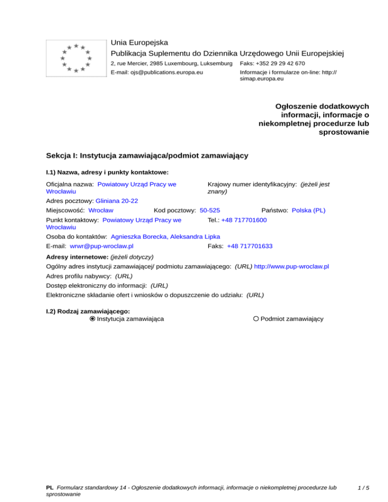 Unia Europejska Publikacja Suplementu do Dziennika Urzędowego Unii Europejskiej 2, rue Mercier, 2985 Luxembourg, Luksemburg Faks: +352 29 29 42 670 E-mail: [email protected] Informacje i formularze on-line: http:// simap.europa.eu Ogłoszenie dodatkowych informacji, informacje o niekompletnej procedurze lub sprostowanie Sekcja I: Instytucja zamawiająca/podmiot zamawiający I.1) Nazwa, adresy i punkty kontaktowe: Oficjalna nazwa: Powiatowy Urząd Pracy we Wrocławiu Krajowy numer identyfikacyjny: (jeżeli jest znany) _____ Adres pocztowy: Gliniana 20-22 Miejscowość: Wrocław Kod pocztowy: 50-525 Punkt kontaktowy: Powiatowy Urząd Pracy we Wrocławiu Państwo: Polska (PL) Tel.: +48 717701600 Osoba do kontaktów: Agnieszka Borecka, Aleksandra Lipka E-mail: [email protected] Faks: +48 717701633 Adresy internetowe: (jeżeli dotyczy) Ogólny adres instytucji zamawiającej/ podmiotu zamawiającego: (URL) http://www.pup-wroclaw.pl Adres profilu nabywcy: (URL) _____ Dostęp elektroniczny do informacji: (URL) _____ Elektroniczne składanie ofert i wniosków o dopuszczenie do udziału: (URL) _____ I.2) Rodzaj zamawiającego: Instytucja zamawiająca Podmiot zamawiający PL Formularz standardowy 14 - Ogłoszenie dodatkowych informacji, informacje o niekompletnej procedurze lub sprostowanie 1/5 Sekcja II: Przedmiot zamówienia II.1.1) Nazwa nadana zamówieniu: Szkolenia grupowe dla osób bezrobotnych II.1.2) Krótki opis zamówienia lub zakupu: (podano w pierwotnym ogłoszeniu) Szkolenia grupowe dla osób bezrobotnych z tematów: 1. Programowanie w języku Java + 4-tygodniowa praktyka u pracodawców (w pełnym wymiarze czasu pracy) 2. Programowanie w języku .Net i C# wraz z 4-tygodniową praktyką u pracodawcy (w pełnym wymiarze czasu pracy) 3. Programowanie w języku C++ i 4-tygodniowa praktyka u pracodawcy (w pełnym wymiarze czasu pracy) II.1.3) Wspólny Słownik Zamówień (CPV) Główny przedmiot Słownik główny 80400000 Słownik uzupełniający (jeżeli dotyczy) PL Formularz standardowy 14 - Ogłoszenie dodatkowych informacji, informacje o niekompletnej procedurze lub sprostowanie 2/5 Sekcja IV: Procedura IV.1)Rodzaj procedury (podano w pierwotnym ogłoszeniu) Otwarta Ograniczona Ograniczona przyspieszona Negocjacyjna Negocjacyjna przyspieszona Dialog konkurencyjny Negocjacyjna z uprzednim ogłoszeniem Negocjacyjna bez uprzedniego ogłoszenia Negocjacyjna z publikacją ogłoszenia o zamówieniu Negocjacyjna bez publikacji ogłoszenia o zamówieniu Udzielenie zamówienia bez uprzedniej publikacji ogłoszenia o zamówieniu w Dzienniku Urzędowym Unii Europejskiej IV.2)Informacje administracyjne IV.2.1)Numer referencyjny: (podano w pierwotnym ogłoszeniu) ZP/RS/3213-1/14 IV.2.2)Dane referencyjne ogłoszenia w przypadku ogłoszeń przesłanych drogą elektroniczną: Pierwotne ogłoszenie przesłane przez eNotices TED eSender Login: ENOTICES_PUPWR Dane referencyjne ogłoszenia: 2014-004328 rok i numer dokumentu IV.2.3)Ogłoszenie, którego dotyczy niniejsza publikacja: Numer ogłoszenia w Dz.U.: 2014/S 009-011650 z dnia: 14/01/2014 (dd/mm/rrrr) IV.2.4)Data wysłania pierwotnego ogłoszenia: 10/01/2014 (dd/mm/rrrr) PL Formularz standardowy 14 - Ogłoszenie dodatkowych informacji, informacje o niekompletnej procedurze lub sprostowanie 3/5 Sekcja VI: Informacje uzupełniające VI.1) Ogłoszenie dotyczy: Procedury niepełnej Sprostowania Informacji dodatkowych VI.2) Informacje na temat niepełnej procedury udzielenia zamówienia: Postępowanie o udzielenie zamówienia zostało przerwane Postępowanie o udzielenie zamówienia uznano za nieskuteczne Zamówienia nie udzielono Zamówienie może być przedmiotem ponownej publikacji VI.3) Informacje do poprawienia lub dodania : VI.3.1) Zmiana oryginalnej informacji podanej przez instytucję zamawiającą Publikacja w witrynie TED niezgodna z oryginalną informacją, przekazaną przez instytucję zamawiającą Oba przypadki VI.3.2) W ogłoszeniu pierwotnym W odpowiedniej dokumentacji przetargowej (więcej informacji w odpowiedniej dokumentacji przetargowej) W obu przypadkach (więcej informacji w odpowiedniej dokumentacji przetargowej) VI.3.3) Tekst, który należy poprawić w pierwotnym ogłoszeniu Miejsce, w którym znajduje się Zamiast: Powinno być: zmieniany tekst: Szkolenie skierowane jest do osób Szkolenie skierowane jest do osób Załącznik B Informacje o częściach bezrobotnych zarejestrowanych bezrobotnych zarejestrowanych zamówienia pkt 1 w części nr 1, 2, 3 w Powiatowym Urzędzie Pracy w Powiatowym Urzędzie Pracy we Wrocławiu, z wykształceniem we Wrocławiu, z wykształceniem wyższym, głównie po kierunkach z wyższym, głównie po kierunkach rozszerzonym programem nauczania z rozszerzonym programem matematyki, ze znajomością nauczania matematyki, ze języka angielskiego (w mowie i znajomością języka angielskiego piśmie), które zostaną skierowane (w mowie i piśmie), które na kurs przez Zamawiającego, zostaną skierowane na kurs po przeprowadzeniu naboru w przez Zamawiającego, po porozumieniu z pracodawcami z przeprowadzeniu naboru w branży IT/ICT, którzy zgłosili oferty porozumieniu z pracodawcami pracy do tut. Urzędu. z branży IT/ICT. VI.3.4) Daty, które należy poprawić w pierwotnym ogłoszeniu Miejsce, w którym znajdują się Zamiast: zmieniane daty: 03/02/2014 Godzina: 10:00 IV.3.4 (dd/mm/rrrr) Powinno być: 13/02/2014 Godzina: 08:30 (dd/mm/rrrr) Miejsce, w którym znajdują się zmieniane daty: IV.3.8 Powinno być: 13/02/2014 Godzina: 08:45 (dd/mm/rrrr) Zamiast: 03/02/2014 Godzina: 10:15 (dd/mm/rrrr) VI.3.5) Adresy i punkty kontaktowe, które należy poprawić PL Formularz standardowy 14 - Ogłoszenie dodatkowych informacji, informacje o niekompletnej procedurze lub sprostowanie 4/5 VI.3.6) Tekst, który należy dodać do pierwotnego ogłoszenia Miejsce, w którym należy dodać tekst: Tekst do dodania: VI.4) Inne dodatkowe informacje: _____ VI.5) Data wysłania niniejszego ogłoszenia: 29/01/2014 (dd/mm/