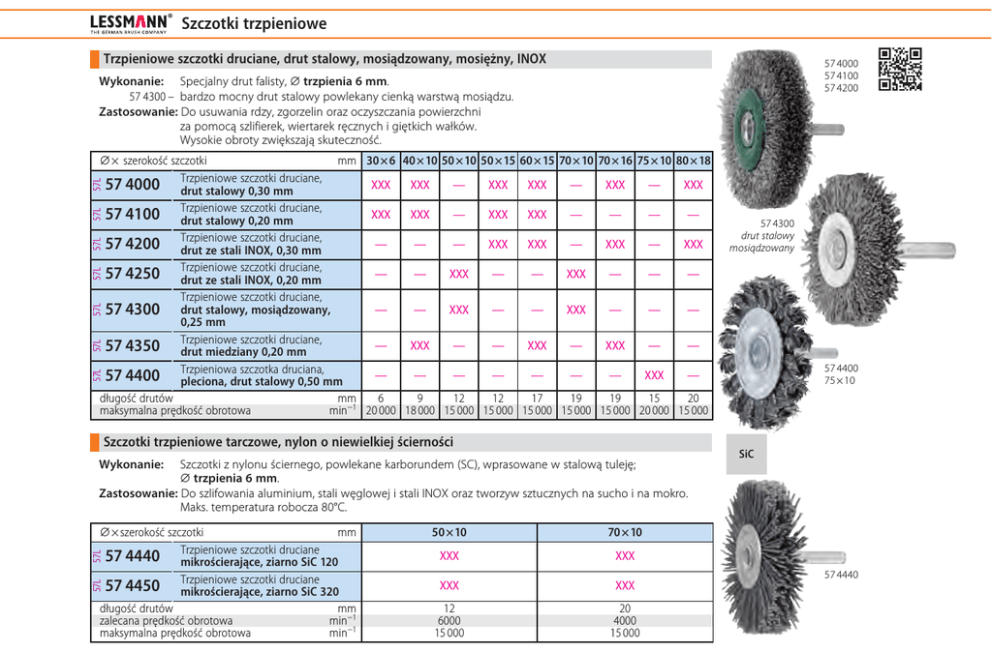 Szczotki trzpieniowe Trzpieniowe szczotki druciane, drut stalowy, mosiądzowany, mosiężny, INOX 57 4000 57 4100 57 4200 Wykonanie: Specjalny drut falisty, ⌀ trzpienia 6 mm. 57 4300 – bardzo mocny drut stalowy powlekany cienką warstwą mosiądzu. Zastosowanie: Do usuwania rdzy, zgorzelin oraz oczyszczania powierzchni za pomocą szlifierek, wiertarek ręcznych i giętkich wałków. Wysokie obroty zwiększają skuteczność. 57L — XXX XXX — XXX — XXX 57L — XXX XXX — — — — 57L — XXX XXX — XXX — XXX 57L XXX — — XXX — — — 57L XXX — — XXX — — — 57L 50×10 50×15 60×15 70×10 70×16 75×10 80×18 — — XXX — XXX — — 57L ⌀× szerokość szczotki mm 30×6 40×10 szczotki druciane, XXX XXX 57 4000 Trzpieniowe drut stalowy 0,30 mm szczotki druciane, XXX XXX 57 4100 Trzpieniowe drut stalowy 0,20 mm szczotki druciane, — — 57 4200 Trzpieniowe drut ze stali INOX, 0,30 mm Trzpieniowe szczotki druciane, — — 57 4250 drut ze stali INOX, 0,20 mm Trzpieniowe szczotki druciane, — — 57 4300 drut stalowy, mosiądzowany, 0,25 mm szczotki druciane, — XXX 57 4350 Trzpieniowe drut miedziany 0,20 mm Trzpieniowa szczotka druciana, — — 57 4400 pleciona, drut stalowy 0,50 mm długość drutów mm 6 9 maksymalna prędkość obrotowa min−1 20 000 18 000 — — — — — XXX — 57 4400 75×10 12 12 17 19 19 15 20 15 000 15 000 15 000 15 000 15 000 20 000 15 000 Szczotki trzpieniowe tarczowe, nylon o niewielkiej ścierności Wykonanie: Szczotki z nylonu ściernego, powlekane karborundem (SC), wprasowane w stalową tuleję; ⌀ trzpienia 6 mm. Zastosowanie: Do szlifowania aluminium, stali węglowej i stali INOX oraz tworzyw sztucznych na sucho i na mokro. Maks. temperatura robocza 80°C. 50×10 70×10 57L XXX XXX 57L ⌀×szerokość szczotki mm Trzpieniowe szczotki druciane 57 4440 mikrościerające, ziarno SiC 120 szczotki druciane 57 4450 Trzpieniowe mikrościerające, ziarno SiC 320 długość drutów mm zalecana prędkość obrotowa min−1 maksymalna prędkość obrotowa min−1 57 4300 drut stalowy mosiądzowany XXX XXX 12 6000 15 000 20 4000 15 000 SiC 57 4440